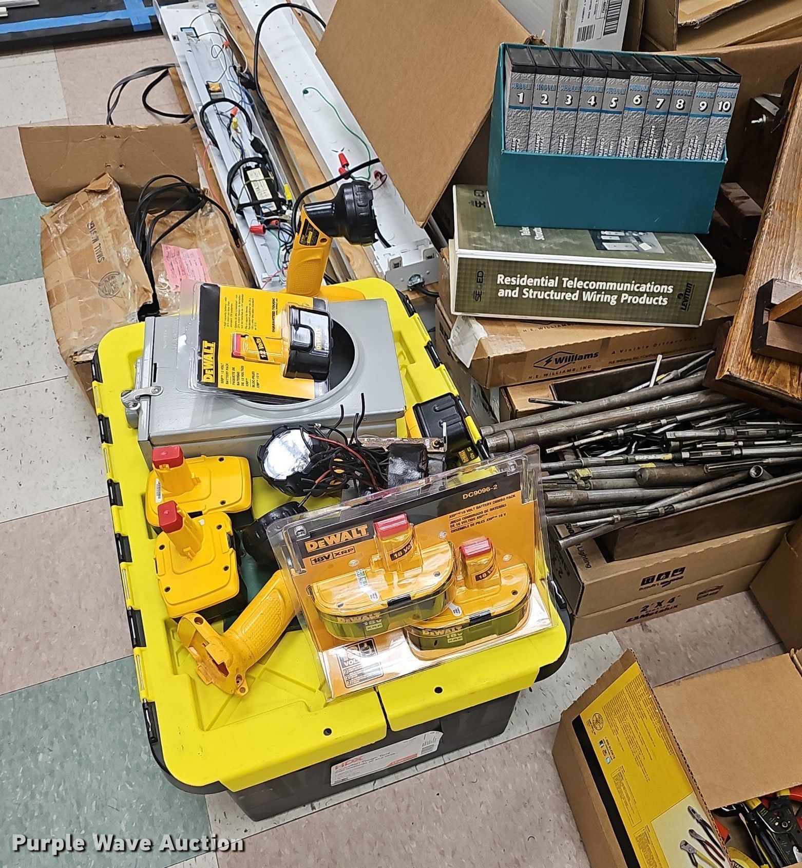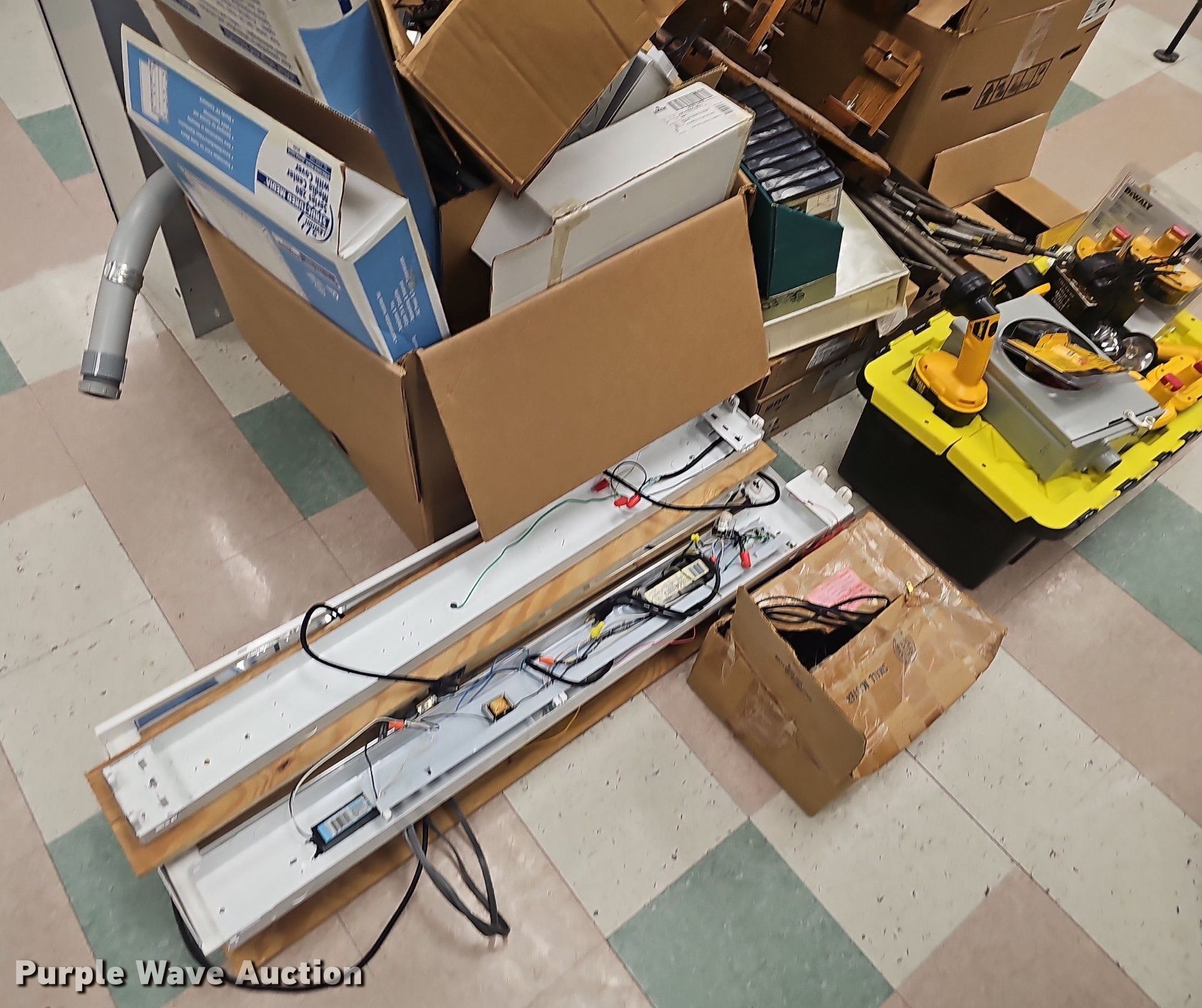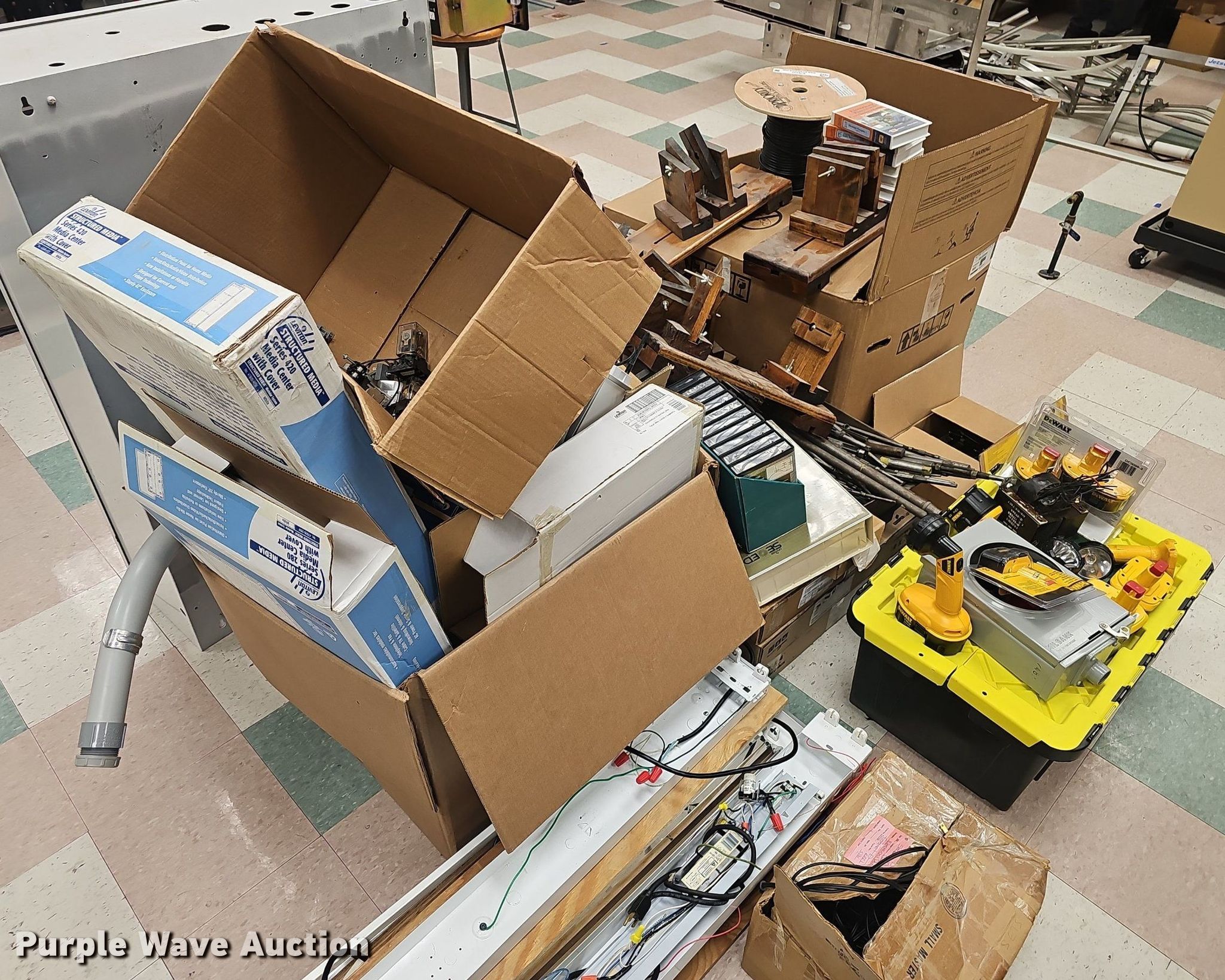 Purple Wave is selling a used Electronics in Kansas. This item is a Electronics with the following: Batteries, Wire, VHS tapes, Wood vise, Lights, Electric panel