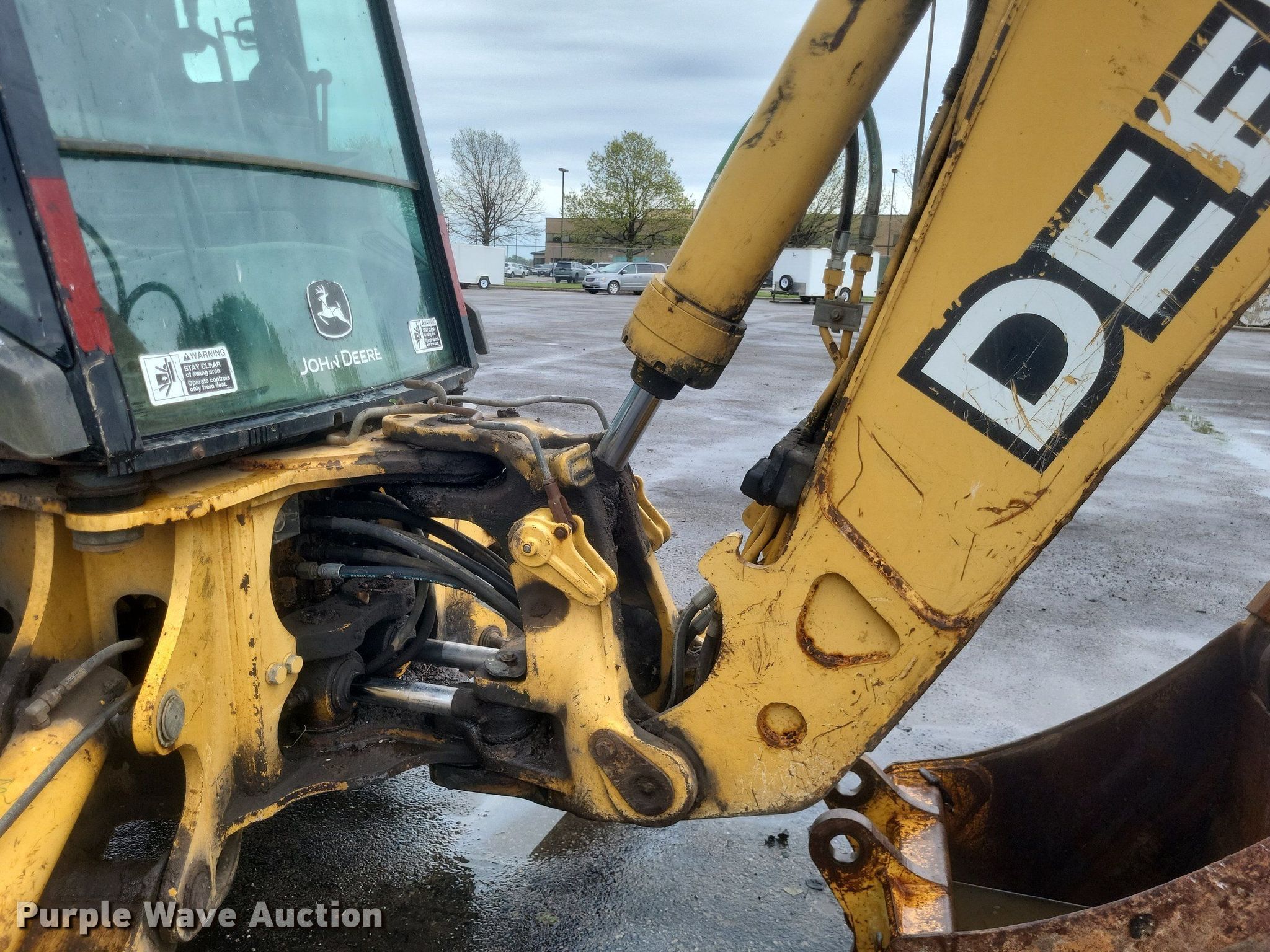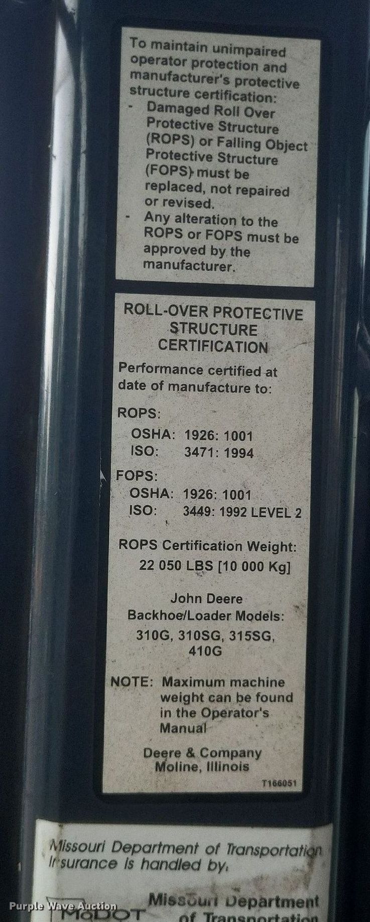 2007 John Deere 310SG backhoe. Hours: 5,197 on meter, Serial: T0310SG961649, Unit #: 06103. Engine John Deere 4045T, Displacement: 4.524L, Cylinders: 4, Fuel type: Diesel. Transmission Powershift, 4F - 4R. Chassis Four wheel drive, Differential lock. Operators station Enclosed cab, AC, heat, Backhoe controls: Wobble stick / two stick. Features Loader Bucket Width: 91", Cutting edge: Bolt-on, Backhoe Thumb: Manual, Bucket Width: 35", Cutting edge: Bolt-on, Bucket Width: 24", Cutting edge: Weld-on, Teeth: 5. Tires Front: 12.5/80-18, Rear: 19.5LR24. Notes Parking brake alarm on, Transmission issues, Non-operational first gear. Missouri Dept. of Transportation - Southeast District. Sikeston, MO 63801