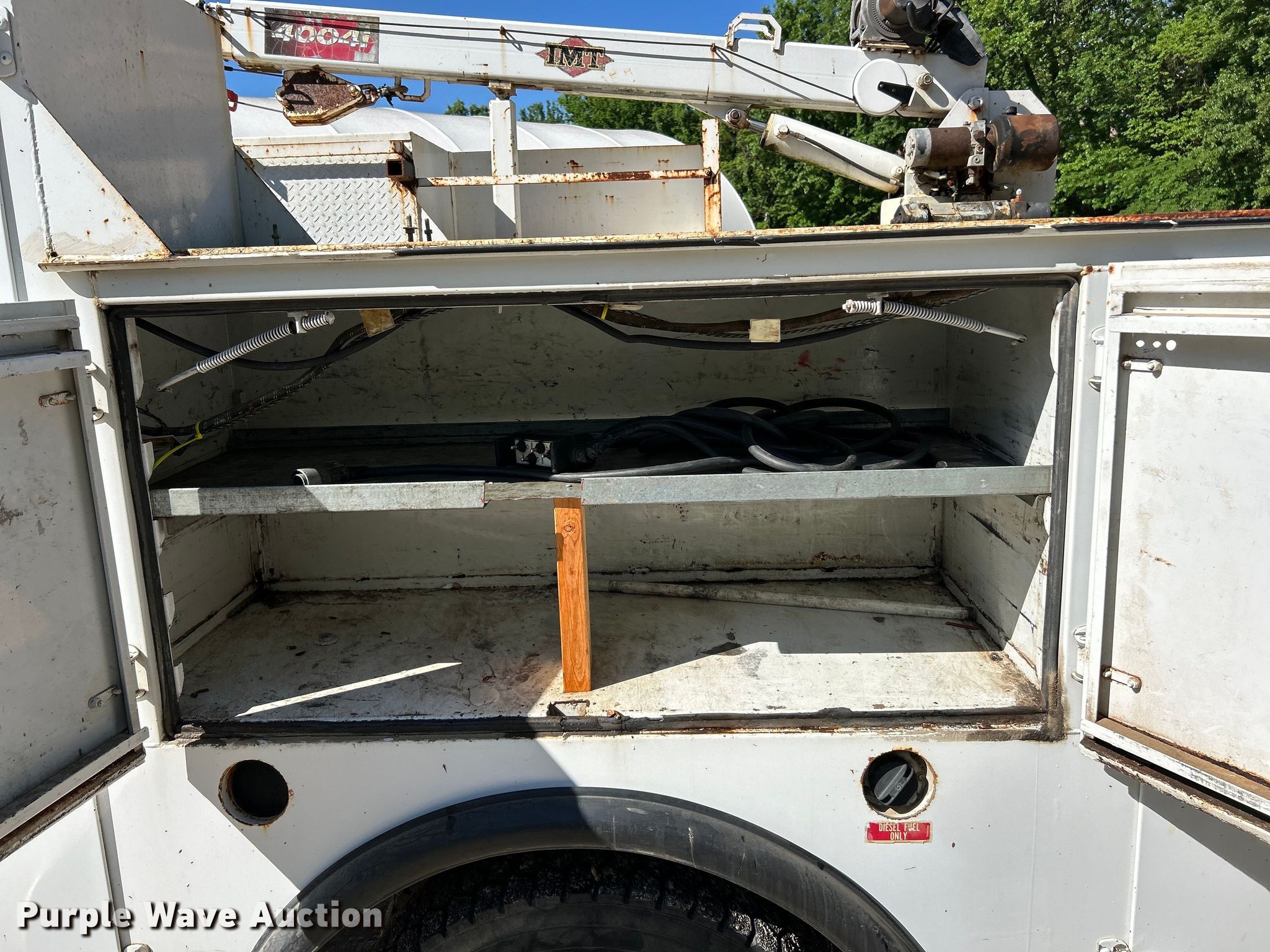 2005 Ford F450 Super Duty XL utility / service truck. Miles: 183,599 on odometer, VIN: 1FDXF47PX5EC29685. Engine Displacement: 6.0L V8 OHV, Cylinders: 8, Fuel type: Diesel. Transmission Automatic. Chassis Four wheel drive, Axles: Single, Suspension: Spring, Brakes: Hydraulic, GVWR: 16,000 lbs, Wheelbase: 165". Interior AC, Heat, Cruise control, Brake controller, Backup camera. Features Bed 11' L x 94" W, Crane IMT 4004i. Tires Size: 225/70R19.5. Notes Dash warning indicator: ABS, Dash warning indicator: Water in fuel. Missouri title. Title distribution may be delayed up to 14 days from verification of funds. City of Troy, MO. Troy, MO 63379