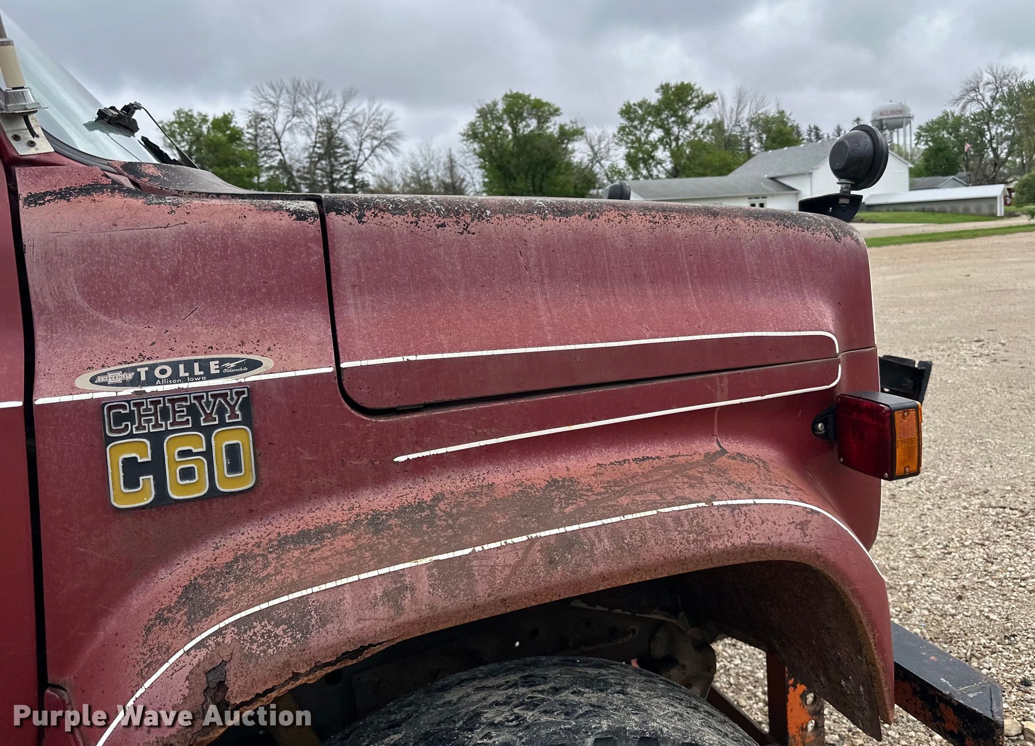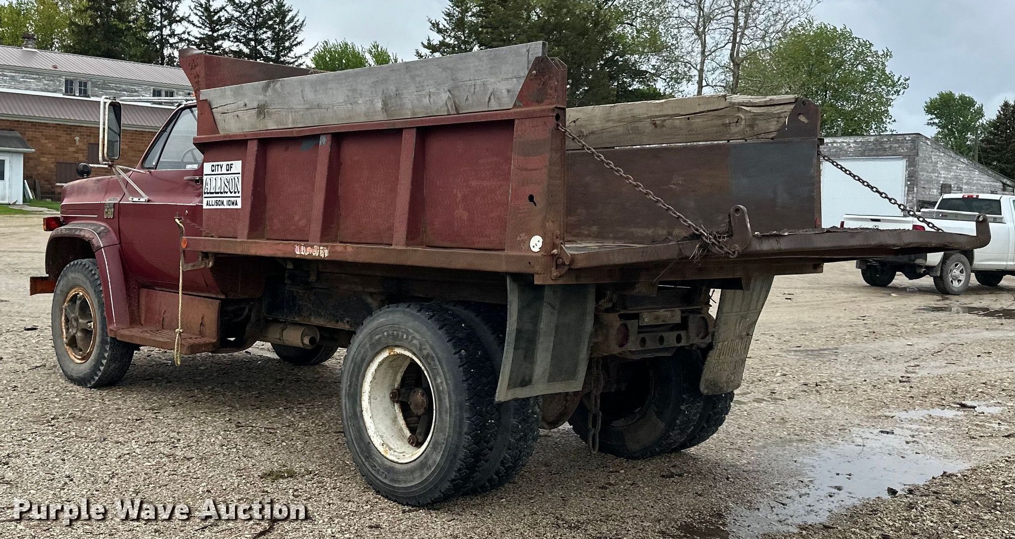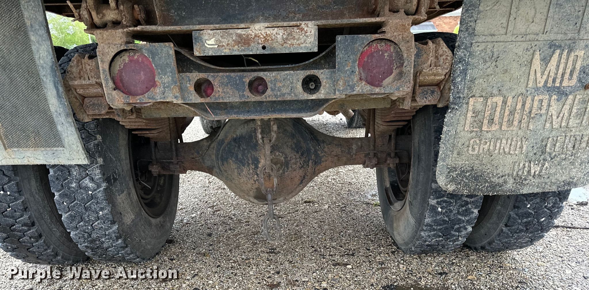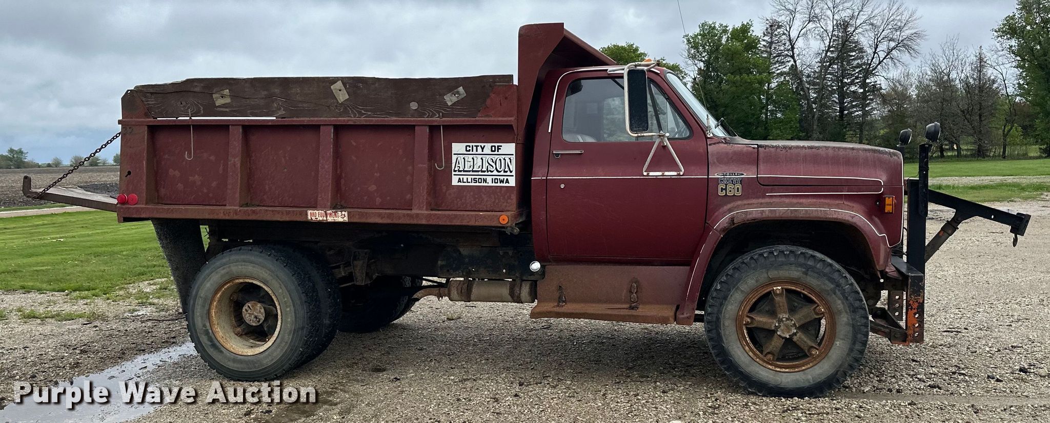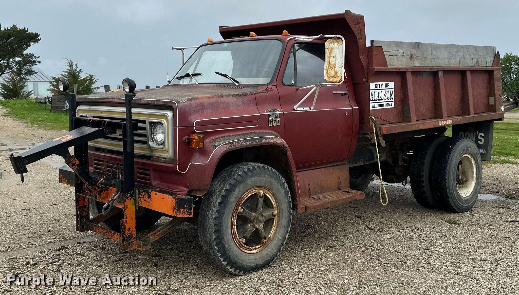 1975 Chevrolet C60 dump truck. Miles: 75,277 on odometer, VIN: CCE625V123166. Engine Cylinders: 8, Fuel type: Gas. Transmission Manual, Speed: 4, plus 2. Chassis Axles: Single, Suspension: Spring, Brakes: Hydraulic, PTO, GVWR: 22,000 lbs FAWR: 7,000 lbs, RAWR: 15,000 lbs. Interior Heat. Features Dump bed 10' L x 8' W, Side height: 29", Side board height: 11.5", Bed type: Steel, Ram: Single, End gate: Manual. Tires Size: 9.00R20. Iowa title. Title distribution may be delayed up to 14 days from verification of funds. City of Allison. 812 9th Street. Allison, IA 50602