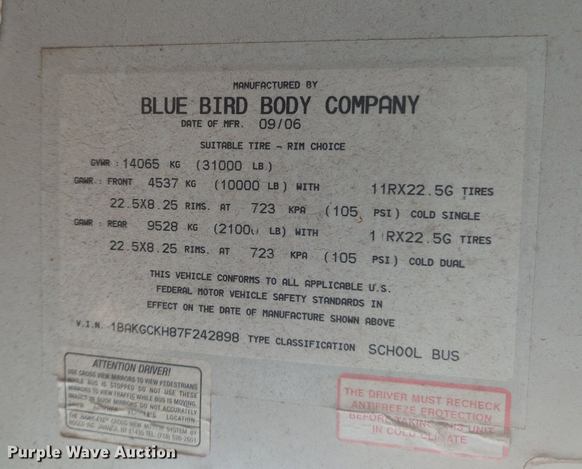 2007 Blue Bird school bus. Miles: 118,212 on odometer, VIN: 1BAKGCKH87F242898. Engine Caterpillar C7, Serial: WAX55682, Displacement: 7.2L, Cylinders: 6, Fuel type: Diesel, CNG. Transmission Automatic. Chassis Axles: Single, Suspension: Spring, Brakes: Hydraulic, GVWR: 31,000 lbs. Interior Heat, Heated mirrors, Cruise control, Passengers: 71, Adult seats: 22. Tires Size: 11R22.5. Notes Dead battery. Oklahoma title. Seller is a government entity who will be assigning and distributing the title. Please contact the seller for distribution questions. Title distribution may be delayed up to 14 days from verification of funds. Newcastle Public Schools. Newcastle, OK 73065