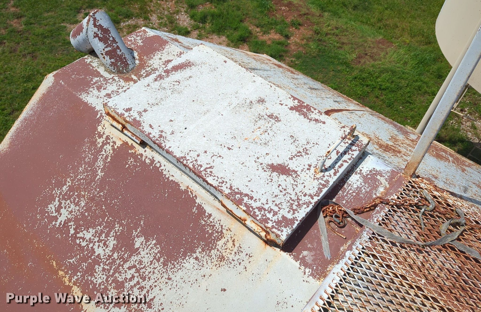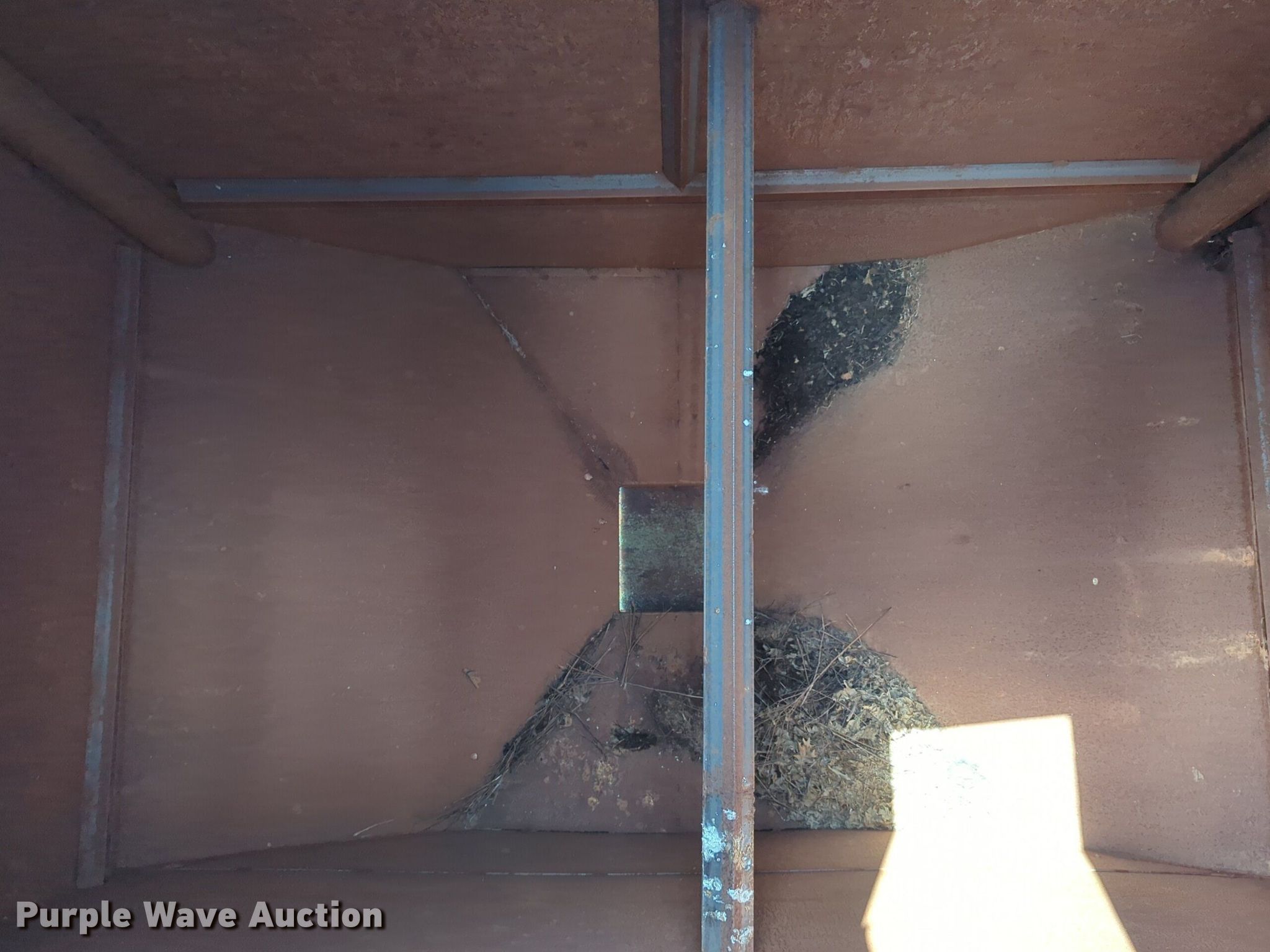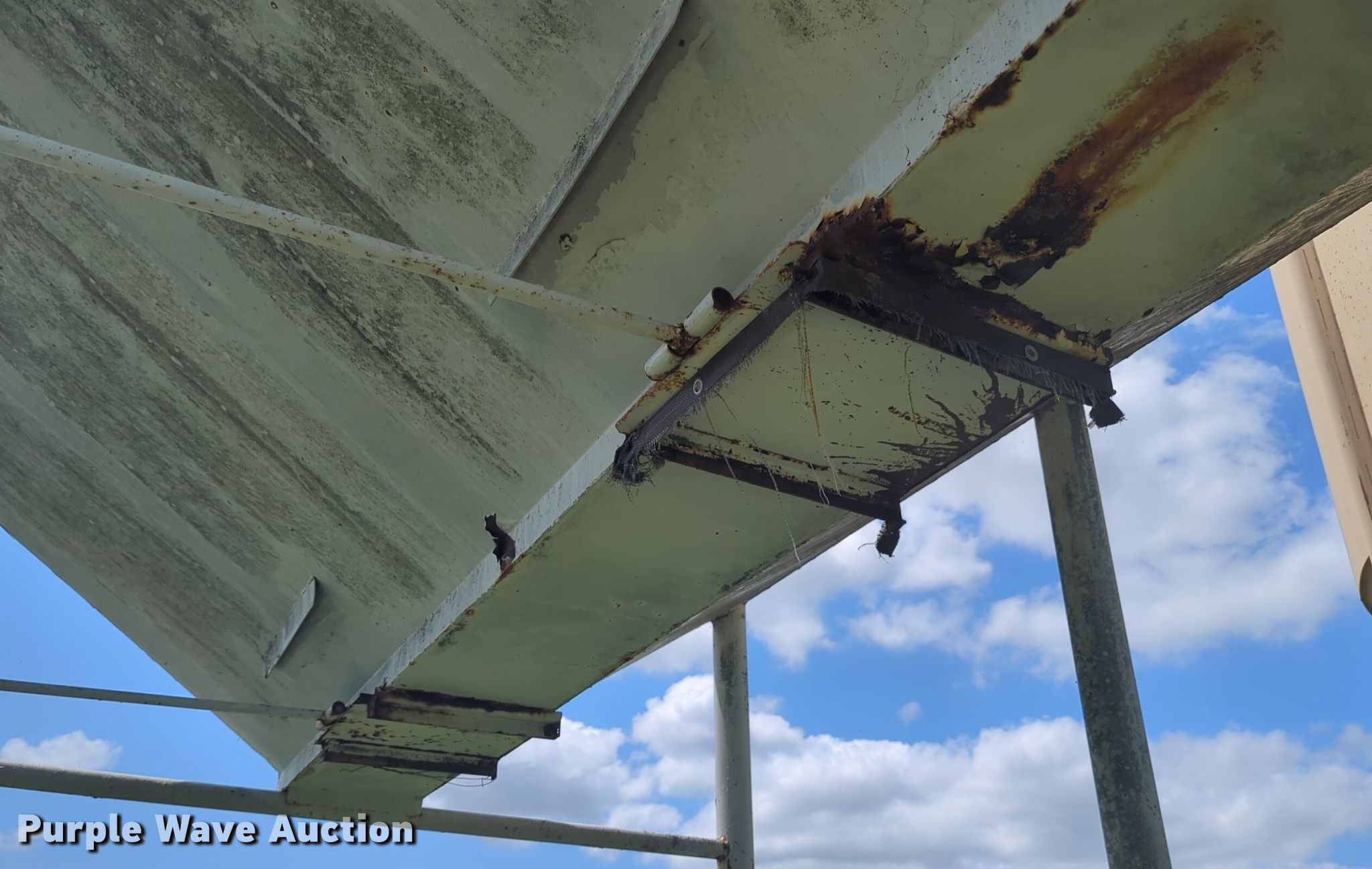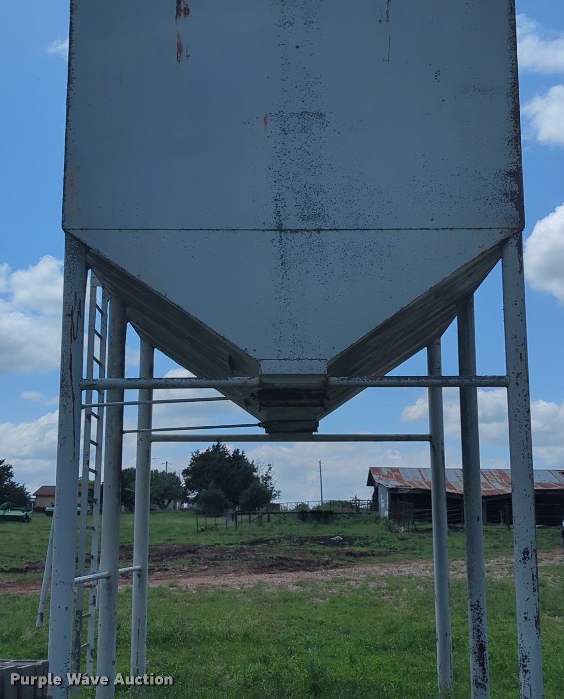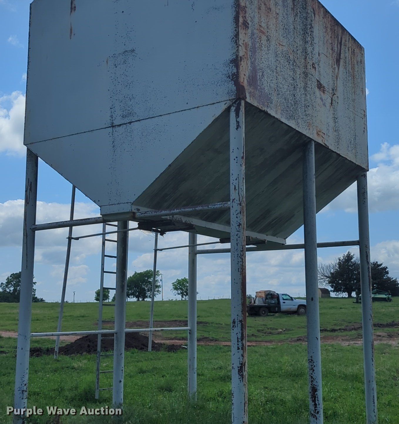Grain bin. Base dimensions: 12' L x 10' W. Features Compartments: 2, Total capacity: 22 tons Compartment capacity: 11 tons, Overhead drive-thru clearance: 96". Rocking Eagle Cattle Co. Retirement Auction. 9709 Oklahoma 29. Marlow, OK 73055