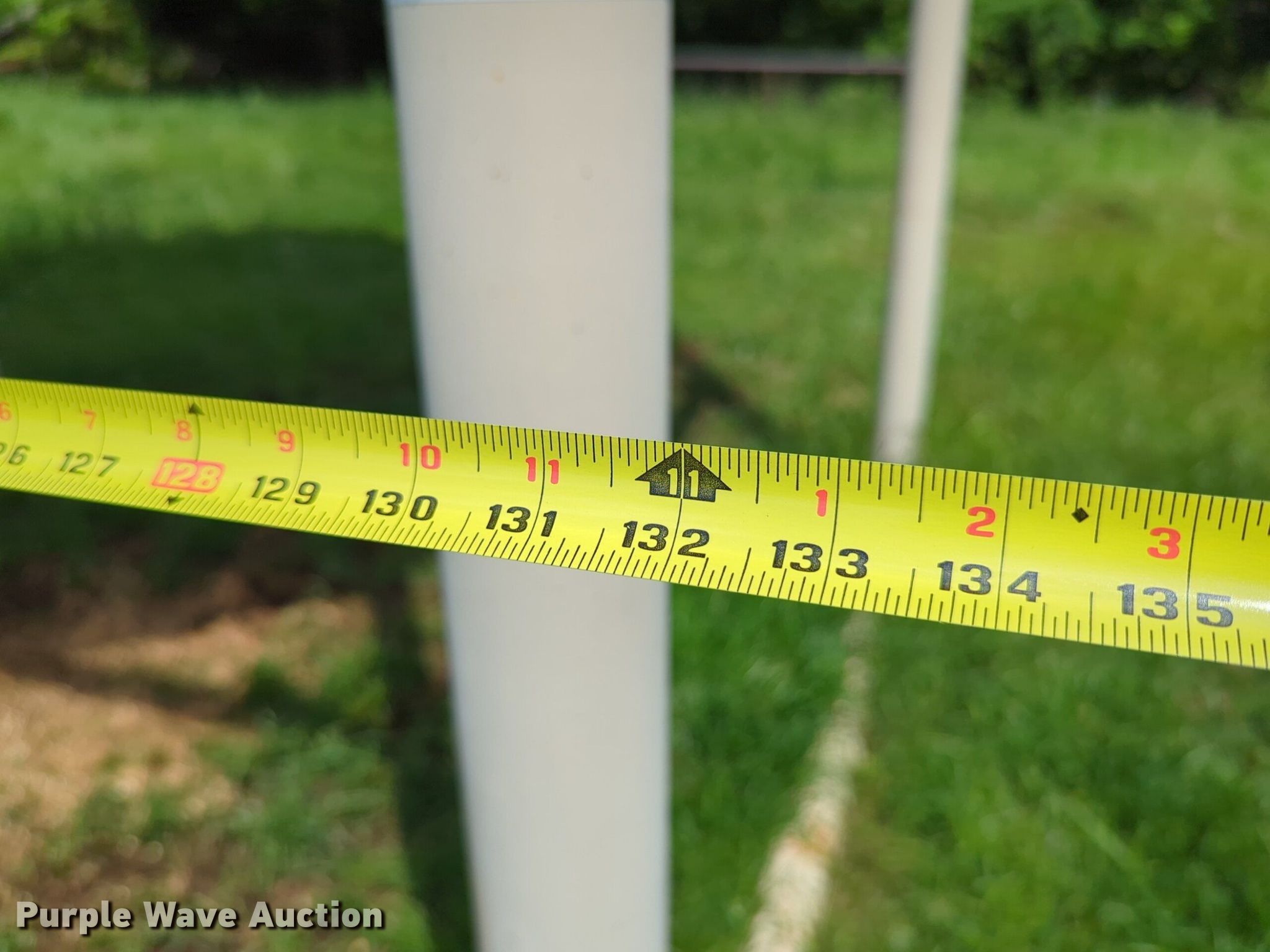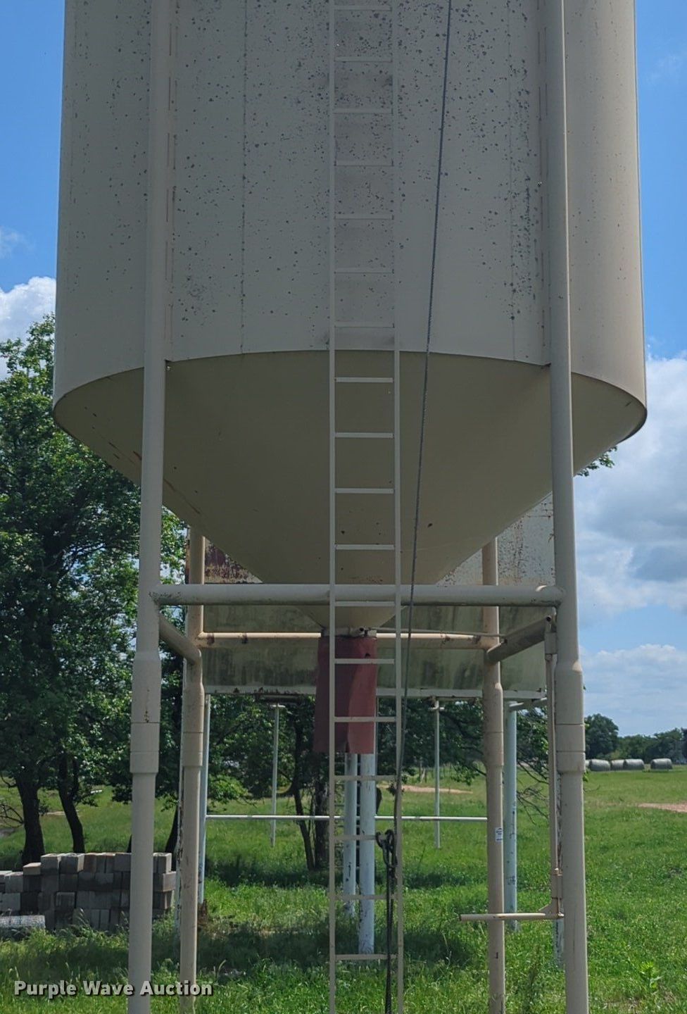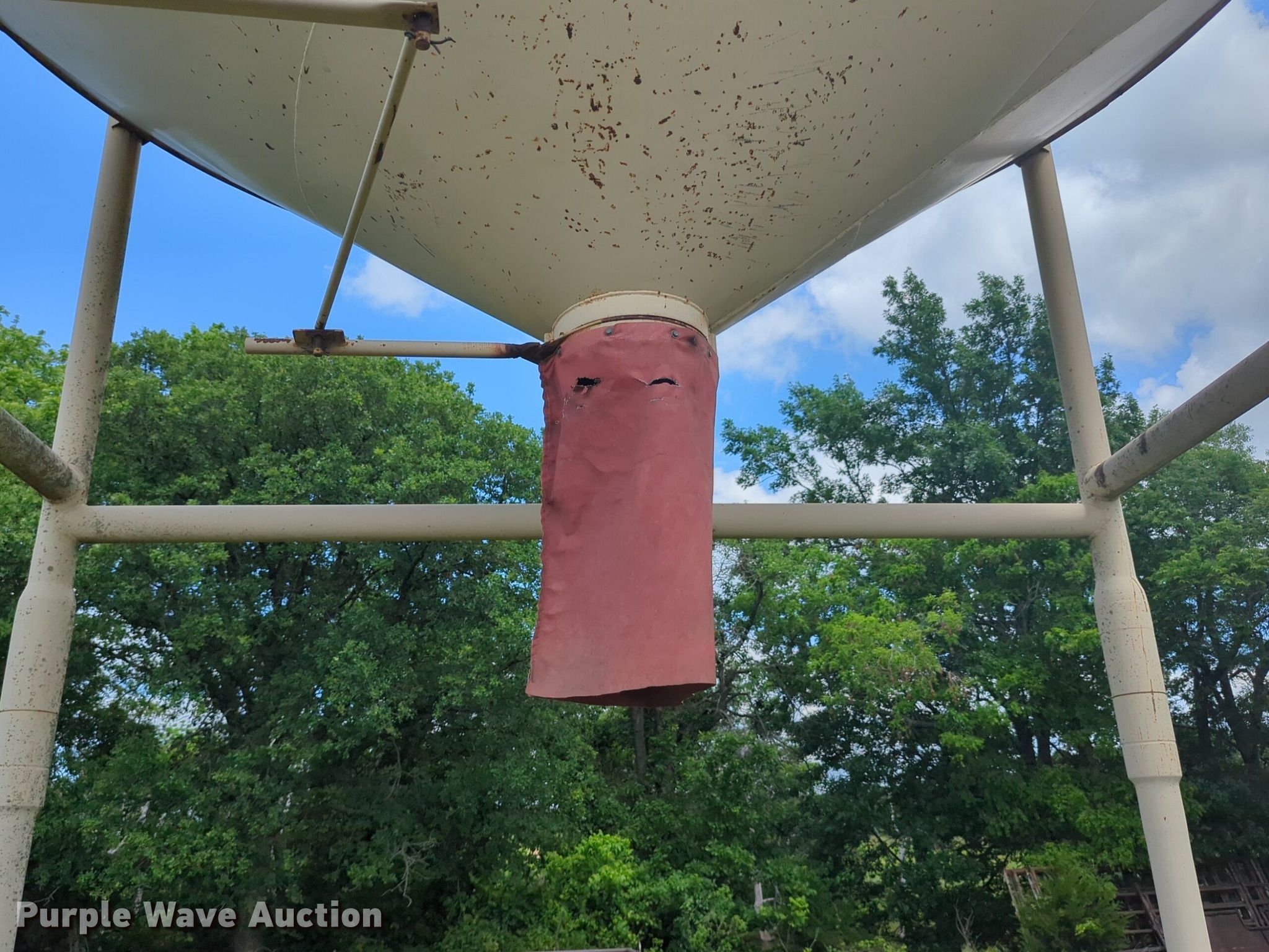 Dennis Mfg. grain bin. Base dimensions: 12'L x 11'W. Features Capacity: 30 tons, Overhead drive-thru clearance: 96". Rocking Eagle Cattle Co. Retirement Auction. 9709 Oklahoma 29. Marlow, OK 73055