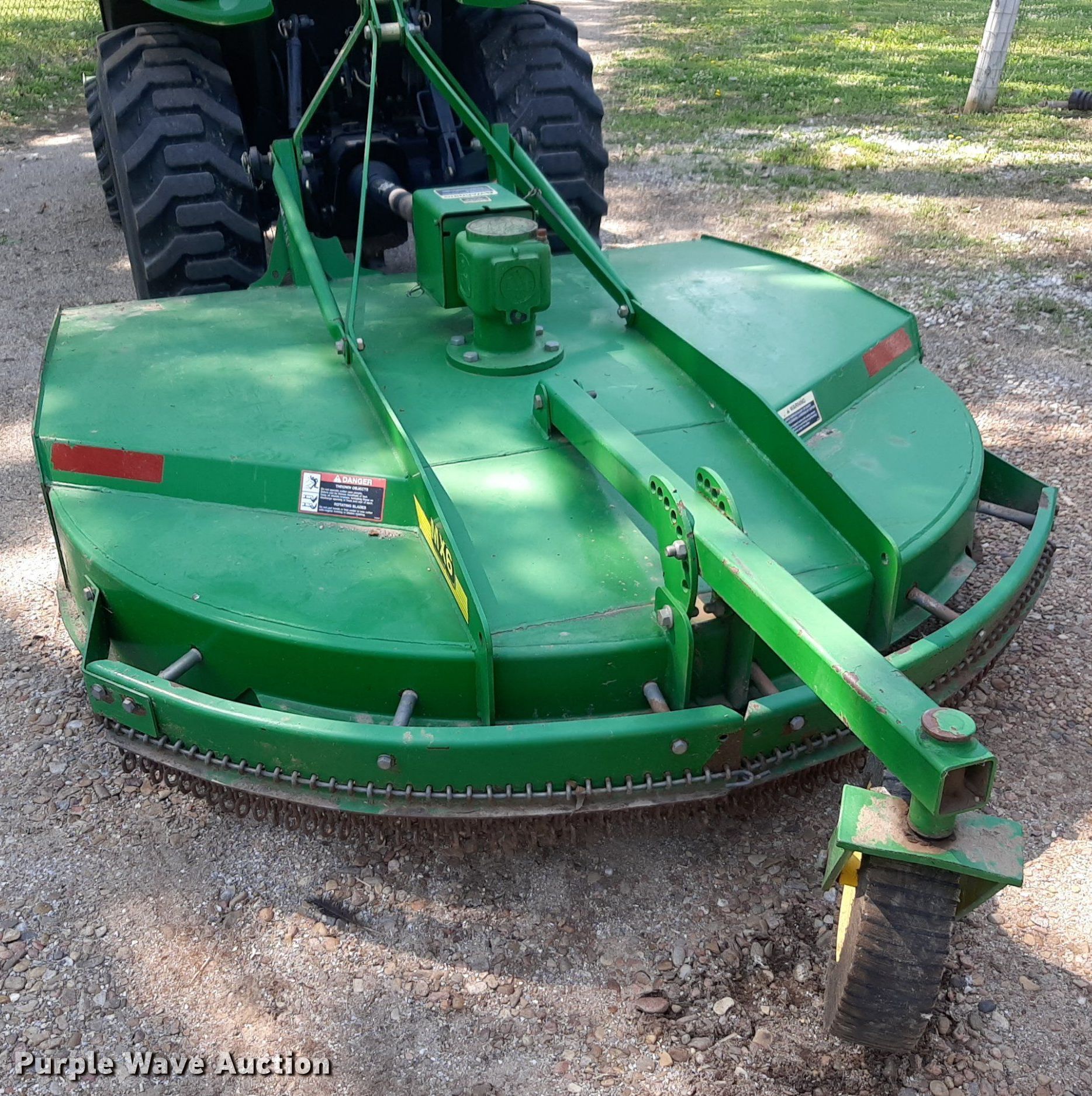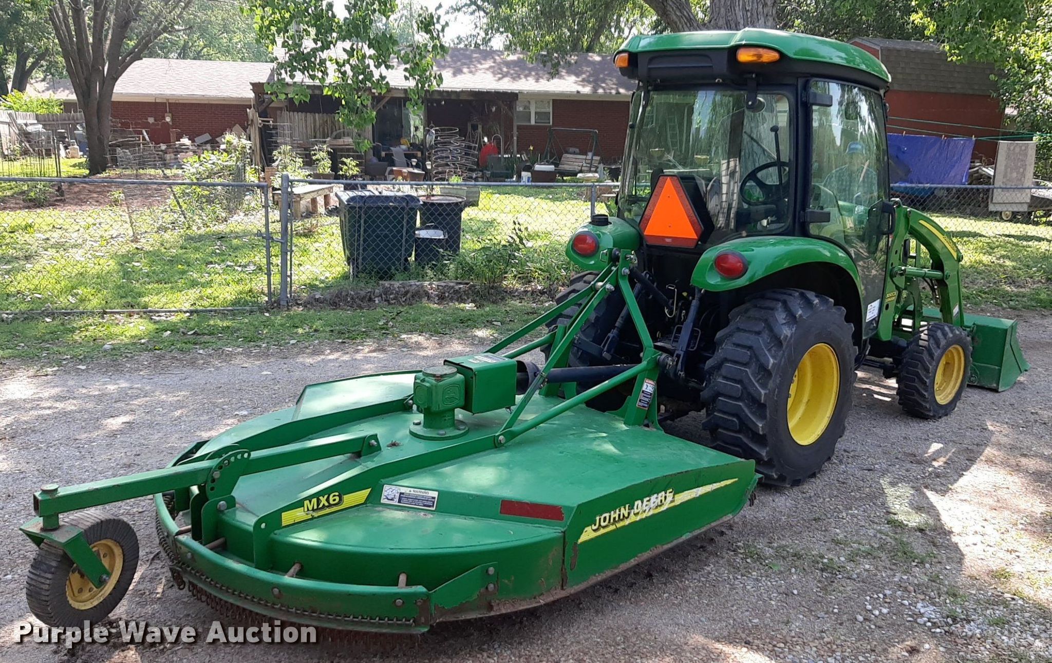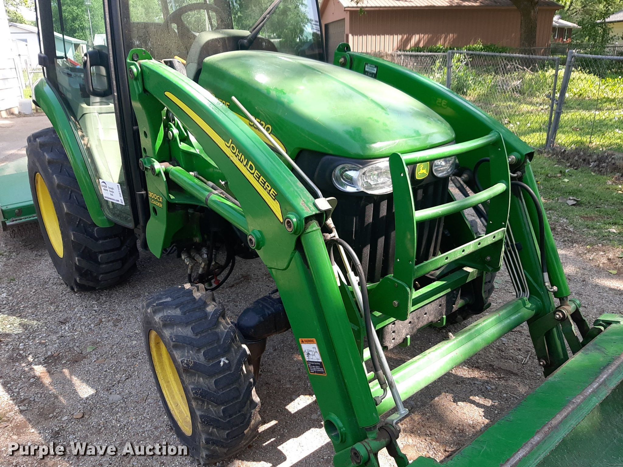 2007 John Deere 3520 MFWD tractor. Hours: 693 on meter, Serial: LV3520H358789. Engine Yanmar, Cylinders: 3, Fuel type: Diesel. Transmission Hydrostatic, Three speed travel. Operators station AC, Heat. Features PTO: 540, Three point Top link, Hydraulic remote sets Front: 2, Loader John Deere 300 CX, Controls: Two-lever, Bucket Width: 63", Rotary mower John Deere MX6, Width: 60". Tires Front: 25x8.50-14, Rear: 15-19.5. Clearwater, KS 67026