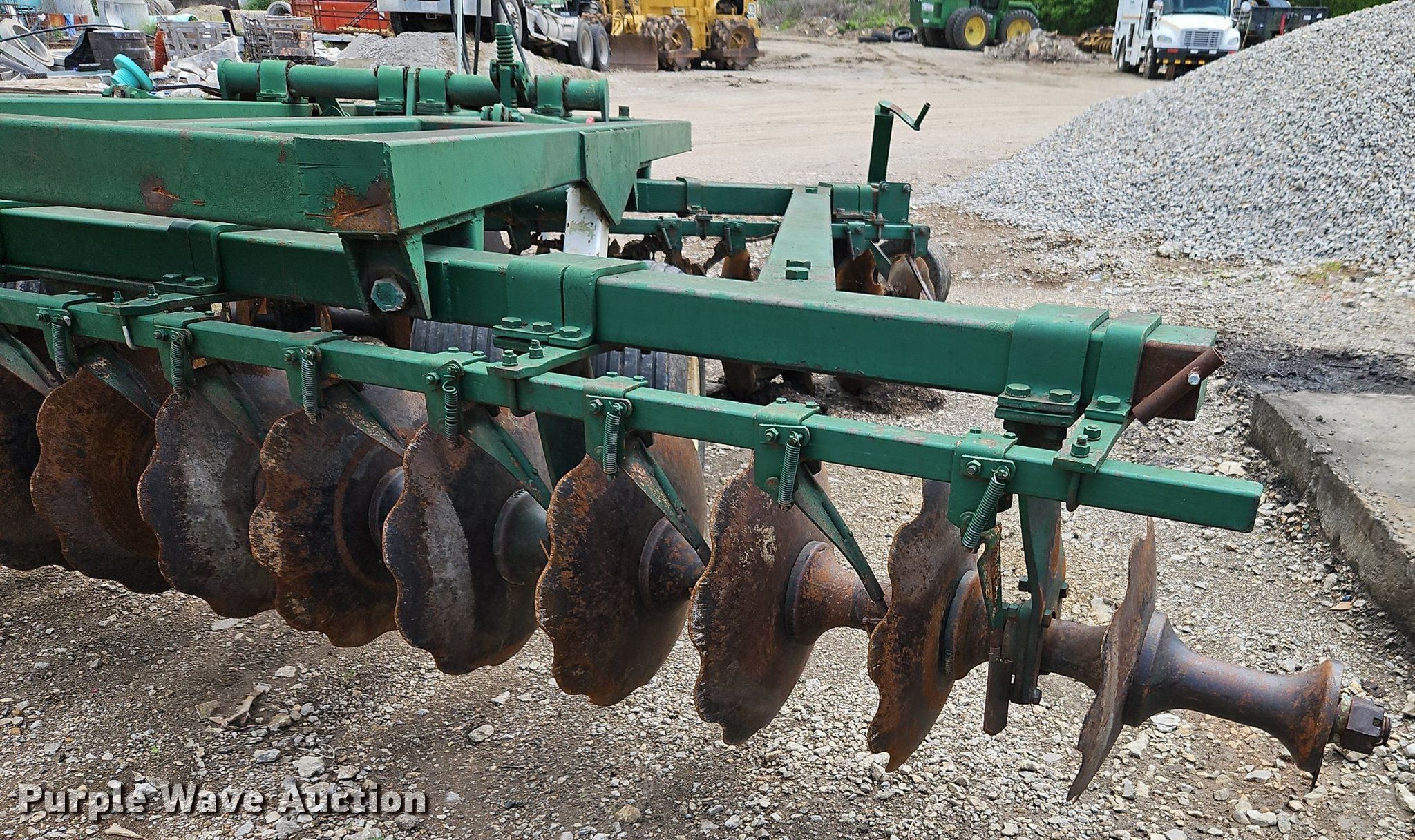 Crust Buster 14 H off-set disk. Overall width: 14', Unit #: 1568. Features Front blades Diameter: 24", Spacing: 9", Rear blades Diameter: 22", Spacing: 11", Disk scrapers, Operation Hydraulic lift. Tires Tire size: 9.5L-15. Larry Bair Excavating. Louisburg, KS 66053