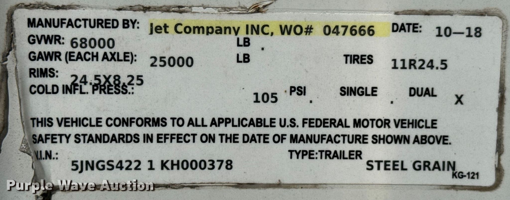 Purple Wave is selling a used Grain or Commodity Trailer in Oklahoma. This item is a 2019 JETCO KG-121 grain trailer with the following: VIN: 5JNGS4221KH000378