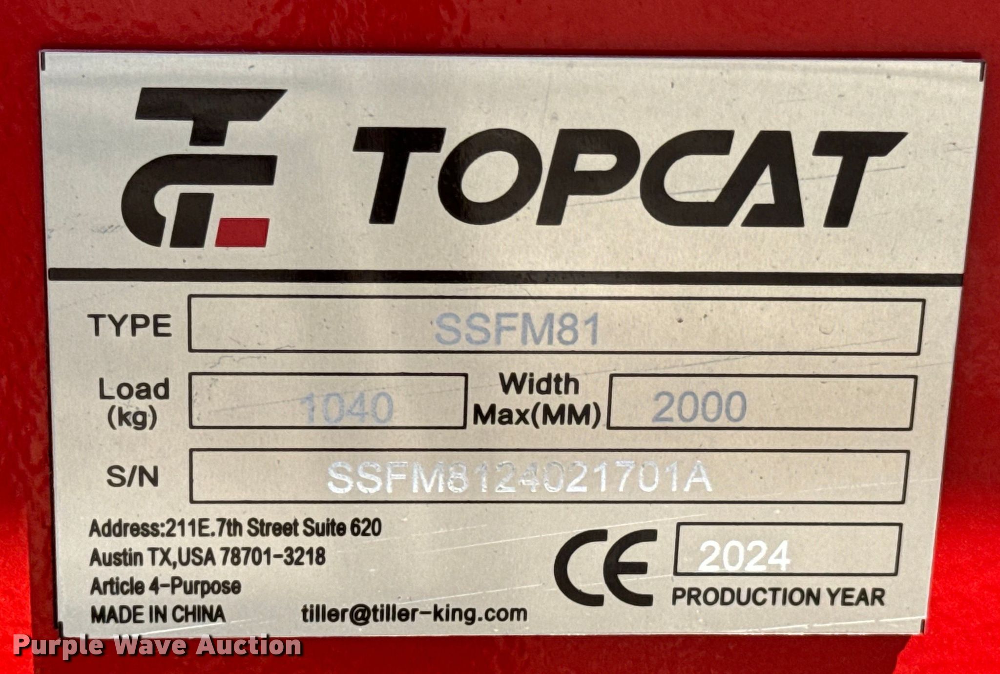 Purple Wave is selling a used Skid Steer Attach. in Oklahoma. This item is a 2024 TopCat SSFM81 skid steer mulcher with the following: Serial: SSFM8124021701A, Width: 60", Unused