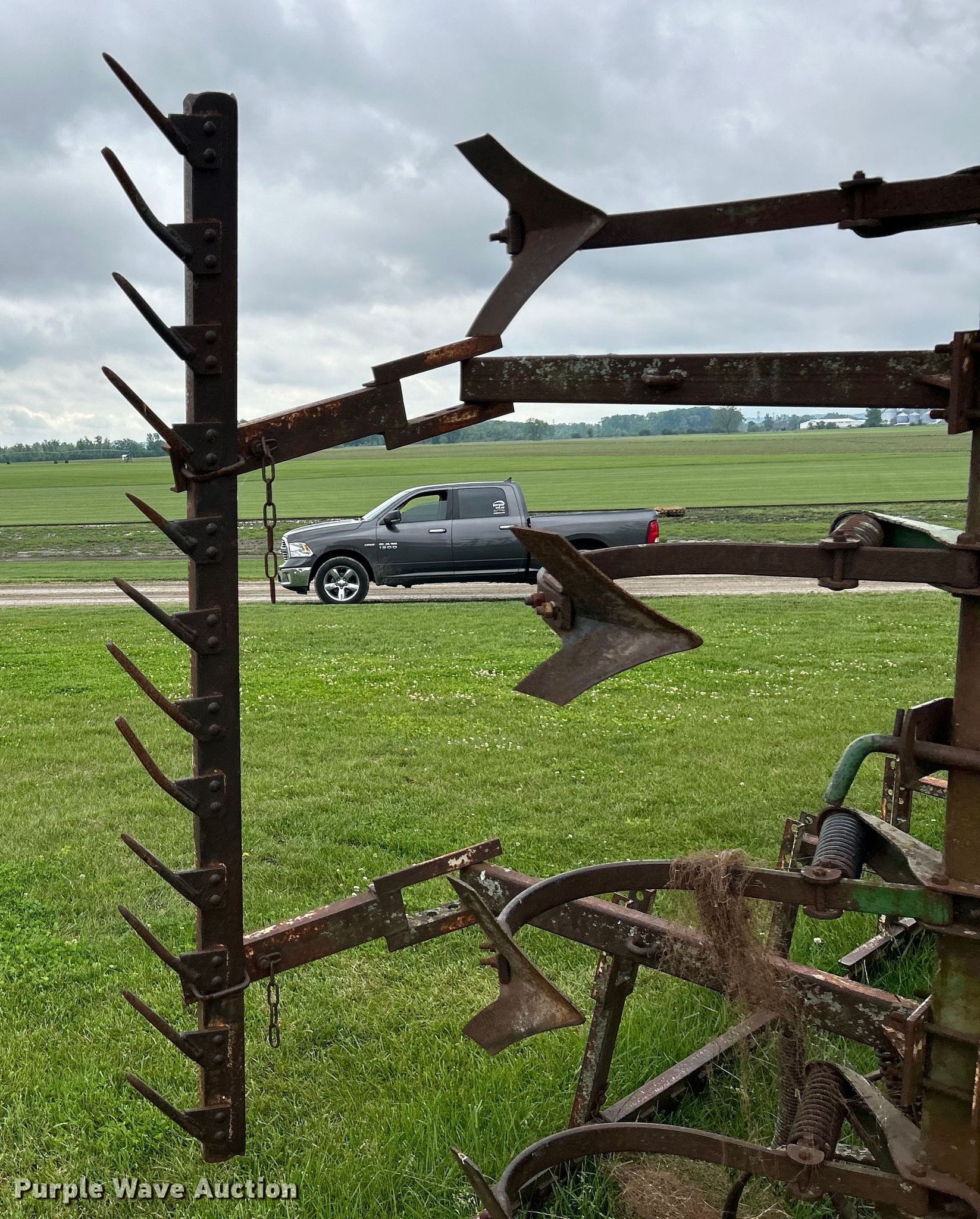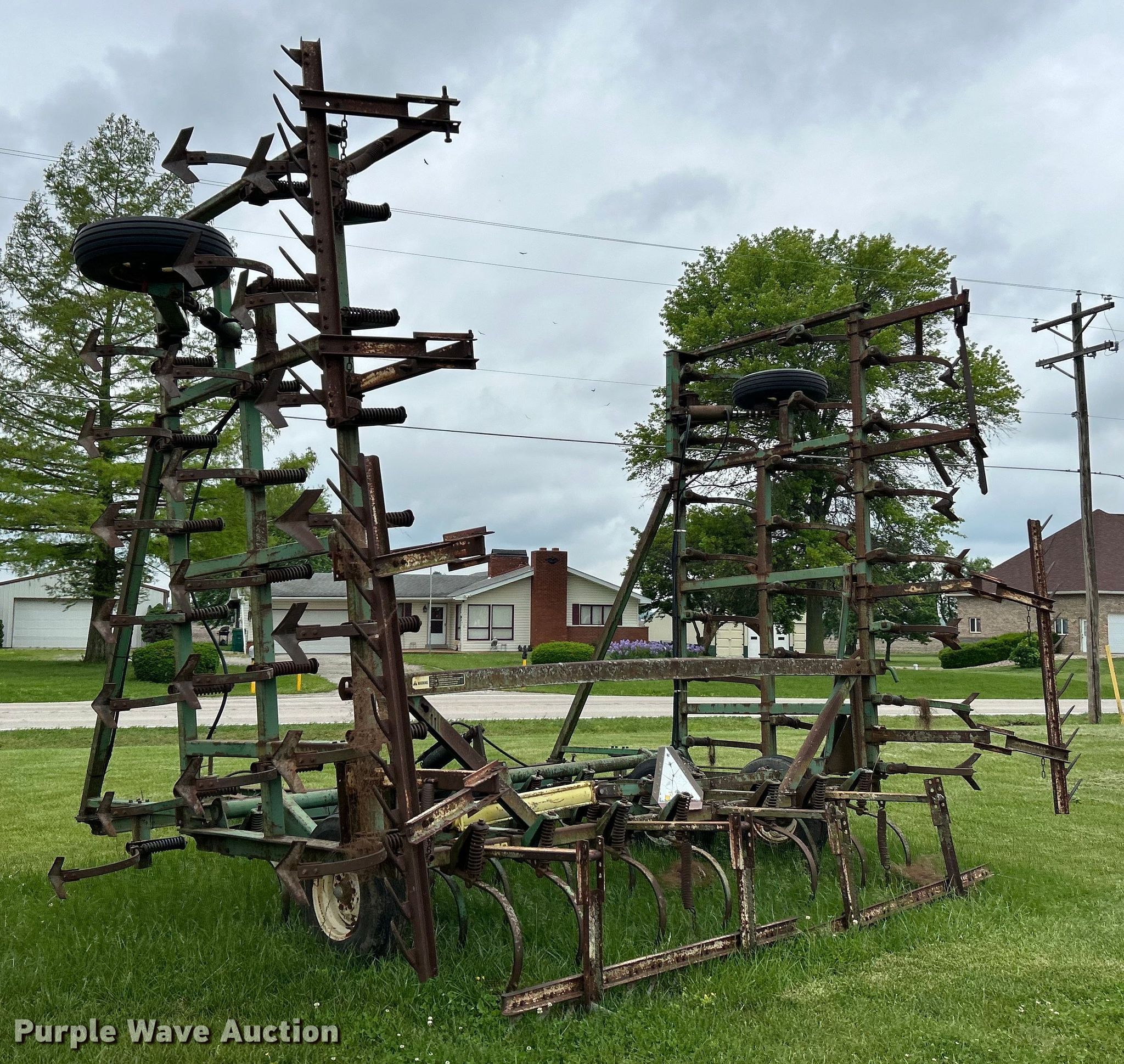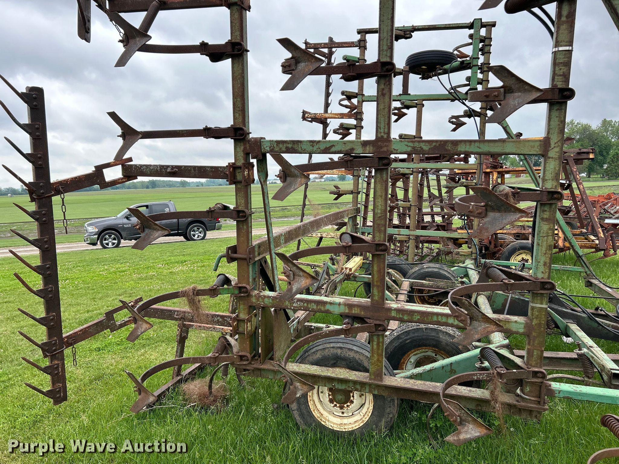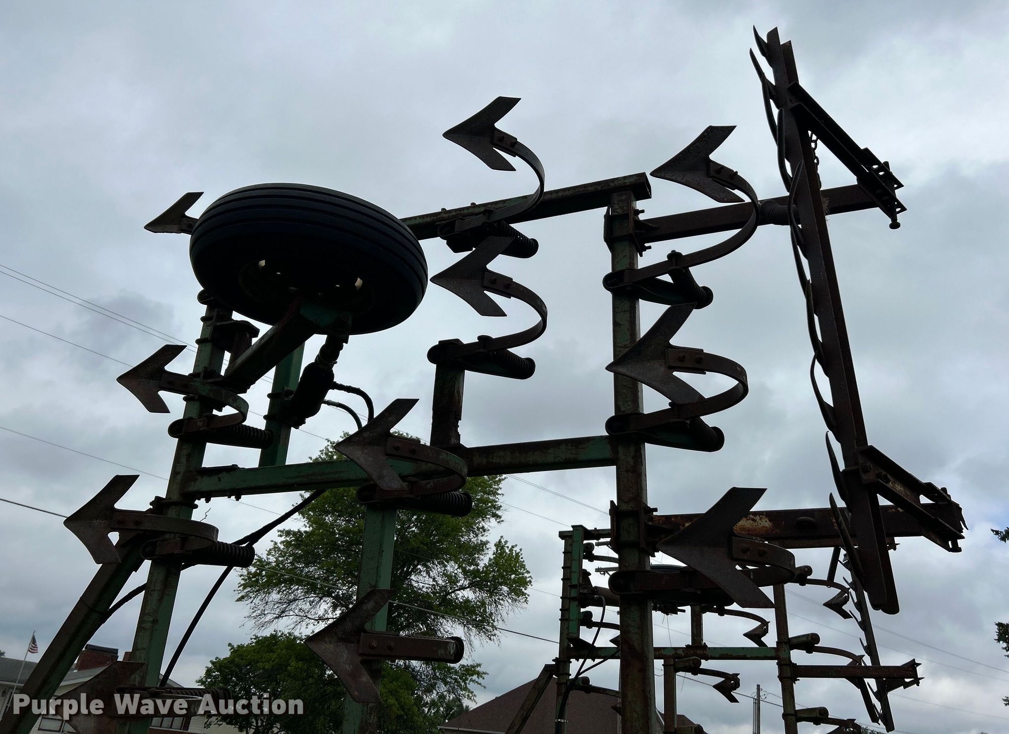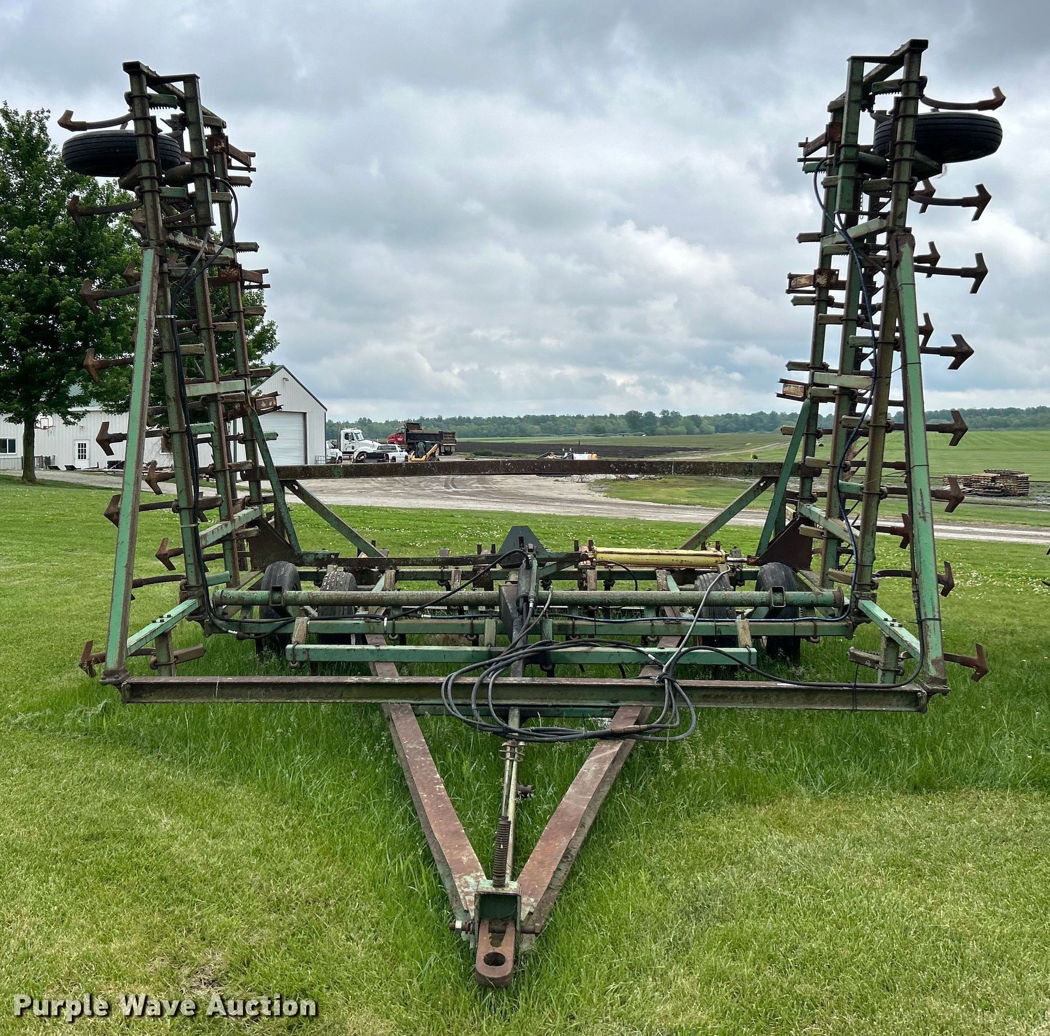 John Deere E1000 field cultivator. Overall width: 32', Serial: 017511N. Features Shanks: 67, Sweep width: 8", Operation Hydraulic lift, Hydraulic fold, Walking tandem axle, Attachments Spike tooth harrow Harrow bars: 1.. Tires Tire size: 7.60-15SL. Schroeder Sod Farms. Saint Charles, MO 63301