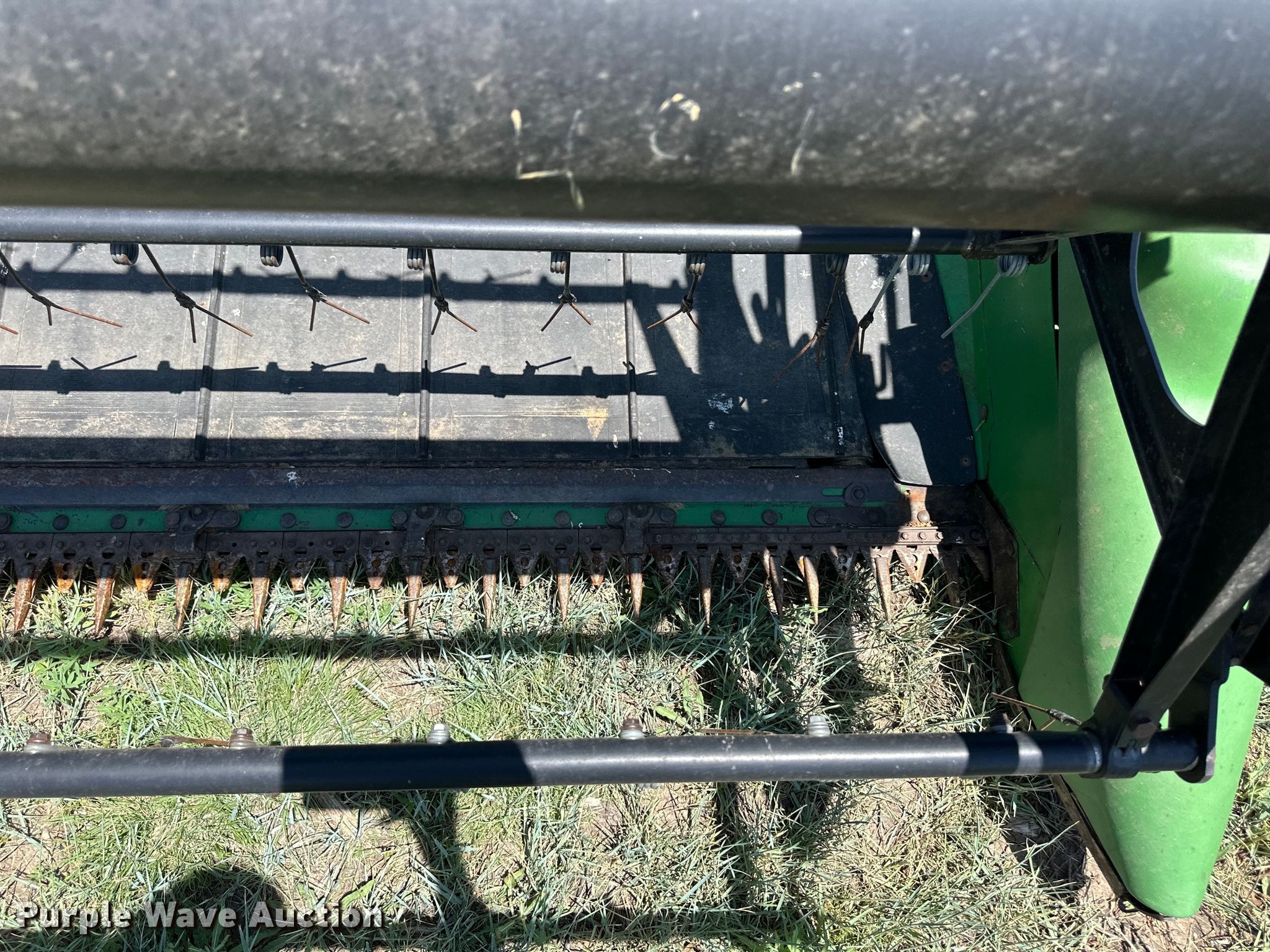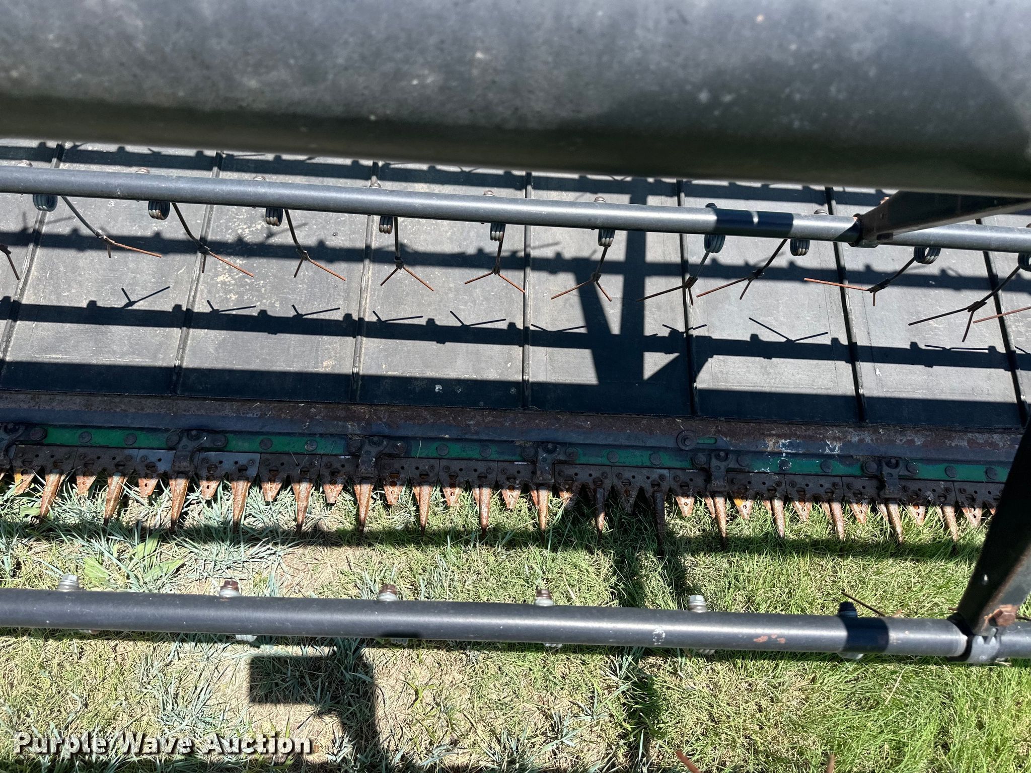 John Deere 925D flex draper head. Serial: H00925D686216. Features Width: 25', Reel: Finger Hydraulic fore/aft, Hydraulic reel height control, Single point coupler, Drivelines: Single. Notes Single point coupler damaged Wires cut, Lines missing. Nowlin Cattle Company. Booker, TX 79005