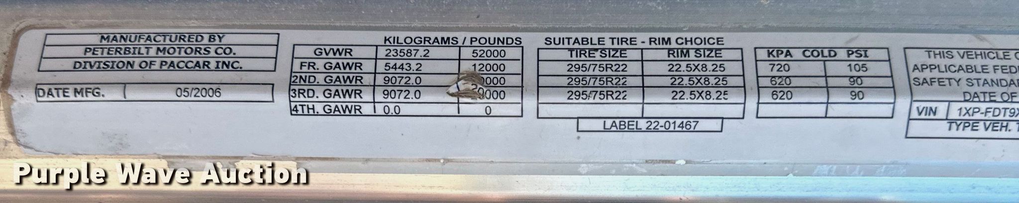 2007 Peterbilt 378 semi truck. Miles: 465,032 on odometer, Hours: 31,257 on meter, VIN: 1XPFDT9X47D666635. Engine Caterpillar C13 Acert, Displacement: 9.2L, Cylinders: 6, Fuel type: Diesel, Engine brake. Transmission Eaton Fuller, Manual, Speed: 10. Chassis Axles: Tandem, Differential lock: Inter-axle, Suspension: Air, Brakes: Air, PTO, GVWR: 52,000 lbs. Interior AC, Heat, Power windows, Power locks, Air ride cab, Sleeper Sleeper length: 3', Beds: Single. Features Fifth wheel type: Fixed, Fuel tank: Dual. Tires Size: 295/75R22.5. Notes Dash warning indicator: ABS, Windshield chipped or cracked, Front wheels will be replaced prior to auction. Texas title. Title has a lien that will be released following the close of the auction. Title distribution may be delayed up to 30 days from verification of funds. Gruver, TX 79040