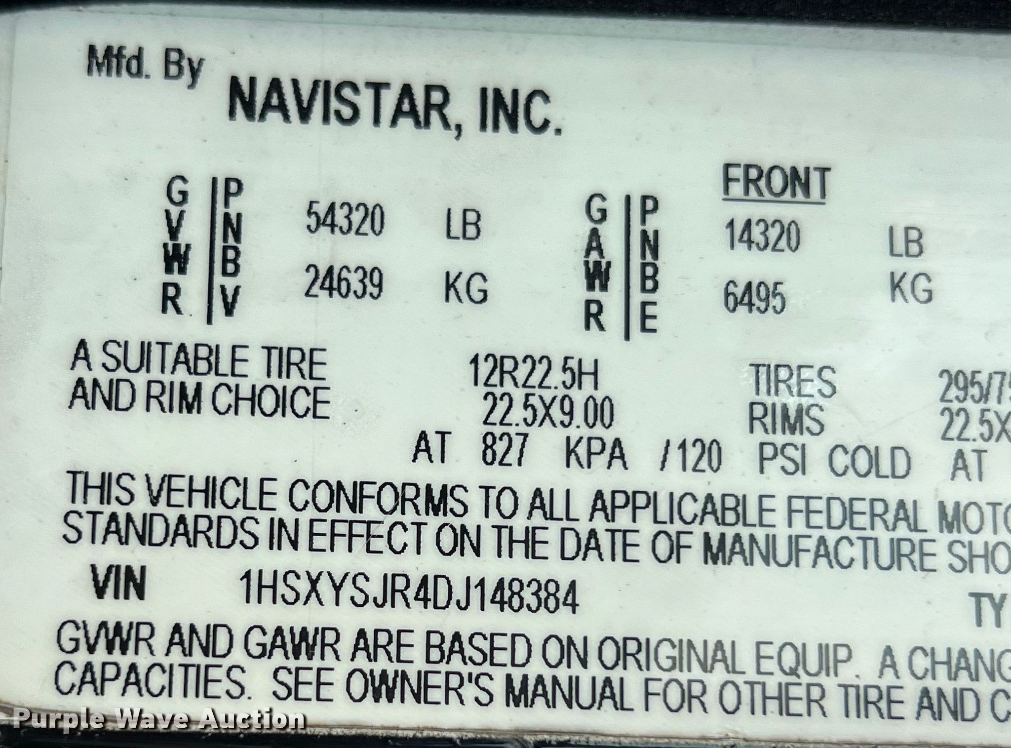 2013 International PayStar 5900i semi truck. Miles: 315,892 on odometer, Hours: 12,800 on meter, VIN: 1HSXYSJR4DJ148384. Engine International MaxxForce 13, Displacement: 13.0L, Cylinders: 6, Fuel type: Diesel, Engine brake. Transmission Eaton Fuller, Manual, Speed: 13. Chassis Axles: Tandem, Differential lock: Inter-axle, Suspension: Air Dump valves, Brakes: Air, PTO, Wet kit, GVWR: 54,320 lbs FAWR: 14,320 lbs, IAWR: 20,000 lbs, RAWR: 20,000 lbs. Interior AC, Heat, Heated mirrors, Power windows, Power locks, Cruise control. Features Deck plate: Aluminum, Fifth wheel type: Air operated, Sliding, Fuel tank: Dual. Tires Size: 11R24.5. Notes Dash warning indicator: Traction control, Windshield chipped or cracked. Texas title. Title distribution may be delayed up to 14 days from verification of funds. G & D Directional Drilling LLC. Houston, TX 77016