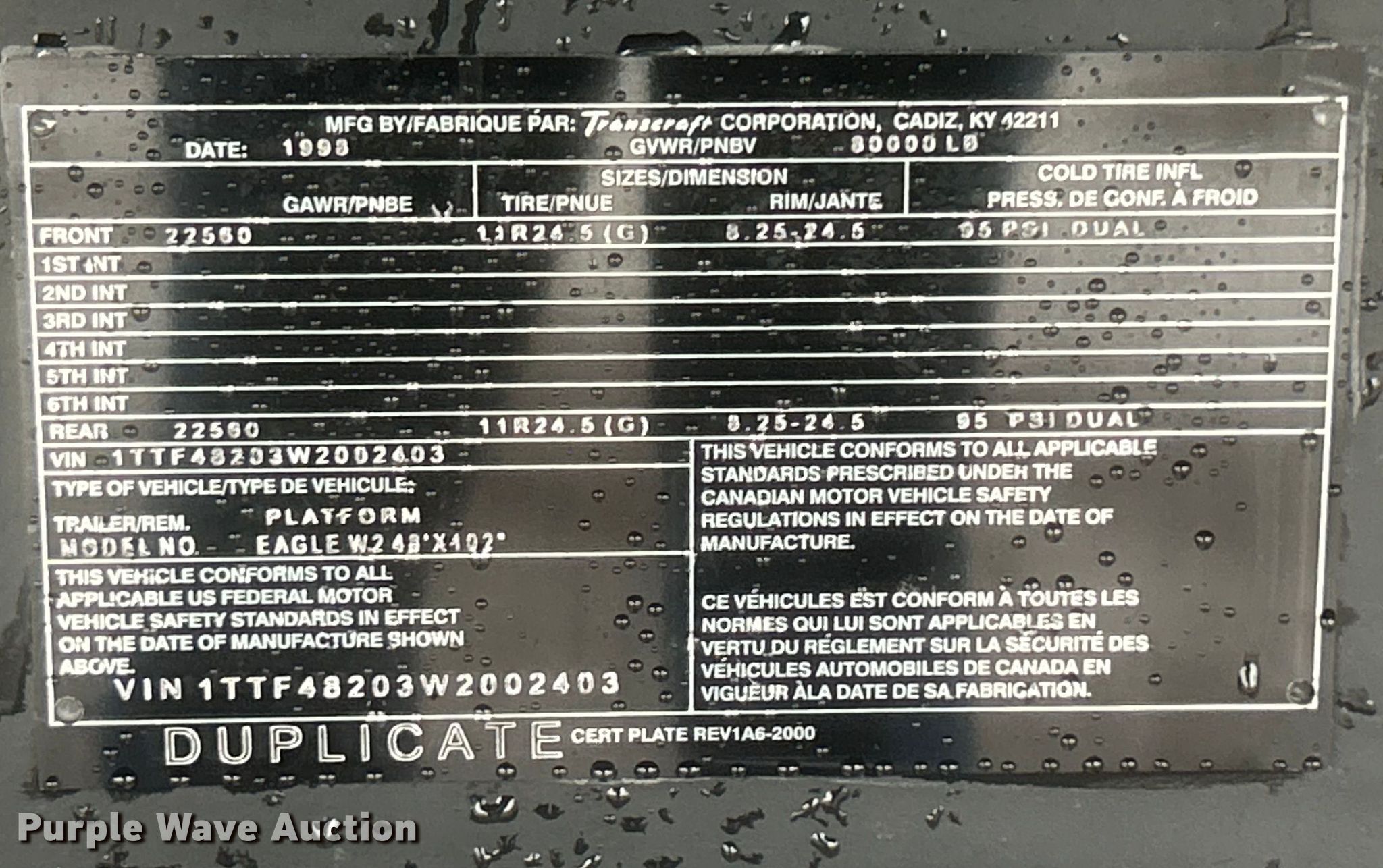 1998 Transcraft flatbed trailer. VIN: 1TTF48203W2002403. Dimensions Overall: 48' L x 102" W. Features Deck type: Aluminum. Chassis Landing gear: Dual, Suspension: Air, Brakes: Air, Axles: Spread, GVWR: 30,000 lbs, GAWR: 22,560 lbs. Tires Aluminum wheels, Size: 11R24.5. Oklahoma title. Title distribution may be delayed up to 14 days from verification of funds. Collinsville, OK 74021