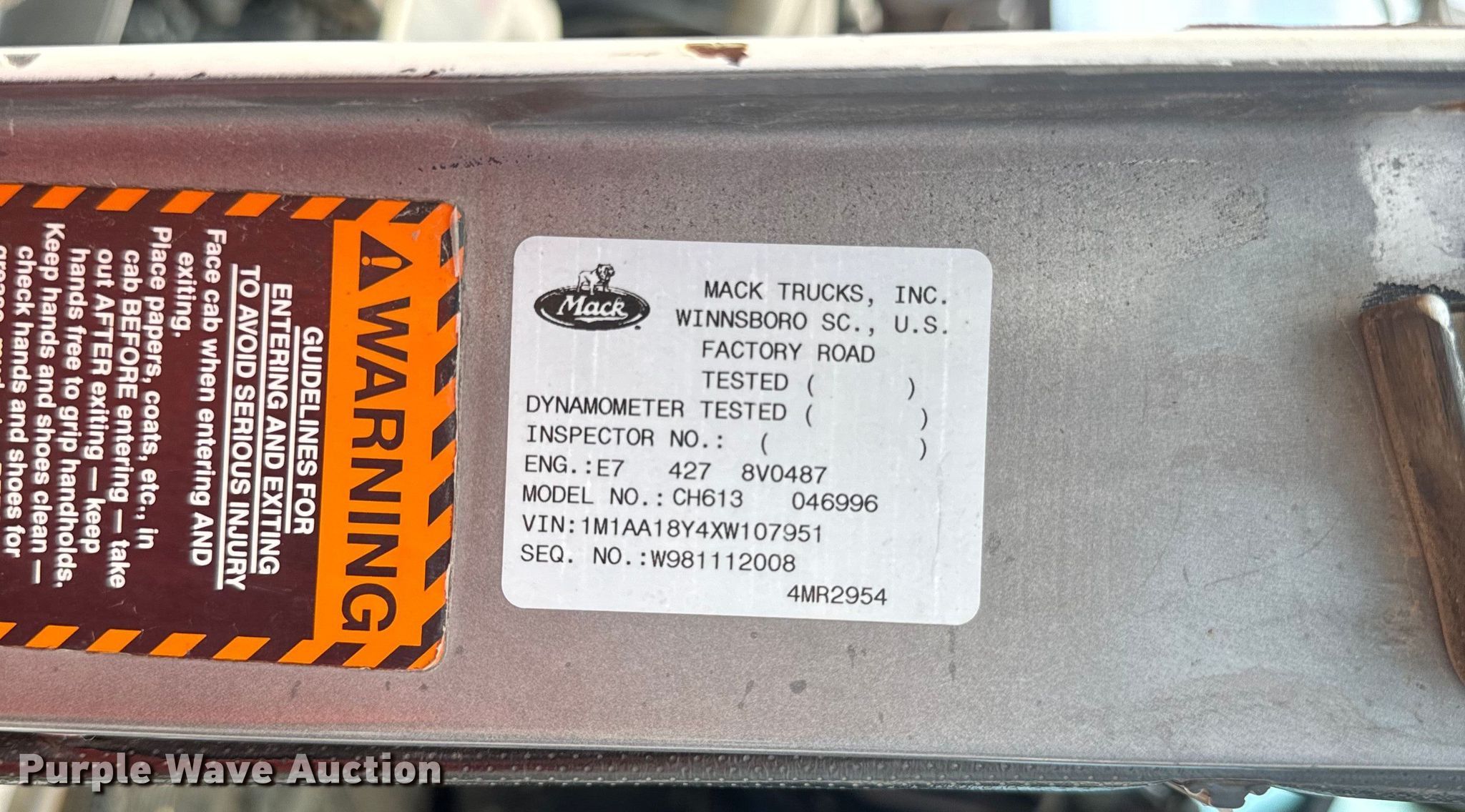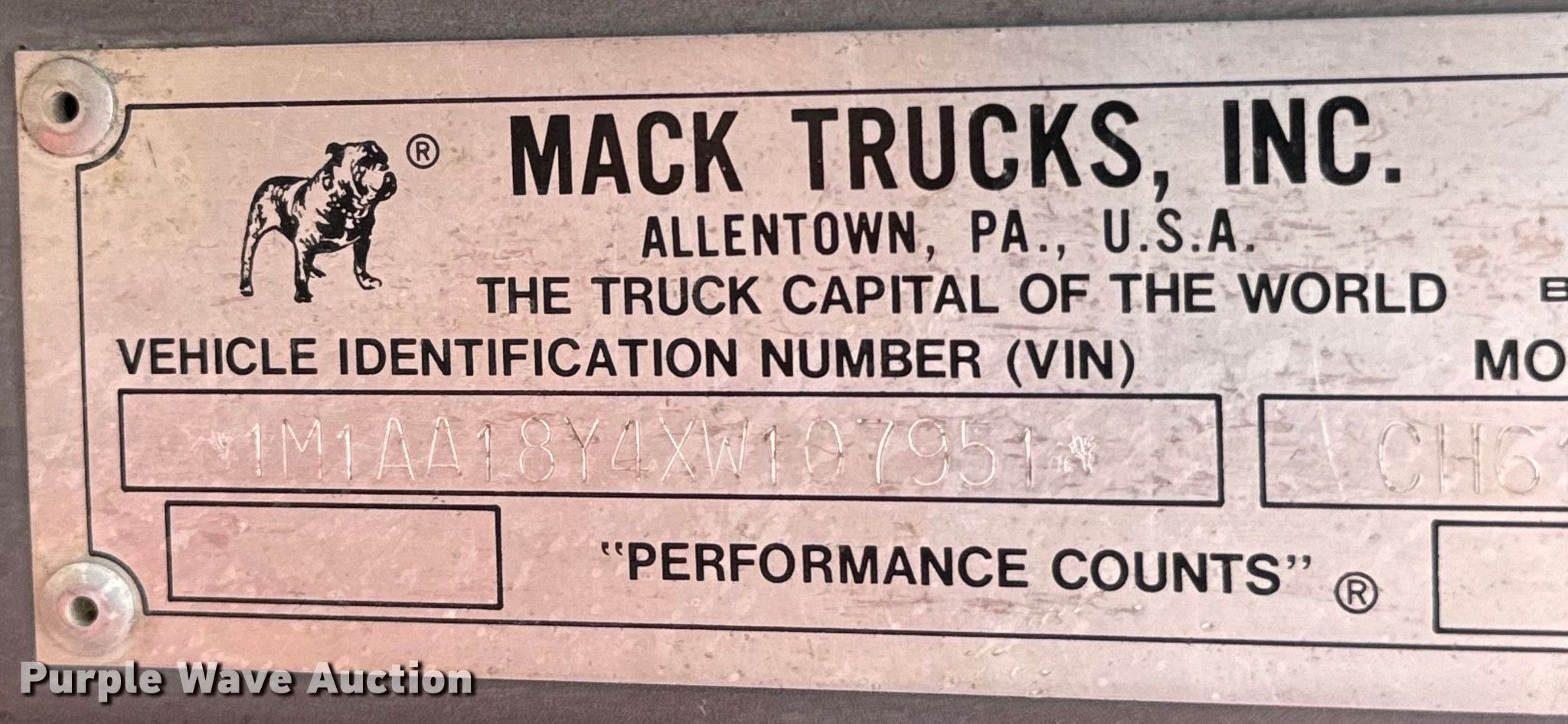 Purple Wave is selling a used Truck Tractor in Kansas. This item is a 1999 Mack CH613 semi truck with the following: Miles: 701,628 on odometer, Hours: 21,197 on meter, VIN: 1M1AA18Y4XW107951
