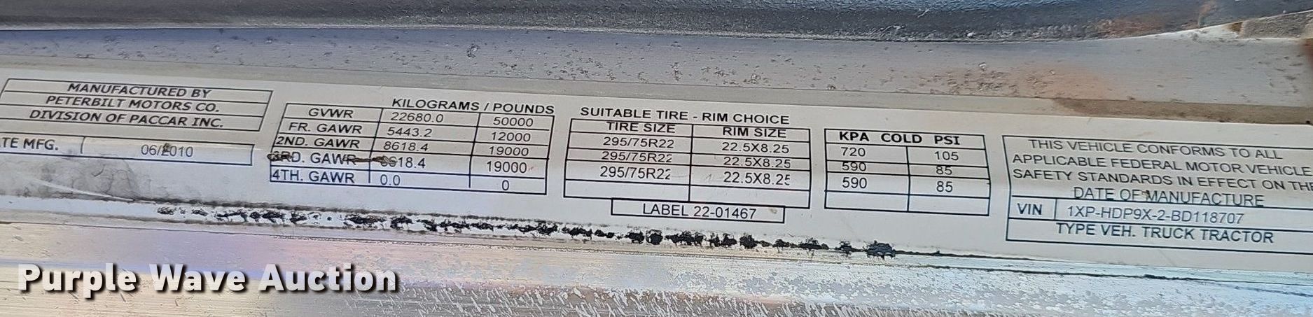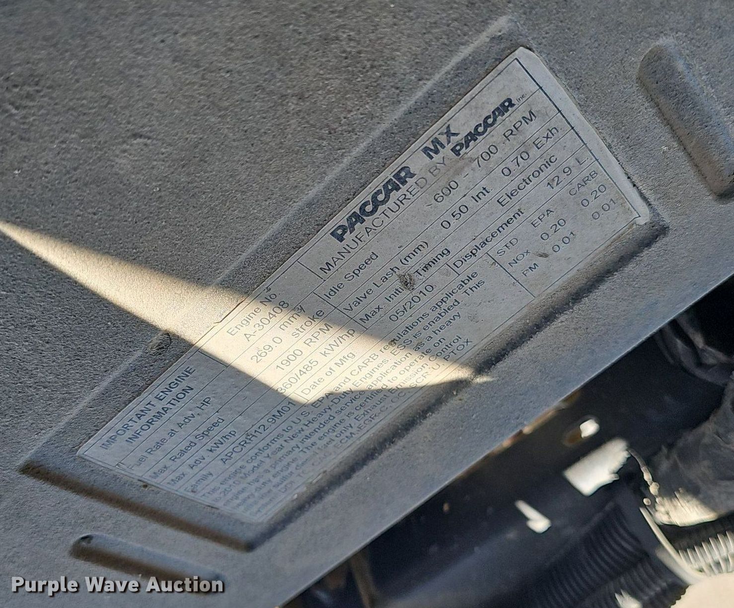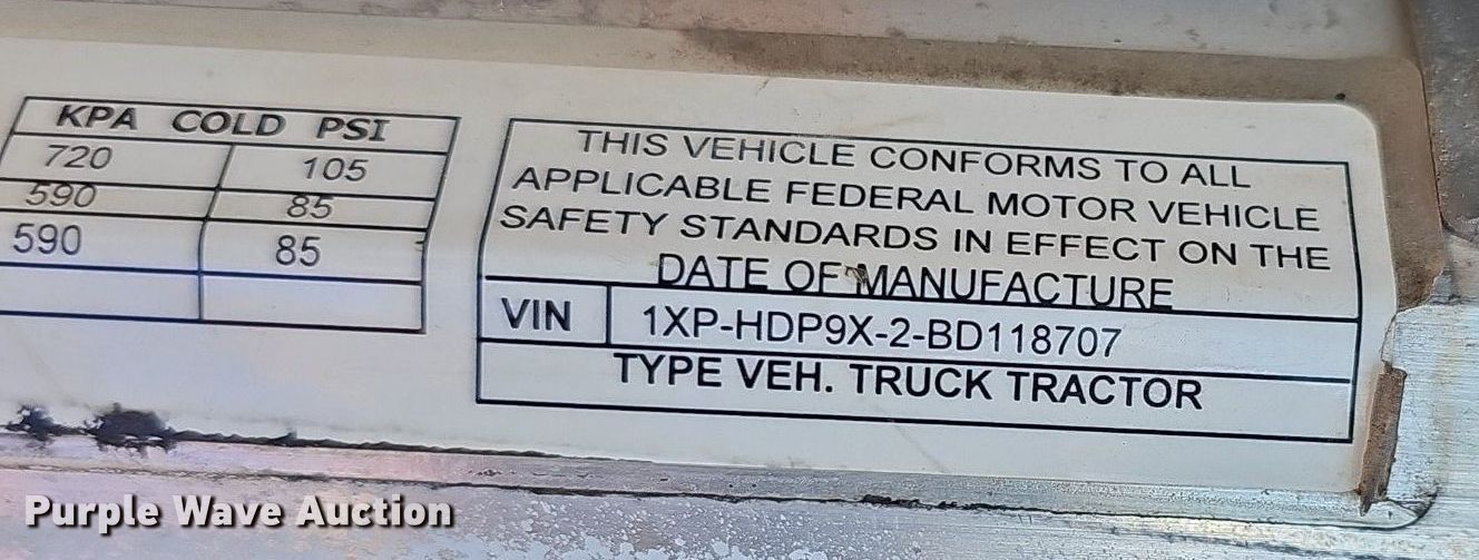 2011 Peterbilt 386 semi truck. Miles: 612,731 on odometer, VIN: 1XPHDP9X2BD118707. Engine Paccar MX, Serial: A-30408, Displacement: 12.9L, Cylinders: 6, Fuel type: Diesel, HP: 485, Engine brake. Transmission Eaton Fuller, Manual. Chassis Axles: Tandem, Differential lock: Inter-axle, Suspension: Air Dump valves, Brakes: Air, GVWR: 50,000 lbs FAWR: 12,000 lbs, IAWR: 19,000 lbs, RAWR: 19,000 lbs. Interior AC, Heat, Heated mirrors, Power windows, Power locks, Cruise control, Air ride cab, Sleeper Unibilt Ultra cab, Sleeper length: 69", Beds: Single. Features Deck plate: Steel, Fifth wheel type: Air operated, Sliding, Fuel tank: Dual. Tires Front: 275/80R22.5, Rear: 295/75R22.5. Notes Dash warning indicator: Check engine. Missouri title. Seller is a Missouri licensed motor vehicle dealer. Title will be assigned and distributed by the dealer. Please contact the seller for distribution questions. Truck Component Services/Larson Group. Strafford, MO 65757