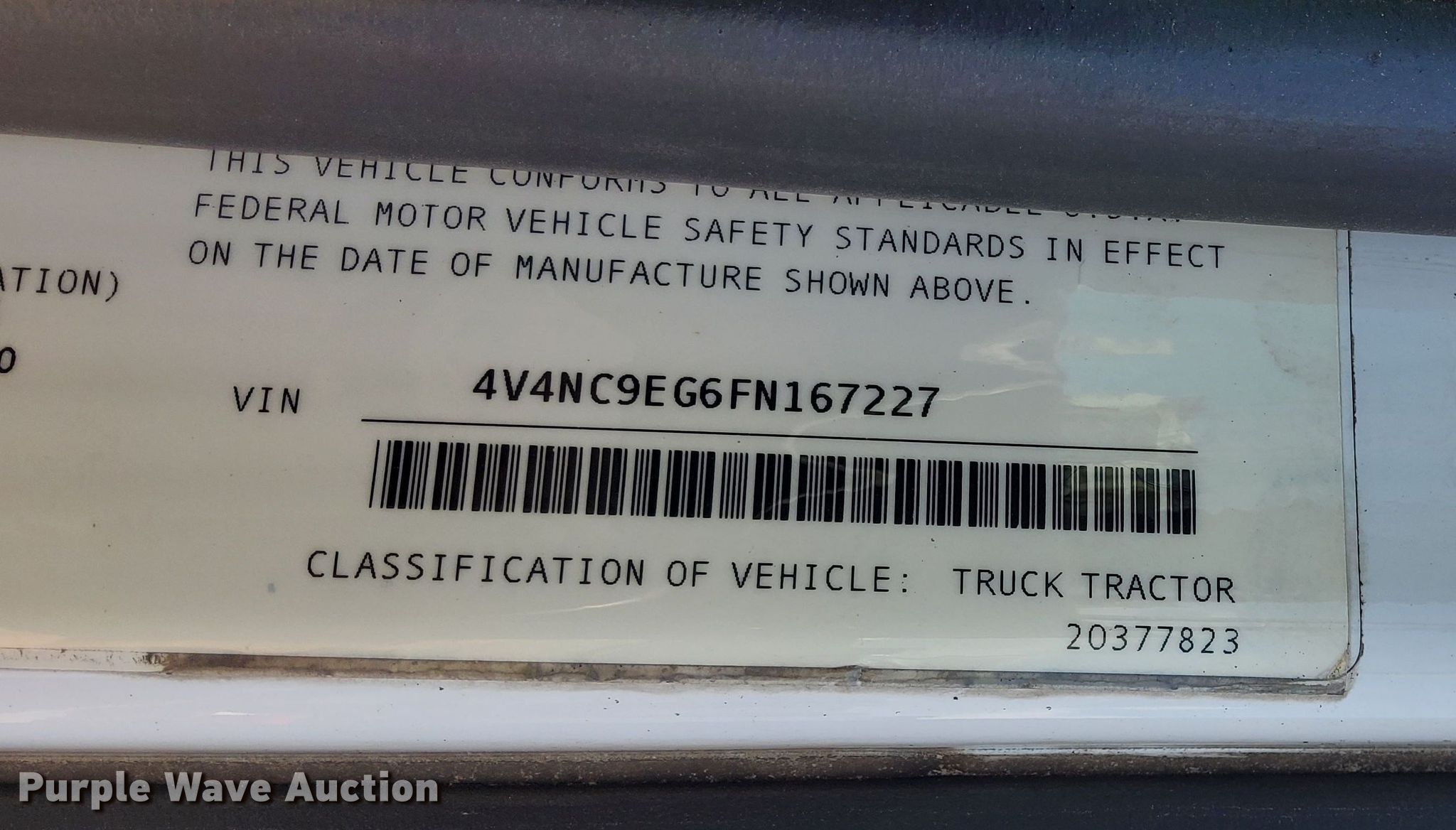 2015 Volvo VNL semi truck. Miles: 802,269 on odometer, VIN: 4V4NC9EG6FN167227. Engine Volvo D13, Serial: 1059219, Displacement: 12.8L, Cylinders: 6, Fuel type: Diesel. Transmission Volvo AT2612D, Automatic. Chassis Axles: Tandem, Differential lock: Inter-axle, Suspension: Air Dump valves, Brakes: Air, GVWR: 52,000 lbs FAWR: 12,000 lbs, IAWR: 20,000 lbs, RAWR: 20,000 lbs. Interior AC, Heat, Heated mirrors, Air ride cab. Features Deck plate: Steel, Fifth wheel type: Fixed, Fuel tank: Dual. Tires Size: 275/80R22.5. Notes Dash warning indicator: Check engine, Regen. Missouri title. Seller is a Missouri licensed motor vehicle dealer. Title will be assigned and distributed by the dealer. Please contact the seller for distribution questions. Truck Component Services/Larson Group. Strafford, MO 65757