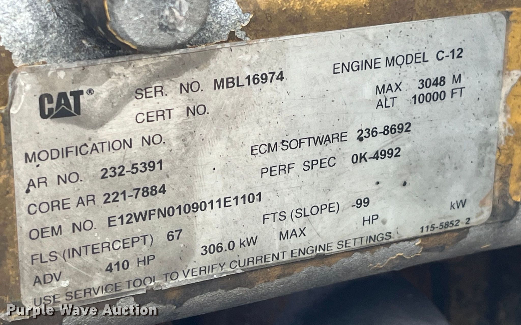 2004 Peterbilt 378 semi truck. Miles: 436,646 on odometer, VIN: 1XPFDU9X84N829749. Engine Caterpillar C12, Serial: MBL16974, Displacement: 12.0L, Cylinders: 6, Fuel type: Diesel, HP: 410, Engine brake. Transmission Eaton Fuller, Manual. Chassis Axles: Tandem, Differential lock: Inter-axle, Suspension: Air Dump valves, Brakes: Air, GVWR: 50,000 lbs FAWR: 12,000 lbs, IAWR: 19,000 lbs, RAWR: 19,000 lbs. Interior AC, Heat, Heated mirrors, Cruise control, Air ride cab. Features Deck plate: Aluminum, Fifth wheel type: Air operated, Sliding, Fuel tank: Dual. Tires Size: 295/75R22.5. Notes Windshield chipped or cracked, Driver side mirror damaged. Missouri title. Title distribution may be delayed up to 14 days from verification of funds. Kent Templeton Farms. Polo, MO 64671