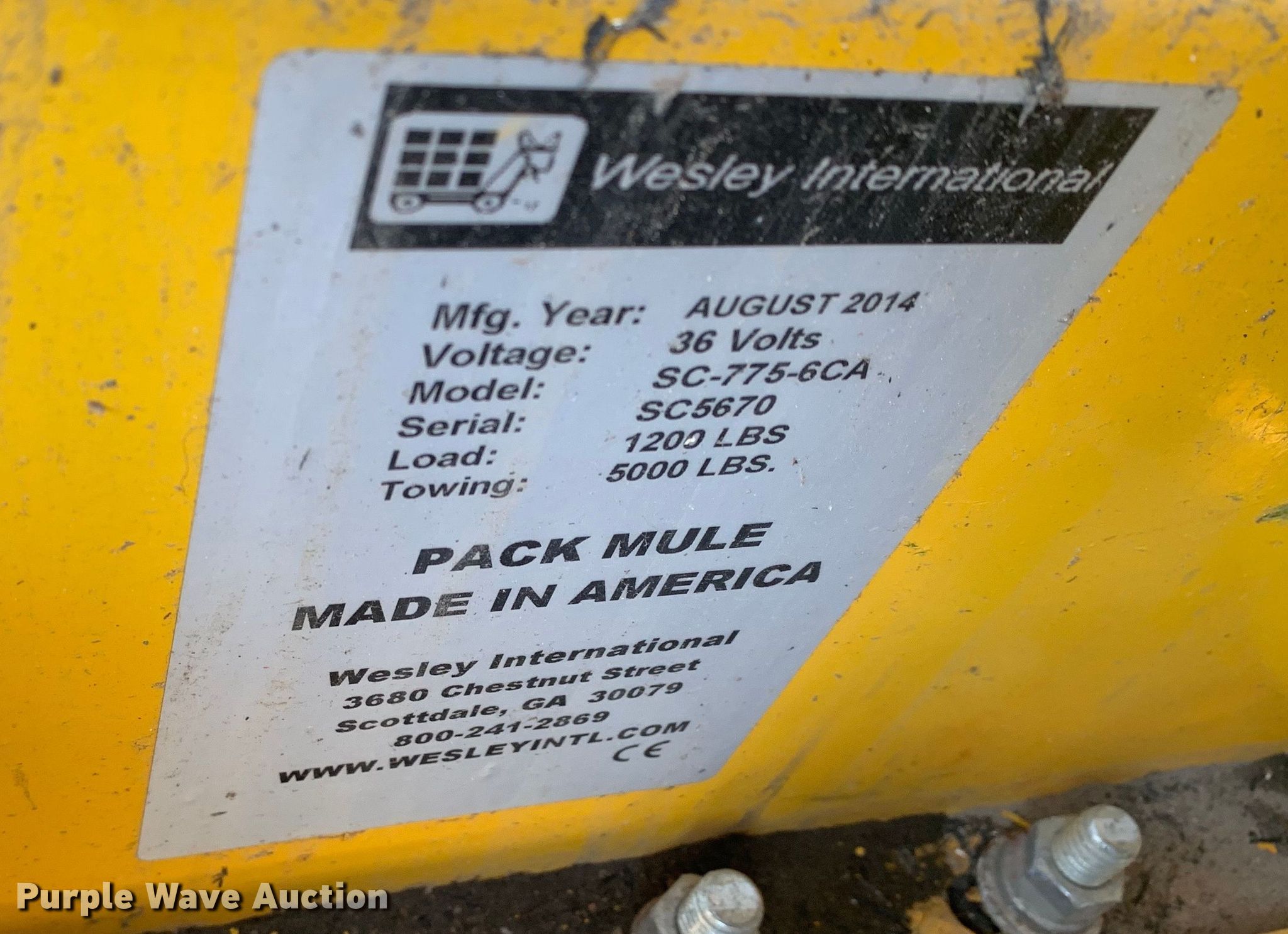 2014 Pack Mule SC-775-6CA utility cart. Hours: 3,488 on meter, Serial: SC5670. Electric Motor D&D Motor 170-501-0001D Serial: 464, Volts: 36/48, Phase: Single, QuiQ onboard charger. Transmission Hydrostatic. Features Top platform: 32" x 49", Bottom platform: 32" x 69", Capacity: 1,200 lbs. Tires Size: 4.00-8, Solid. Scotts Equipment. Irving, TX 75061
