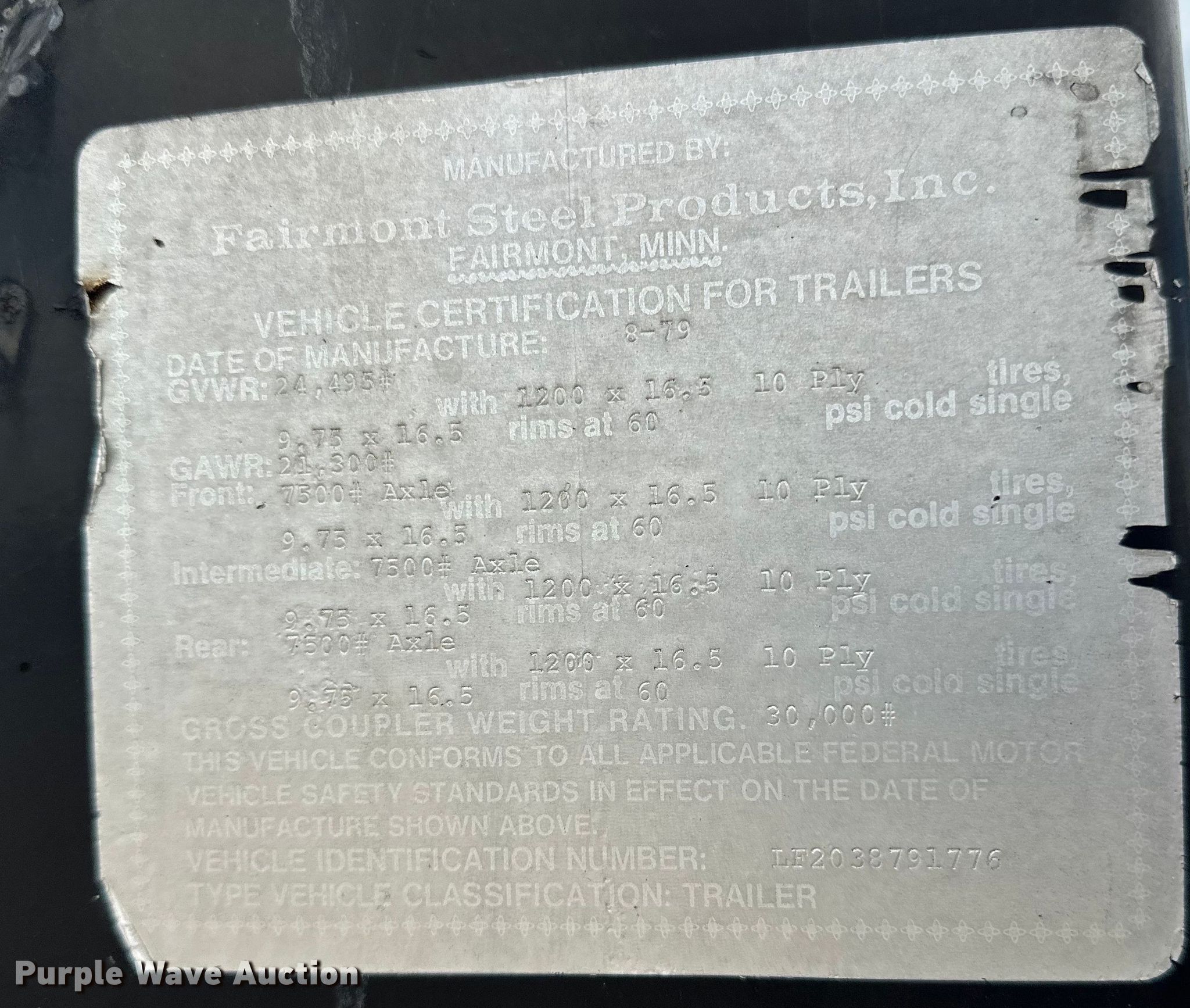 Purple Wave is selling a used Equip. Trailer in Iowa. This item is a 1979 Fairmont Steel Products equipment trailer with the following: VIN: LF2038791776
