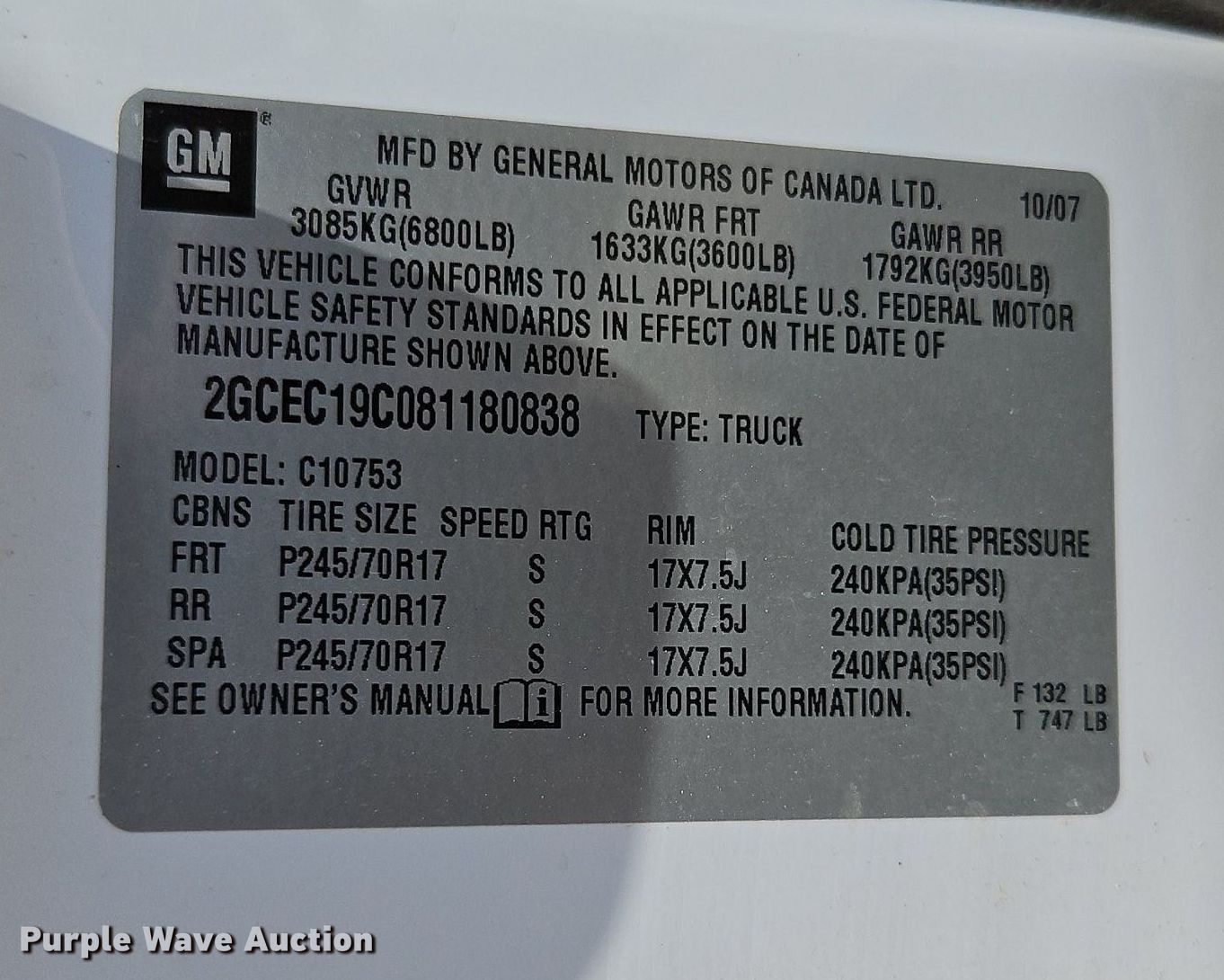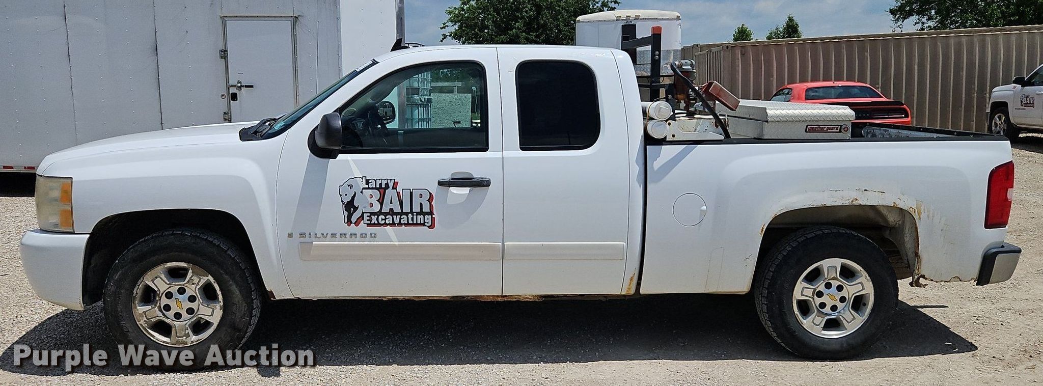 2008 Chevrolet Silverado 1500 Ext. Cab pickup truck. Miles: 306,261 on odometer, VIN: 2GCEC19C081180838, Unit #: 110. Engine Displacement: 4.8L V8 OHV, Cylinders: 8, Fuel type: Gas. Transmission Automatic. Interior AC, heat, Power windows, power locks, Cruise control. Tires Size: 245/75R17. Notes Fuel tank and toolbox not included, Dash warning indicator: Check engine, TPMS, Airbag. Kansas title. Title distribution may be delayed up to 14 days from verification of funds. Larry Bair Excavating. Louisburg, KS 66053