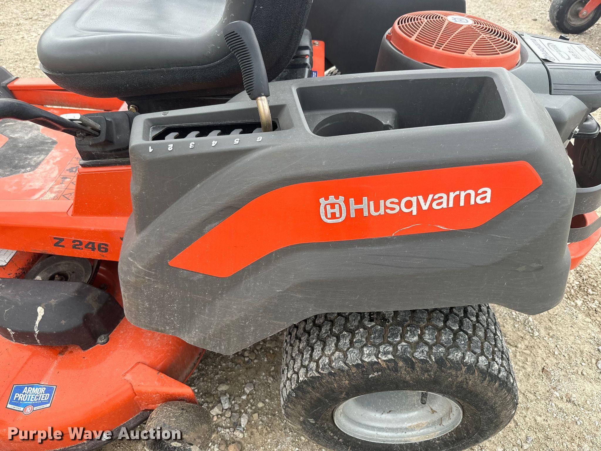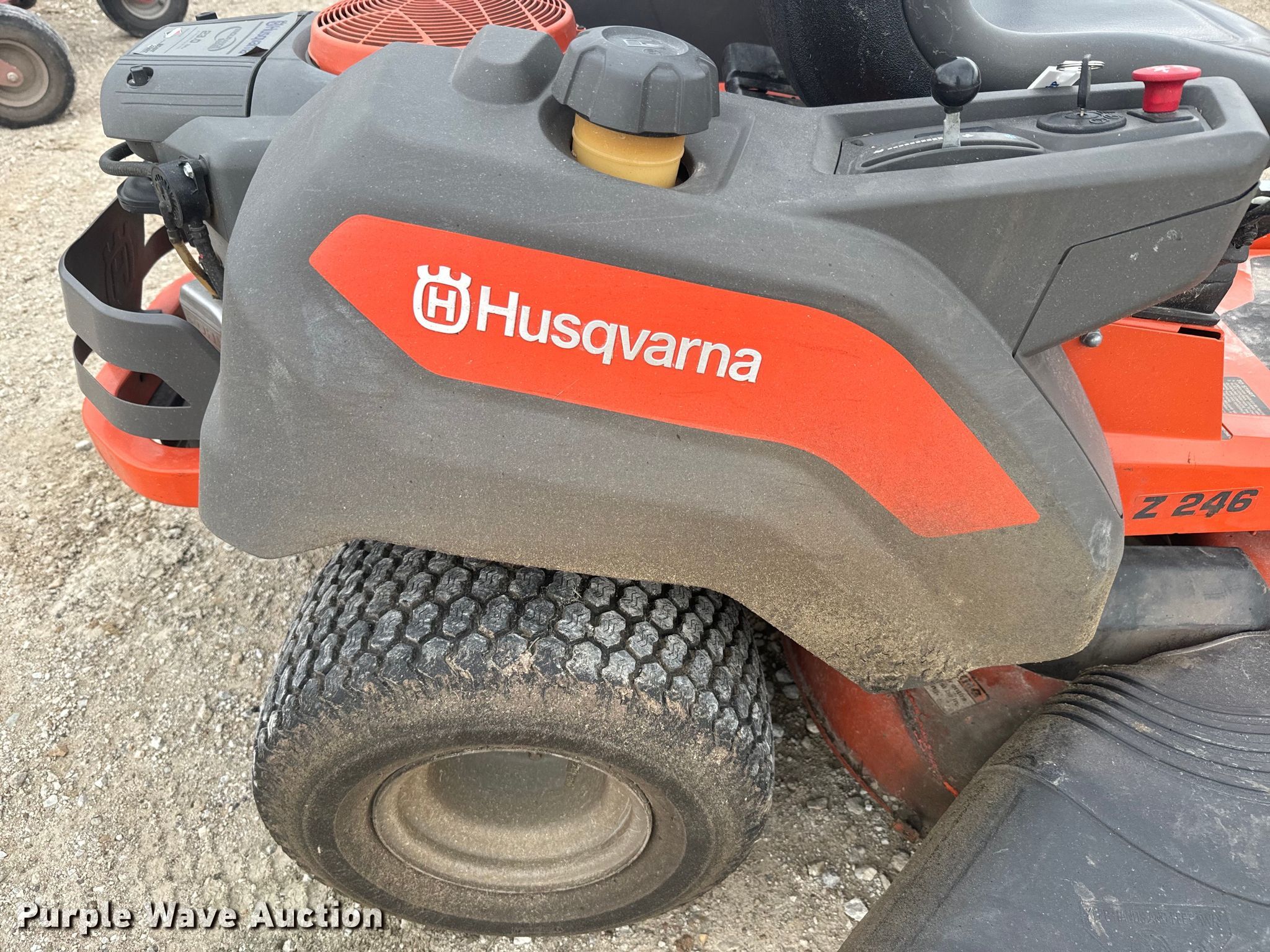 Husqvarna Z246 ZTR lawn mower. Hours: 230 on meter, Cutting width: 46". Engine Briggs&stratton, Displacement: 724 cc, Cylinders: 2, Fuel type: Gas, HP: 23. Transmission Hydrostatic. Tires Front: 11x4.10-5, Rear: 18x9.5-8. KanEquip Inc.. Wamego, KS 66547