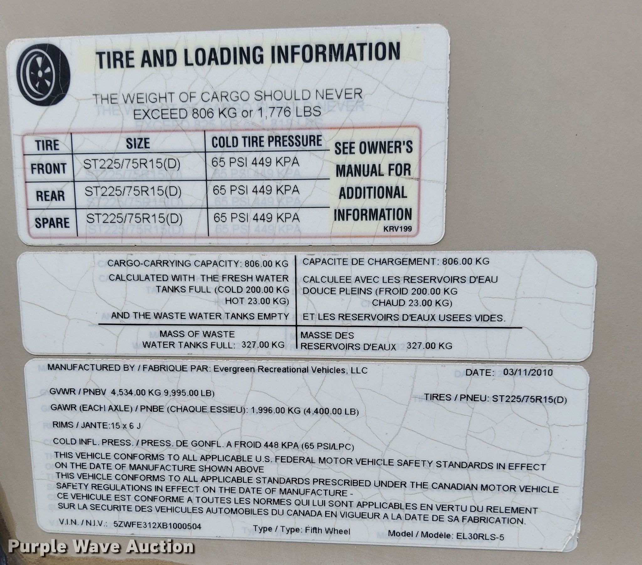 Purple Wave is selling a used RV or Camper in Missouri. This item is a 2011 Evergreen EL30RLS-5 camper with the following: Camper length: 31' 8", VIN: 5ZWFE312XB1000504