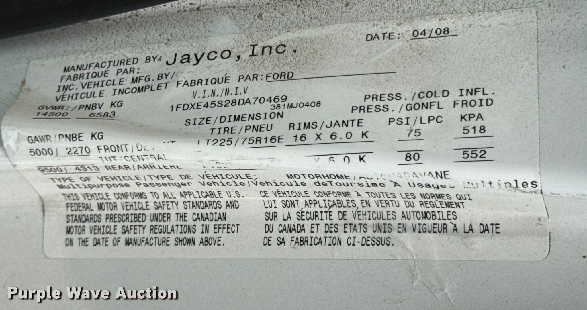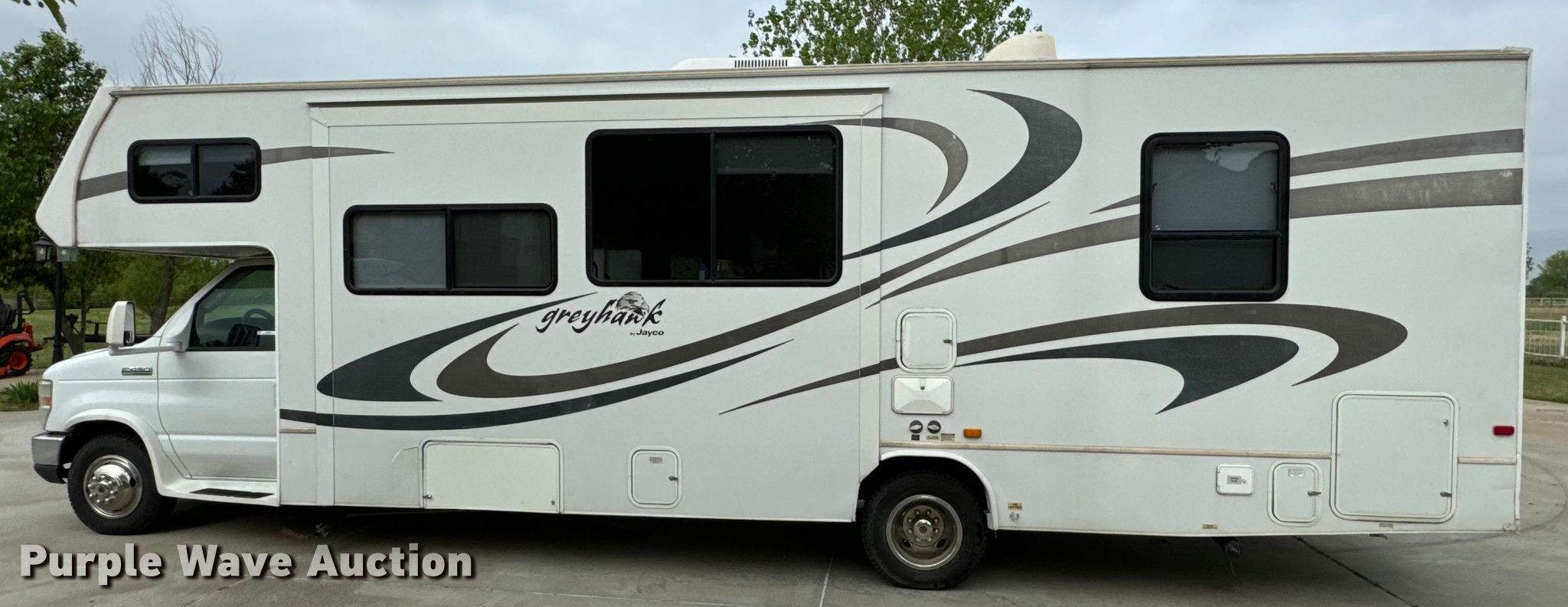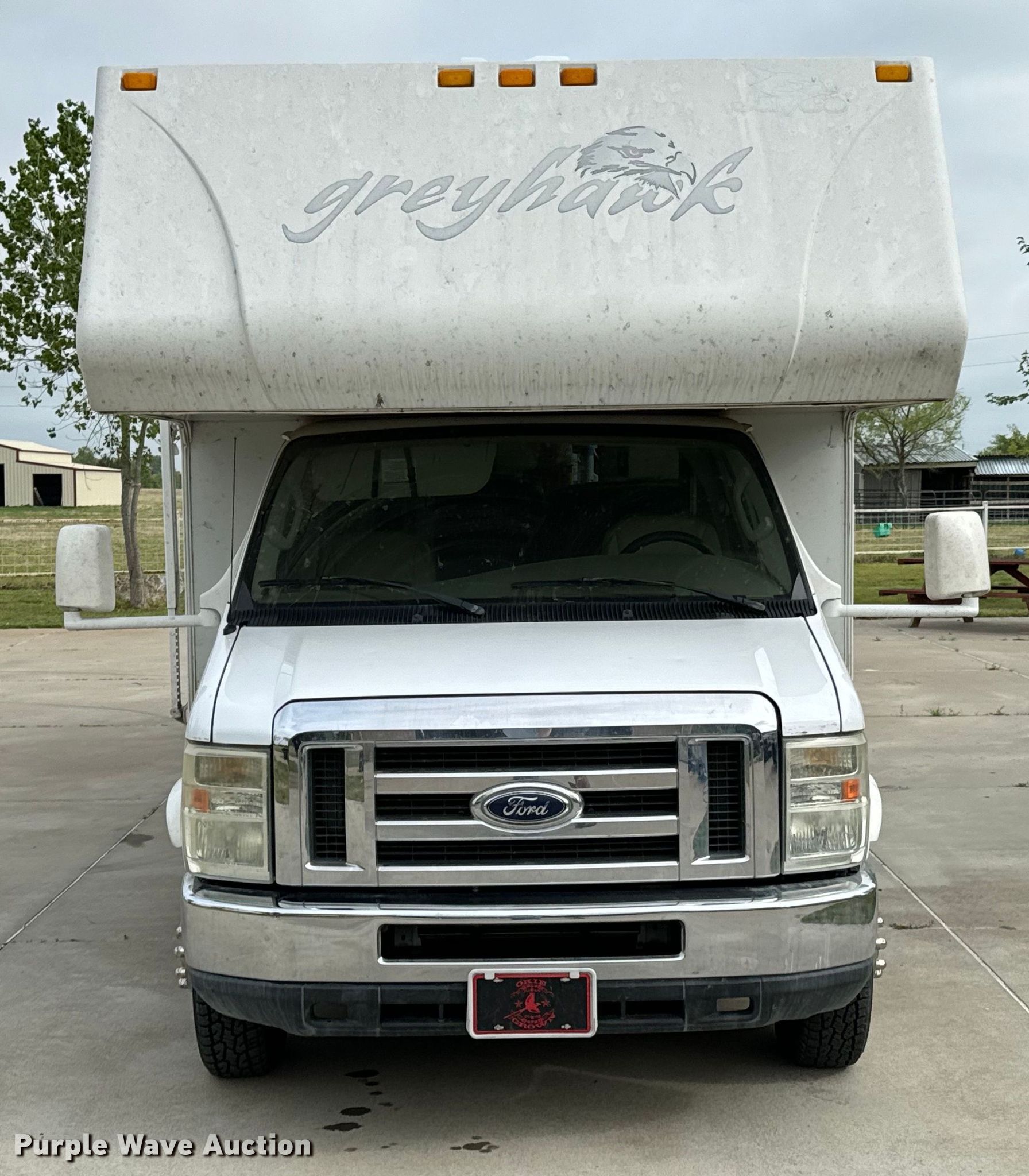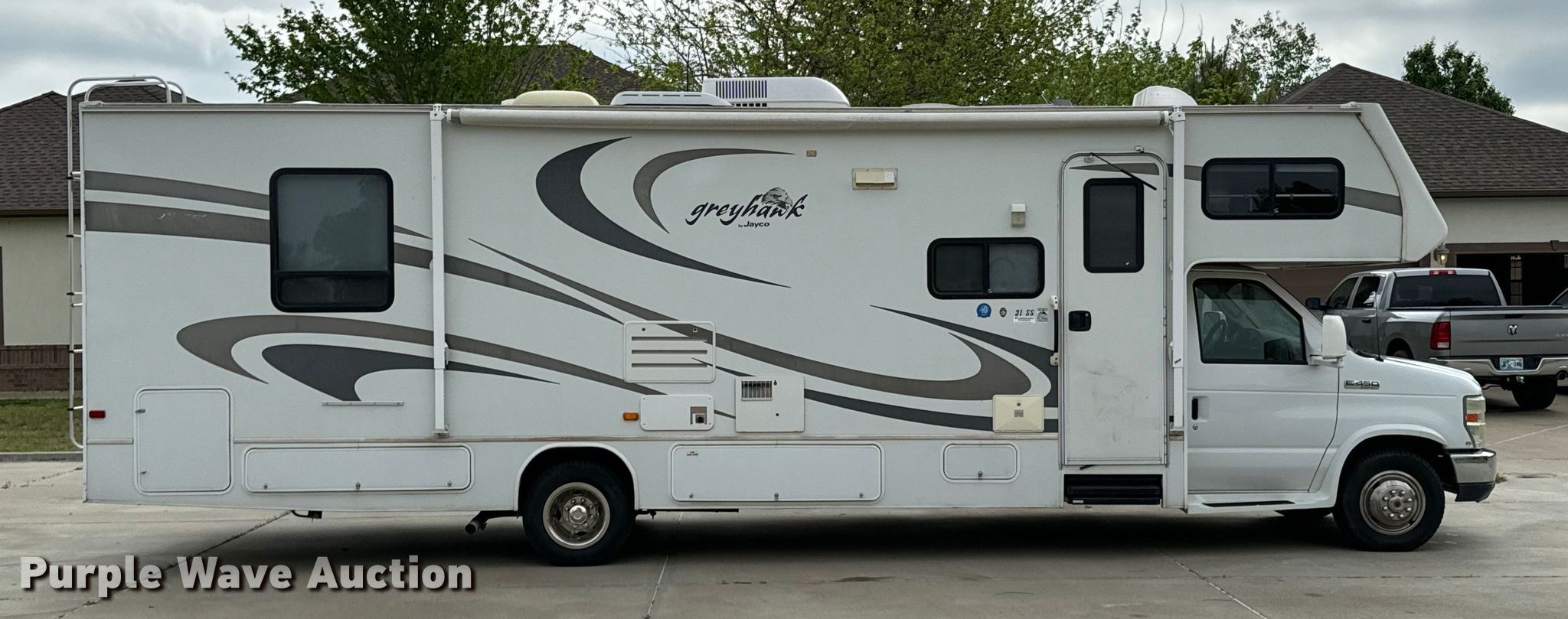 2008 Jayco Greyhawk 31SS RV. Miles: 32,567 on odometer, Camper length: 30', VIN: 1FDXE45S28DA70469. Engine Cylinders: 10, Fuel type: Gas. Transmission Automatic. Chassis Axles: Single, Suspension: Spring, Brakes: Hydraulic, GVWR: 14,500 lbs. Interior Kitchen: Sink, Refrigerator, Freezer, Microwave, Oven, Stove: Propane, Living room: Table, Pull out couch, Bathroom, Bed type: Queen, TVs: 1, Sound system, Heater, AC units: 1. Features Slide outs: 1, Awnings: 1 Awning type: Manual, Generator Onan 4000, Fuel type: Gas. Tires Size: LT225/75R16. Oklahoma title. Gilliam Ranch Holding Company. Sperry, OK 74073