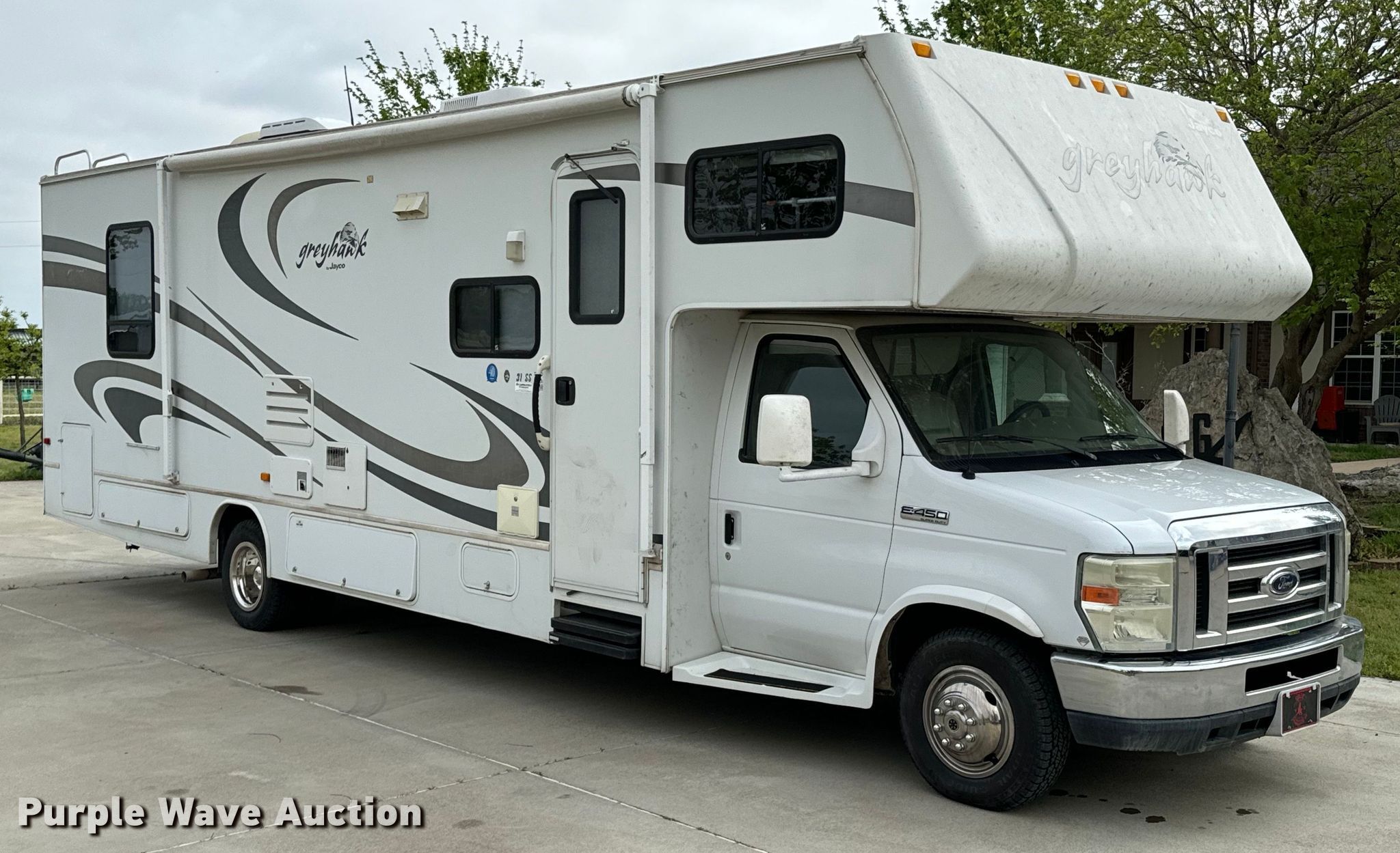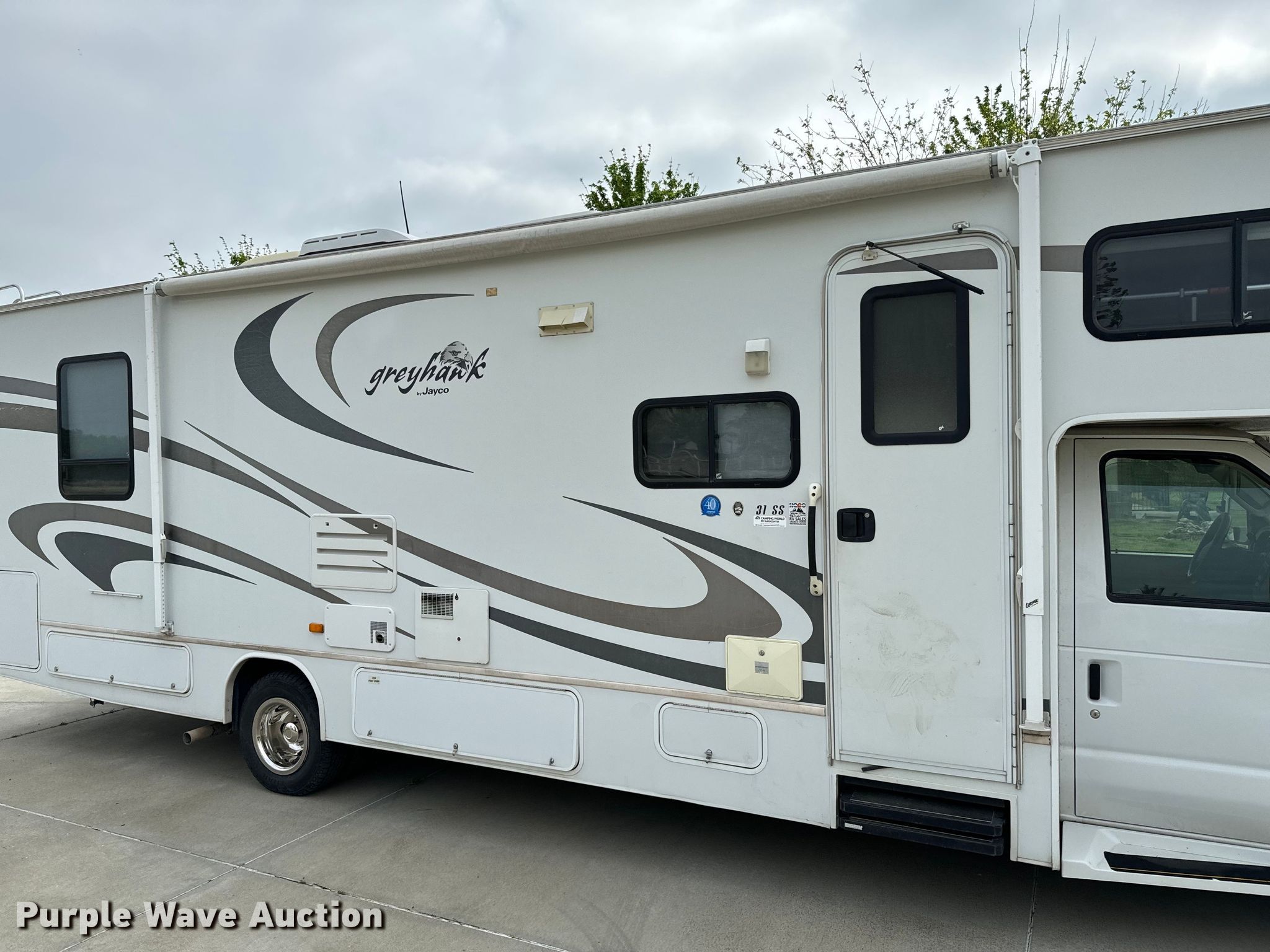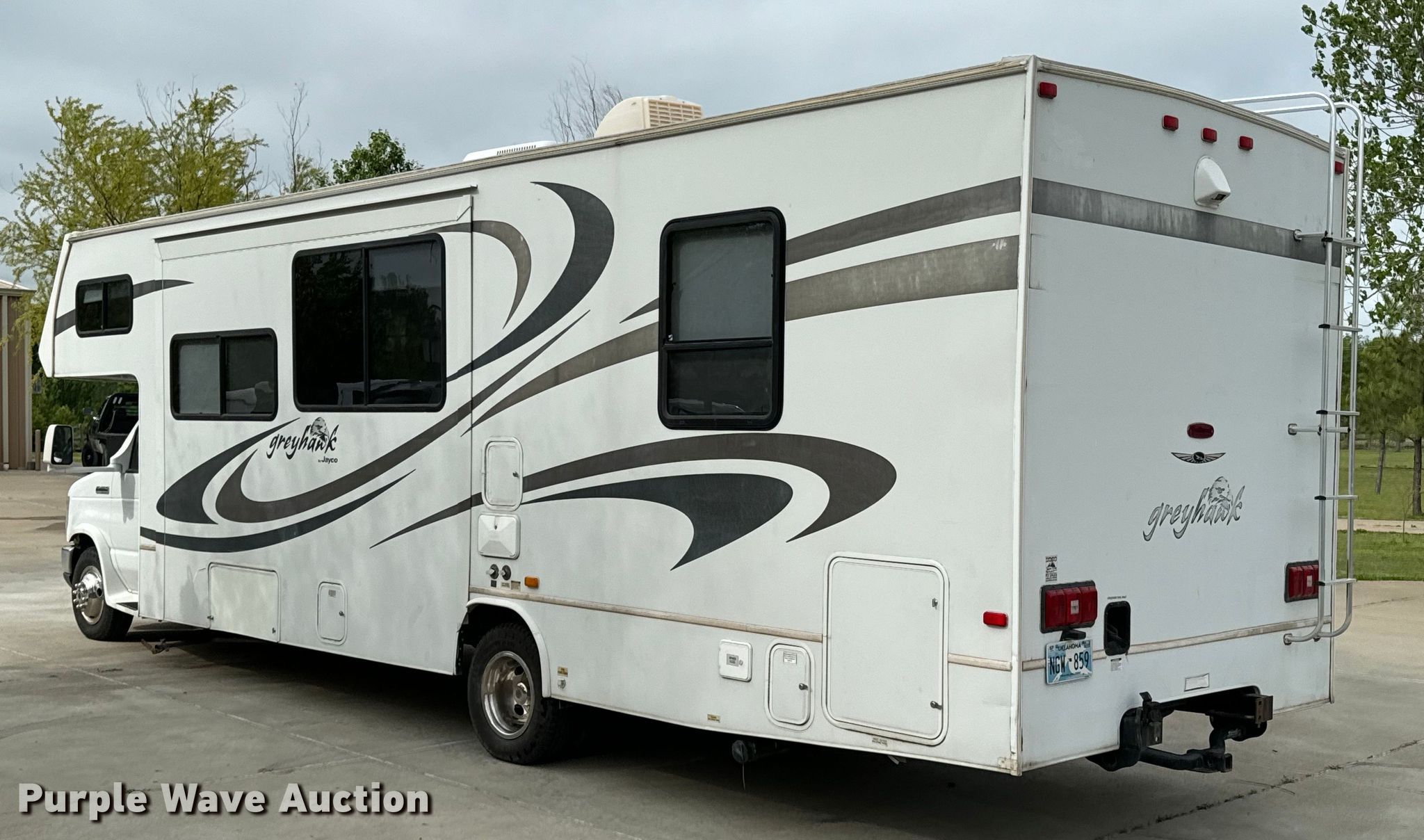 2008 Jayco Greyhawk 31SS RV. Miles: 32,567 on odometer, Camper length: 30', VIN: 1FDXE45S28DA70469. Engine Cylinders: 10, Fuel type: Gas. Transmission Automatic. Chassis Axles: Single, Suspension: Spring, Brakes: Hydraulic, GVWR: 14,500 lbs. Interior Kitchen: Sink, Refrigerator, Freezer, Microwave, Oven, Stove: Propane, Living room: Table, Pull out couch, Bathroom, Bed type: Queen, TVs: 1, Sound system, Heater, AC units: 1. Features Slide outs: 1, Awnings: 1 Awning type: Manual, Generator Onan 4000, Fuel type: Gas. Tires Size: LT225/75R16. Oklahoma title. Gilliam Ranch Holding Company. Sperry, OK 74073