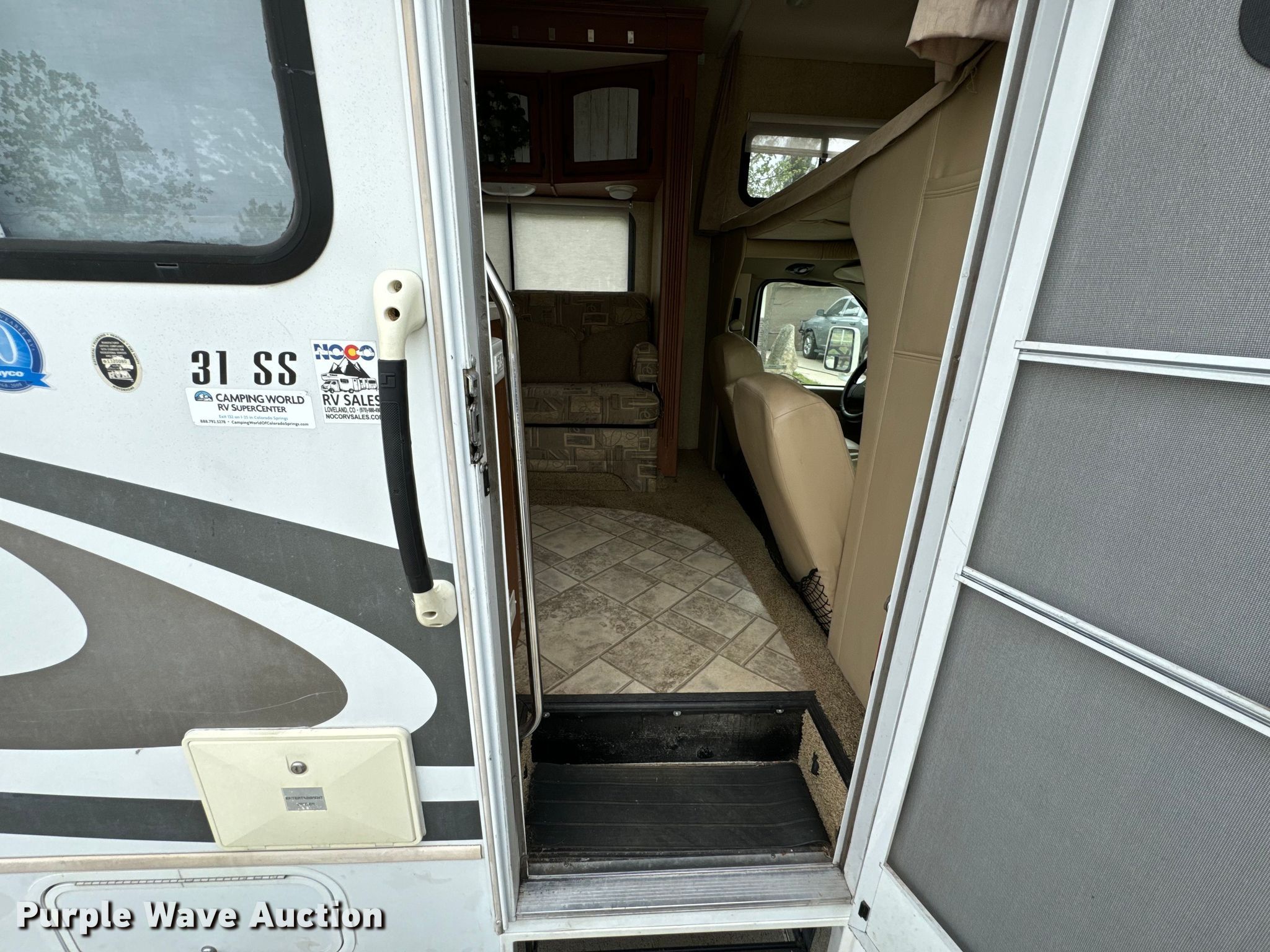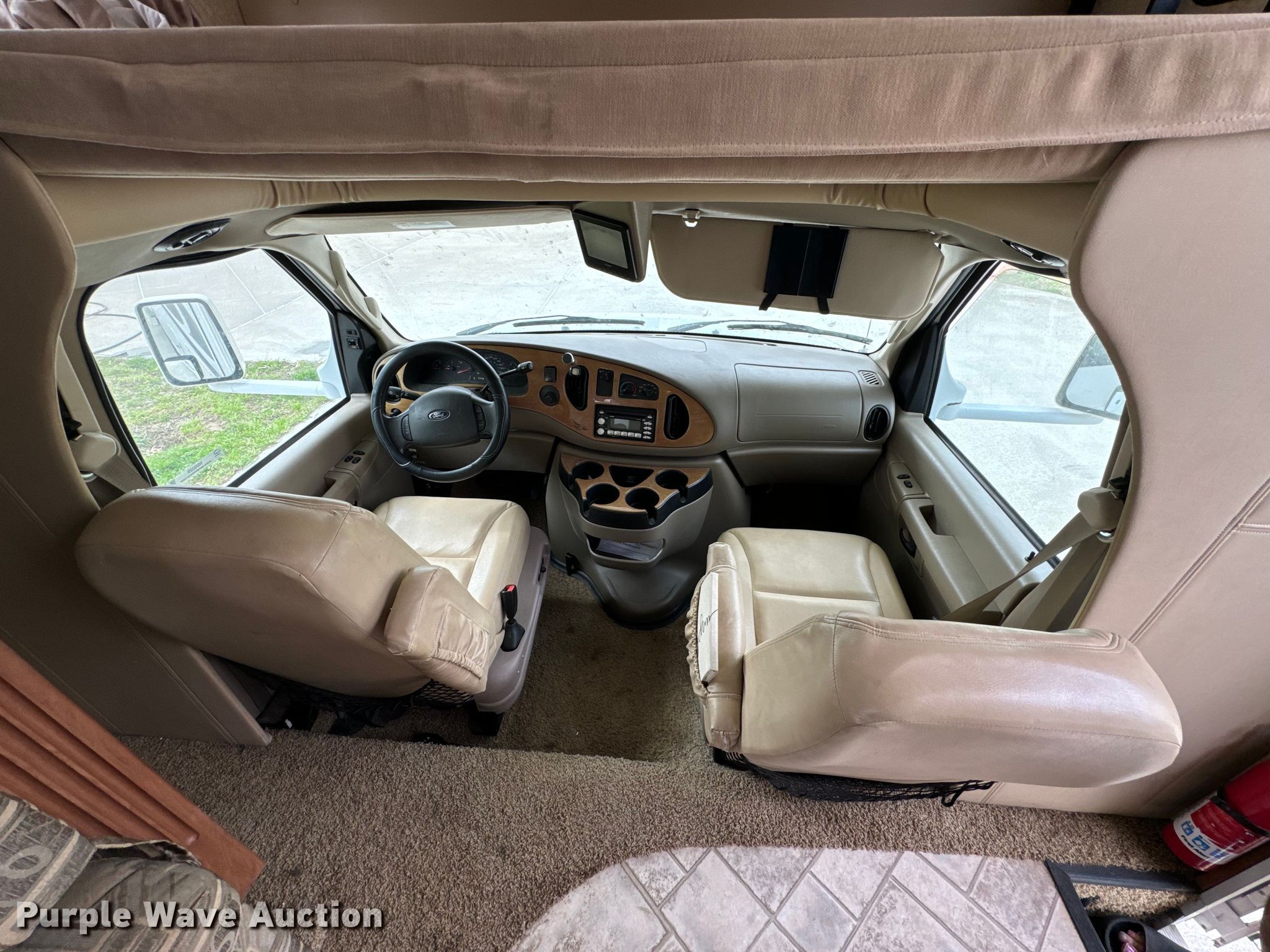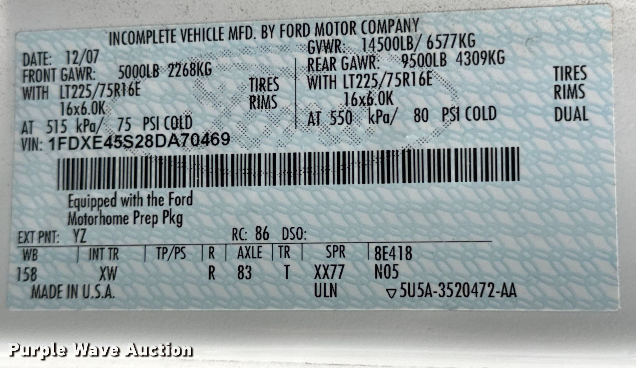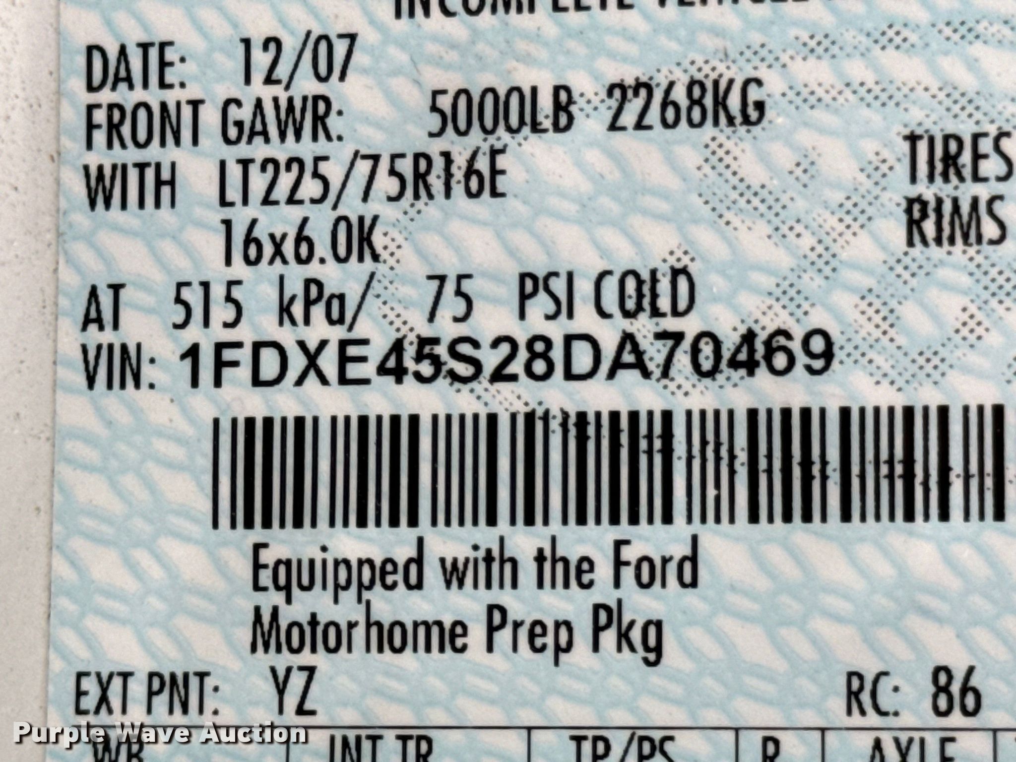 2008 Jayco Greyhawk 31SS RV. Miles: 32,567 on odometer, Camper length: 30', VIN: 1FDXE45S28DA70469. Engine Cylinders: 10, Fuel type: Gas. Transmission Automatic. Chassis Axles: Single, Suspension: Spring, Brakes: Hydraulic, GVWR: 14,500 lbs. Interior Kitchen: Sink, Refrigerator, Freezer, Microwave, Oven, Stove: Propane, Living room: Table, Pull out couch, Bathroom, Bed type: Queen, TVs: 1, Sound system, Heater, AC units: 1. Features Slide outs: 1, Awnings: 1 Awning type: Manual, Generator Onan 4000, Fuel type: Gas. Tires Size: LT225/75R16. Oklahoma title. Gilliam Ranch Holding Company. Sperry, OK 74073