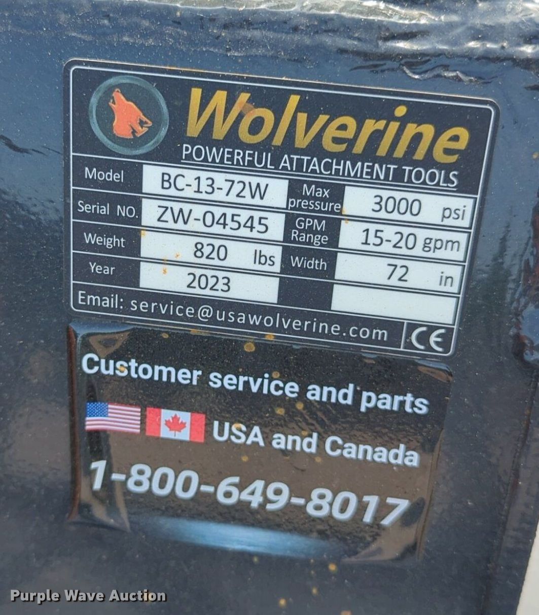 Purple Wave is selling a used Skid Steer Attach. in Oklahoma. This item is a 2023 Wolverine BC-13-72W skid steer rotary mower with the following: Serial: ZW-04545, Width: 72"