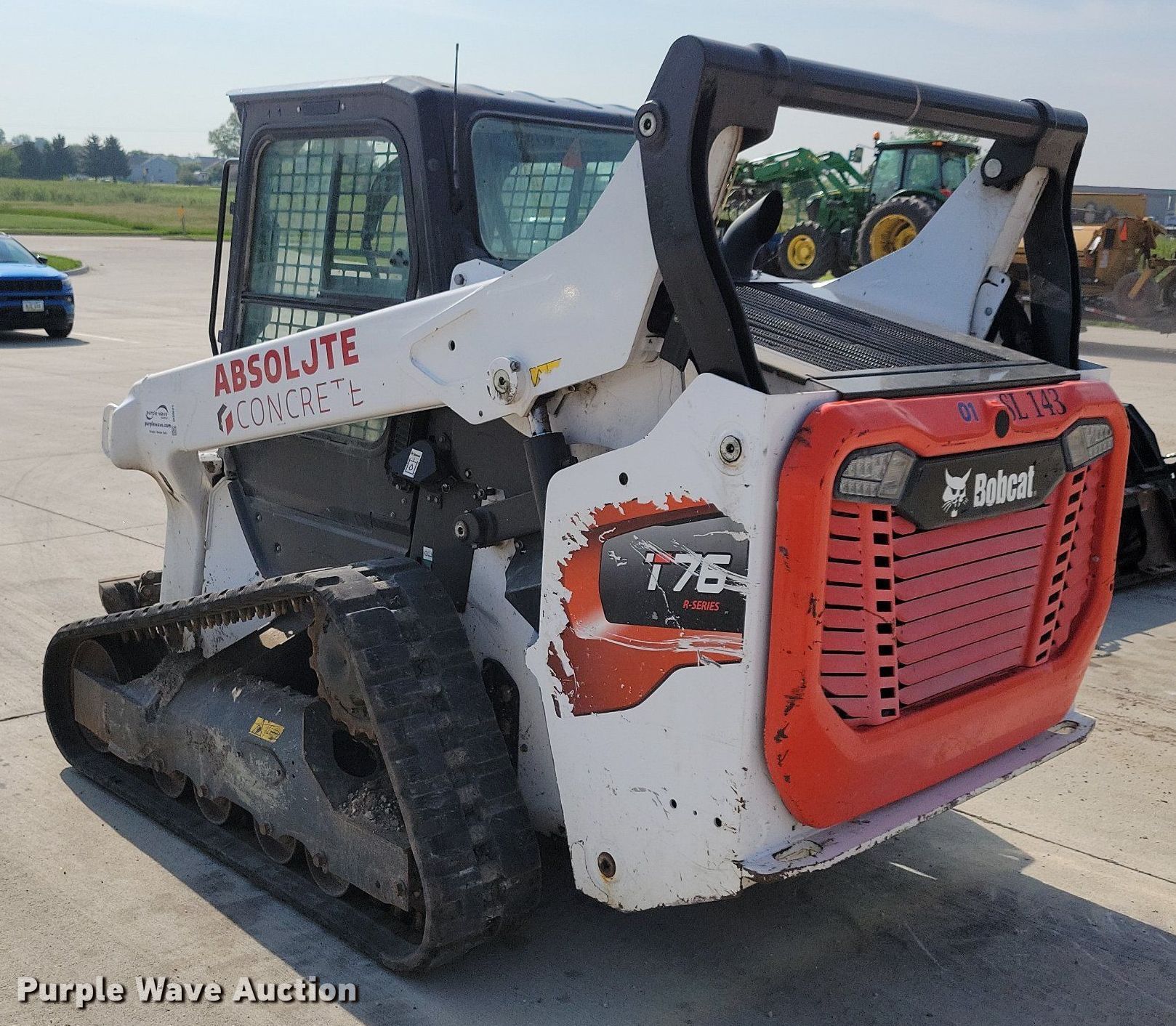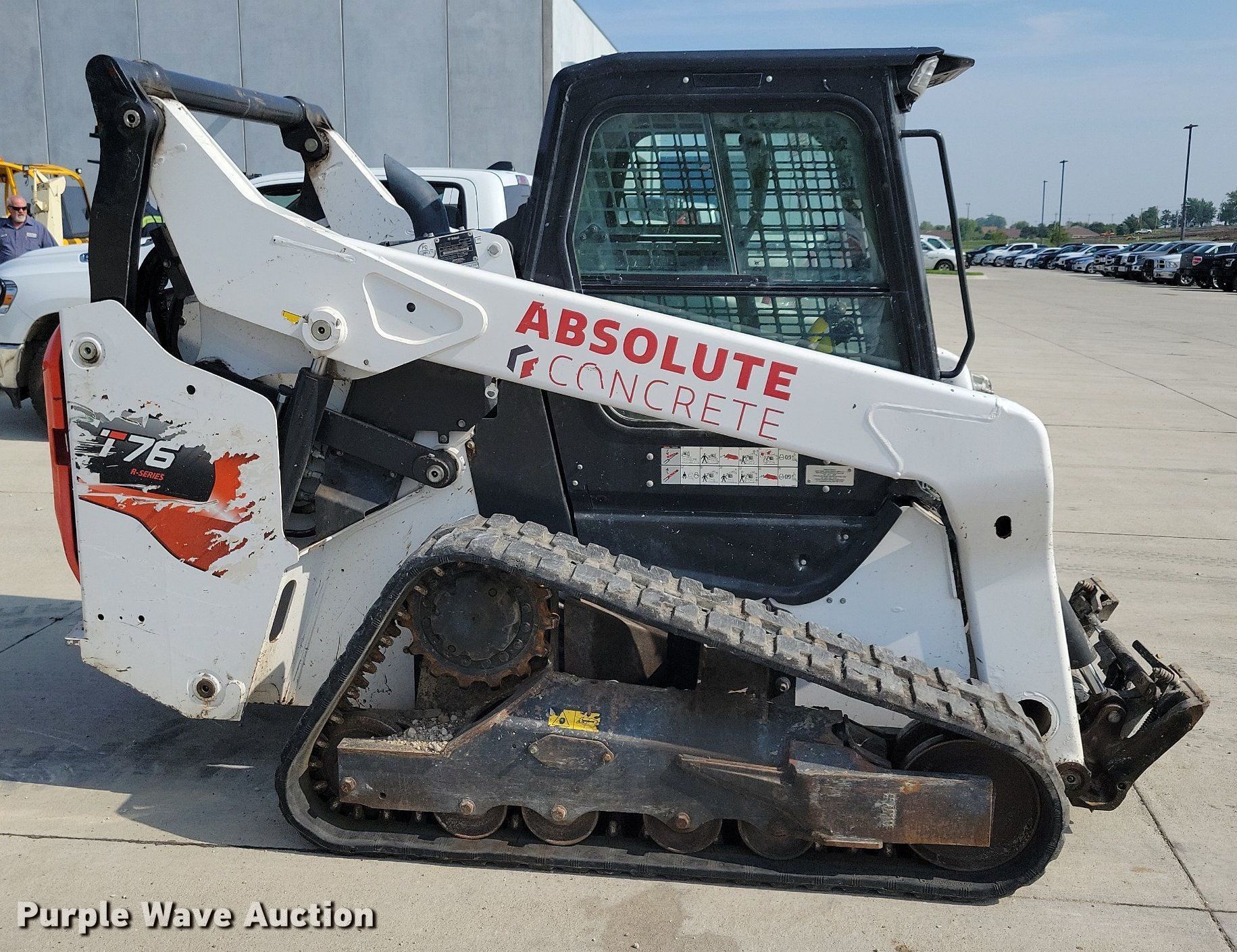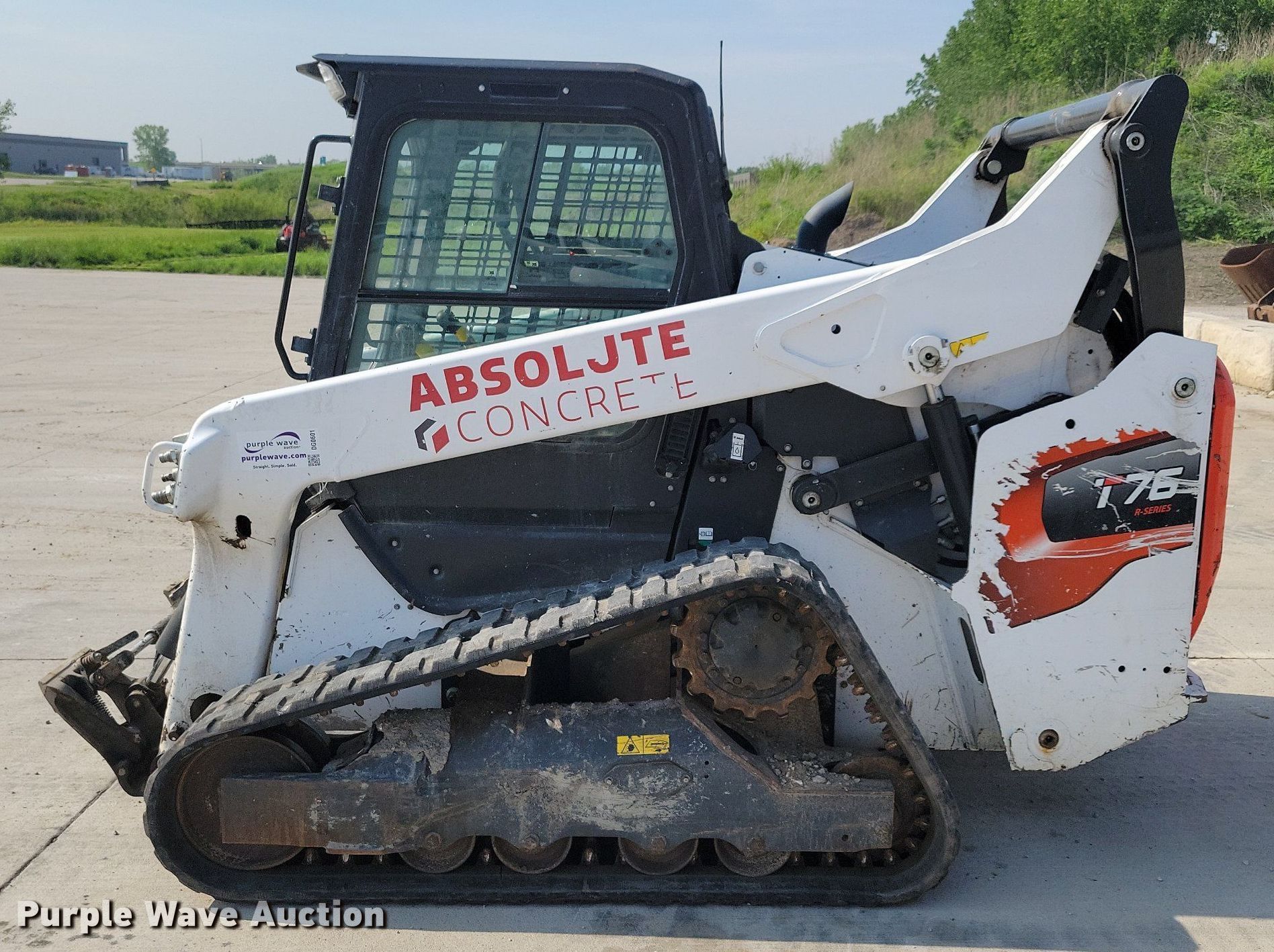 2021 Bobcat T76 tracked skid steer loader. Hours: 2,642 on meter, Serial: B4CE14191. Engine Bobcat, Displacement: 2.4L, Cylinders: 4, Fuel type: Diesel. Transmission Hydrostatic, Two speed travel. Operators station Enclosed cab, AC, Heat, Bucket control: Hand, Pattern changer, Electronic Monitoring System panel. Features Auxiliary hydraulics, Auxiliary electrical outlet, Quick coupler: Hydraulic. Tracks Width: 12". Notes Intermittent hydraulic issues, Door missing. Absolute Group Company. Granger, IA 50109