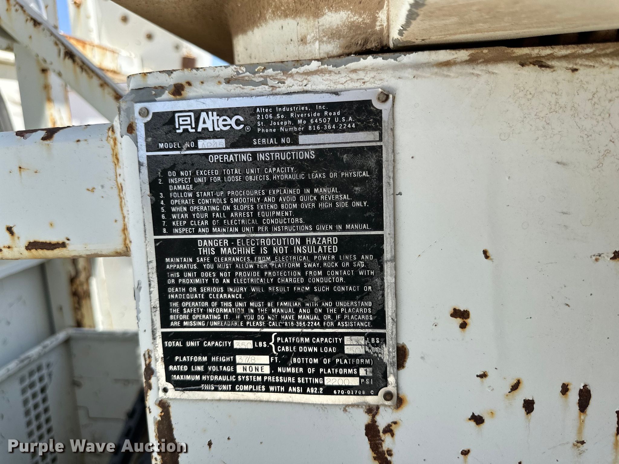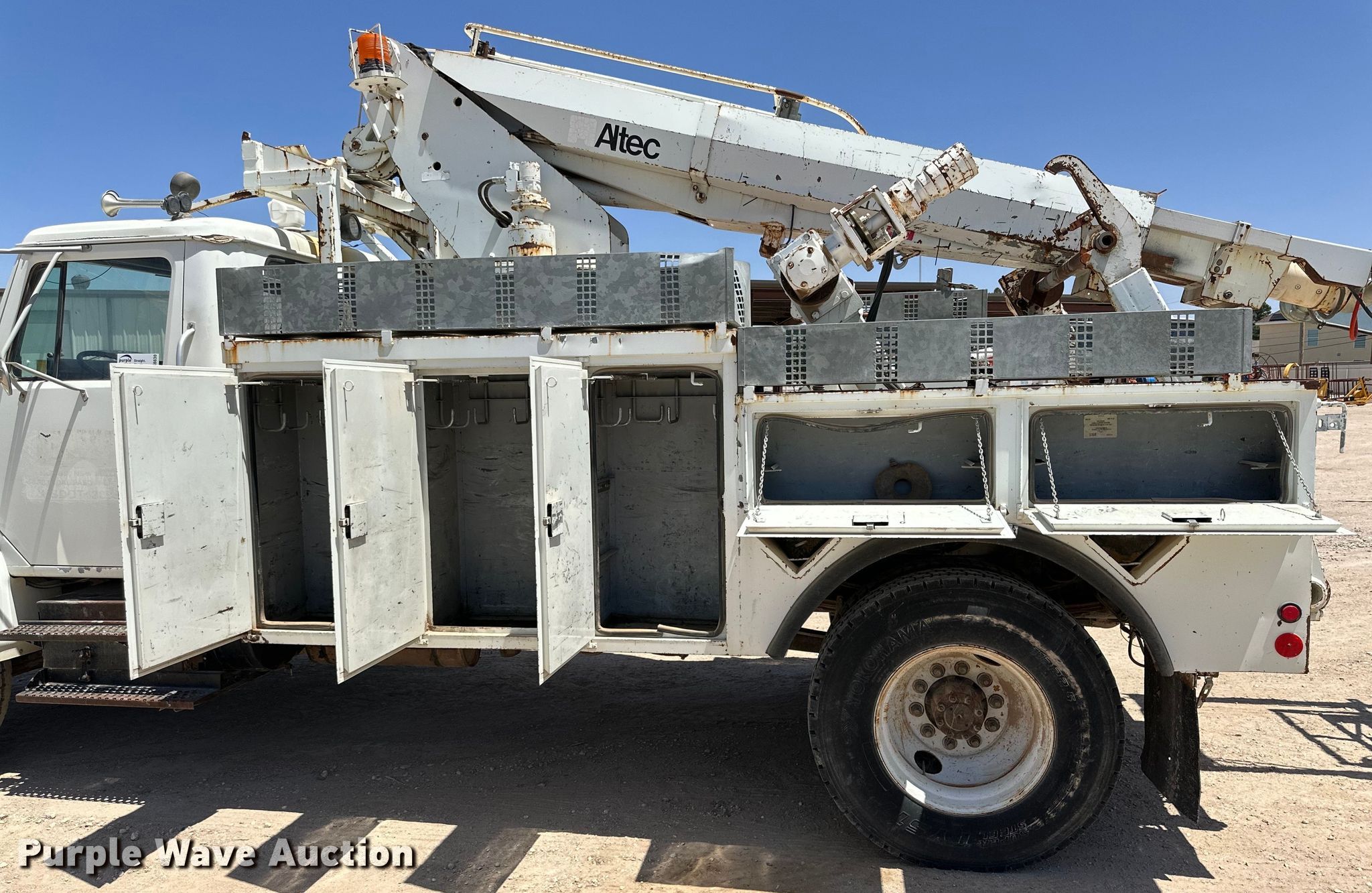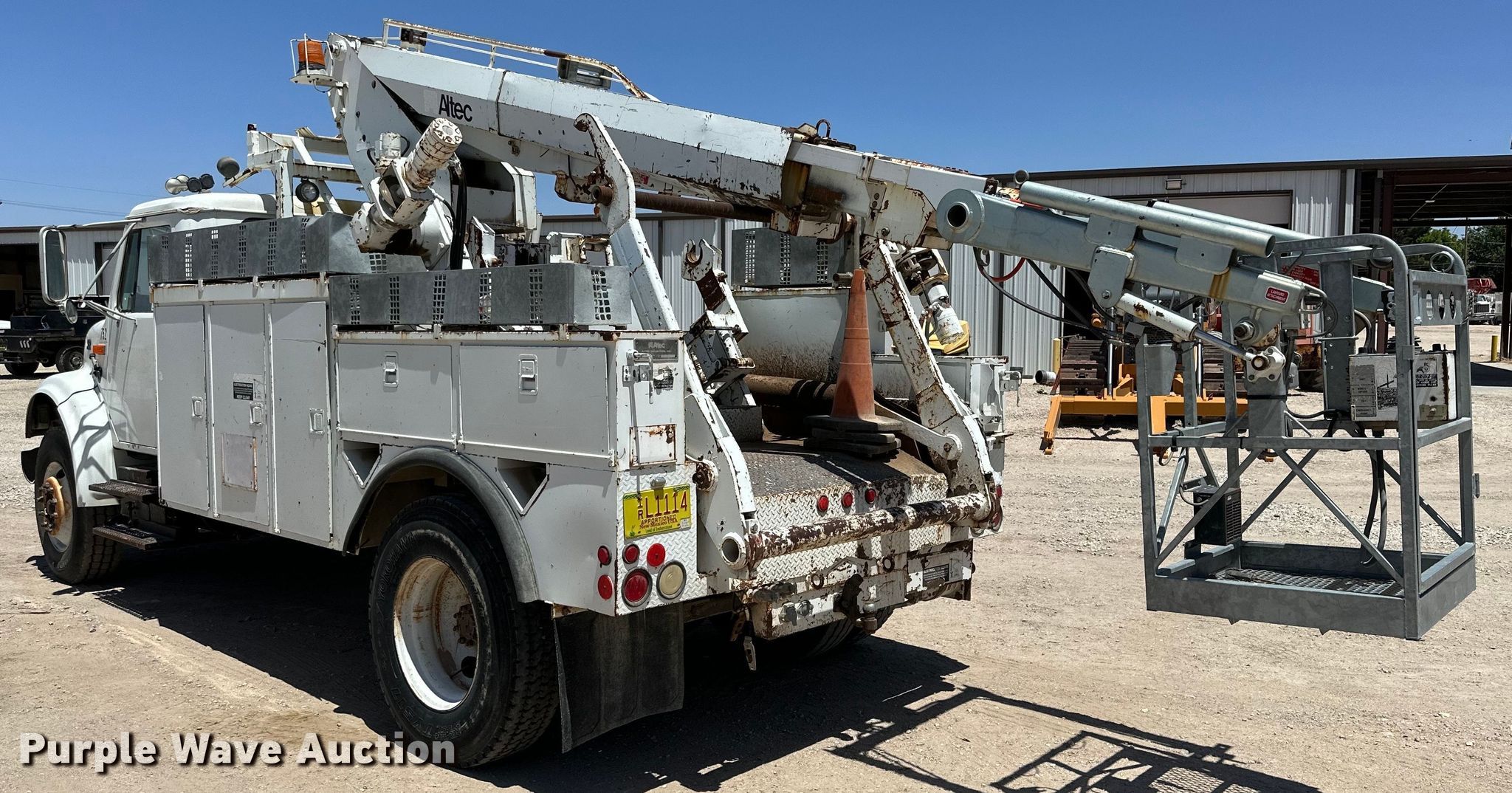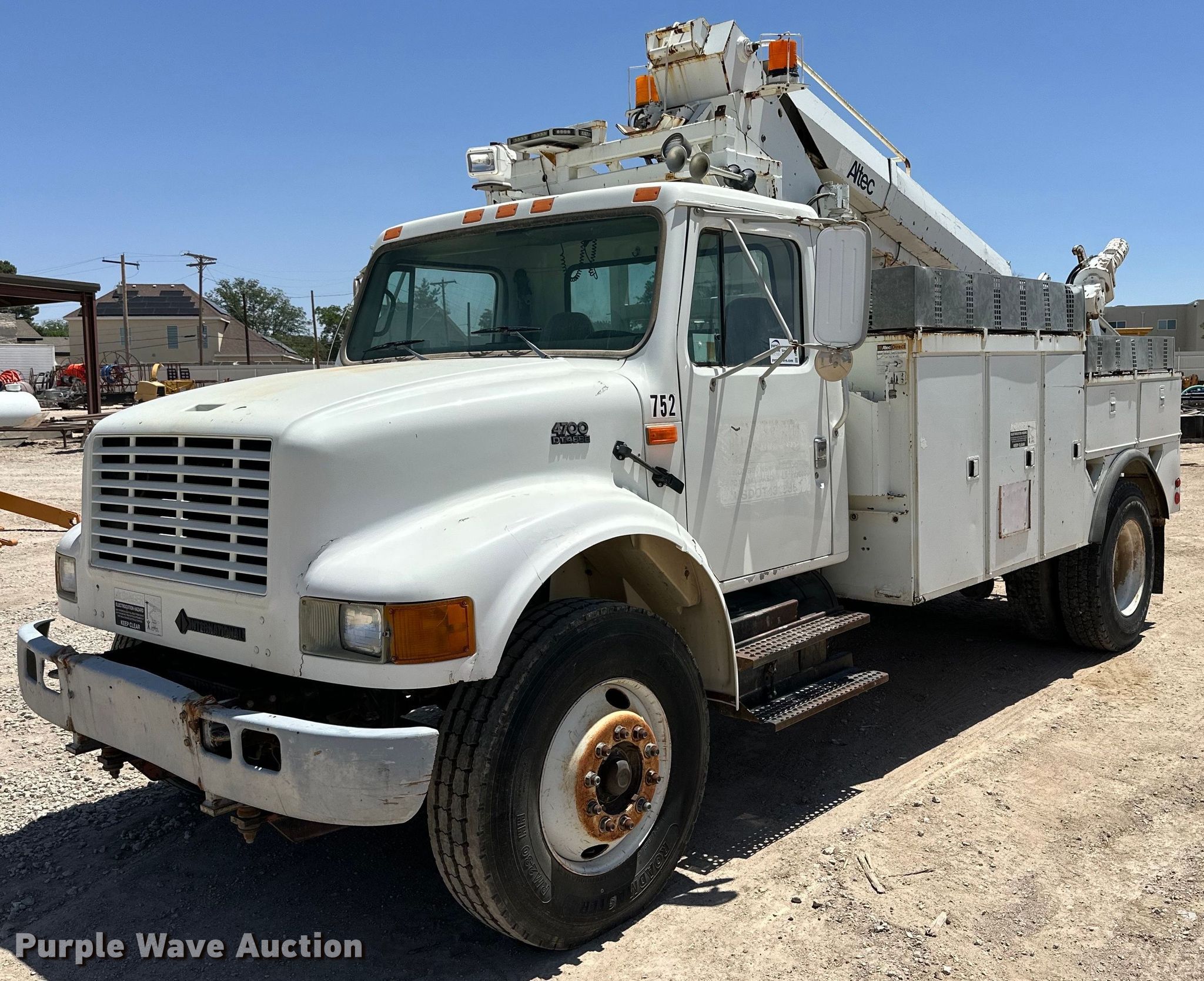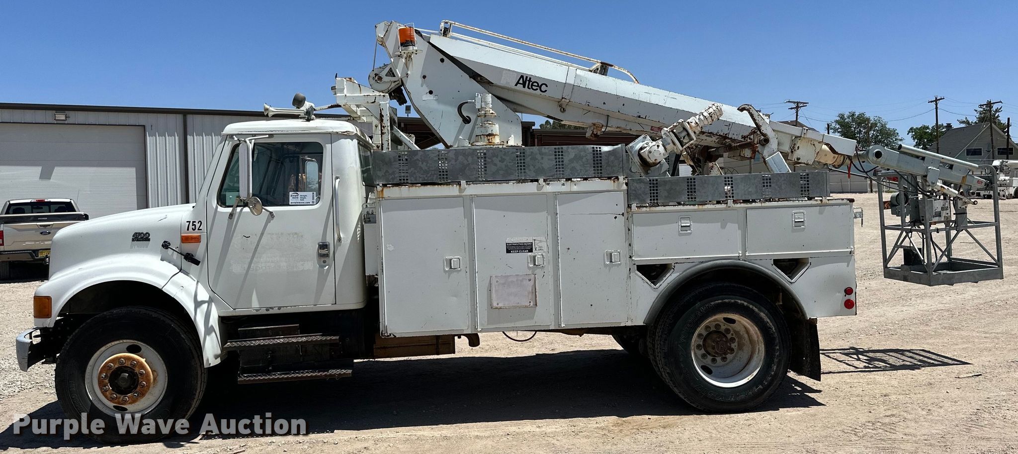 1998 International 4700 bucket truck. Miles: 129,578 on odometer, VIN: 1HTSCAAN9WH562752. Engine Displacement: 7.6L, Cylinders: 6, Fuel type: Diesel. Transmission Allison, Automatic. Chassis Axles: Single, Suspension: Spring, Brakes: Air, PTO, Wheelbase: 176". Interior AC, Heat, Cruise control. Features Bed Altec, Serial: 17-54561, 13' L x 96" W, Boom Altec AP45, Serial: 1097R00578, Maximum lift capacity: 350 lbs, Maximum lift height: 38', Boom type: Articulating, Man basket, Boom controls Ground, Platform/ basket.. Tires Size: 11R22.5. Notes Dash warning indicator: Warn engine, Unknown operating condition of platform controls. New Mexico title. Shalom Equipment LLC. Hobbs, NM 88240