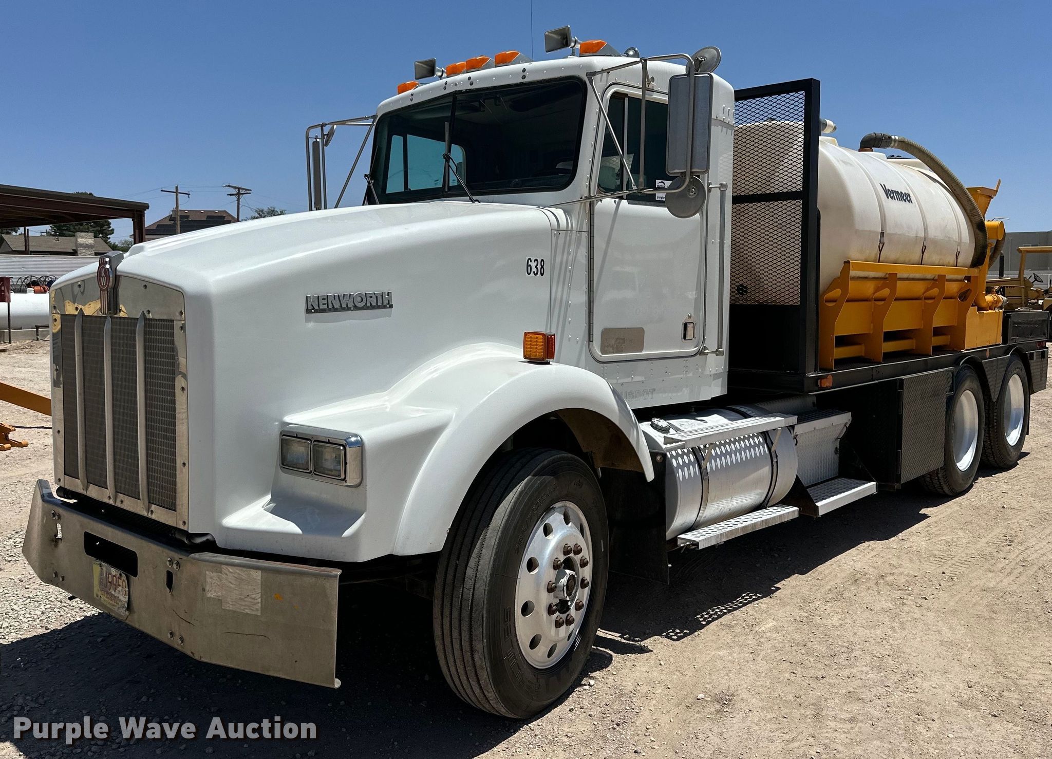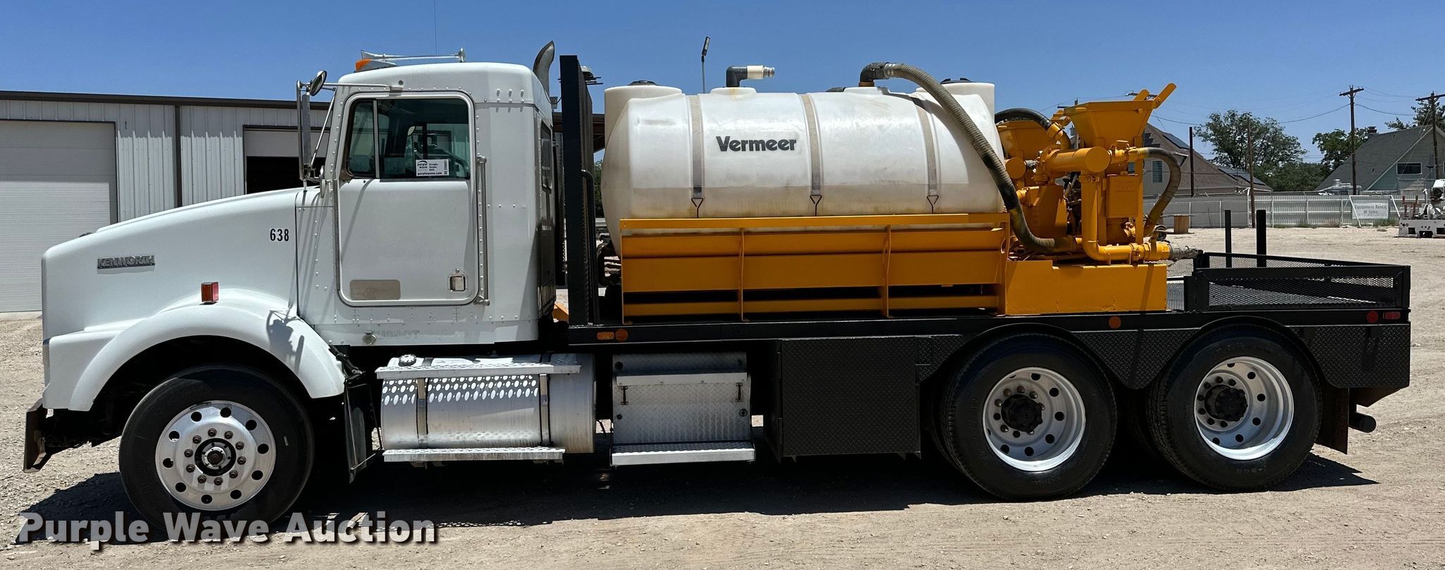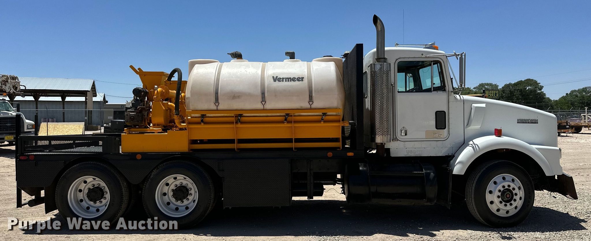 1996 Kenworth T800 flatbed truck with mud mixing system. Miles: 225,693 on odometer, VIN: 1XKDDB9X9TS724638. Engine Caterpillar, Displacement: 14.6L, Cylinders: 6, Fuel type: Diesel. Transmission Manual, Speed: 9. Chassis Axles: Tandem, Differential lock: Inter-axle, Suspension: Air Dump valves, Brakes: Air, PTO. Interior AC, Heat, Heated mirrors, Cruise control, Auxiliary controls. Features Flatbed 17' L x 100" W, (2) Vermeer mud mixing systems Tank capacity: 750 gallons, Kohler two cylinder gasoline engine.. Tires Size: 285/75R24.5. New Mexico title. Shalom Equipment LLC. Hobbs, NM 88240