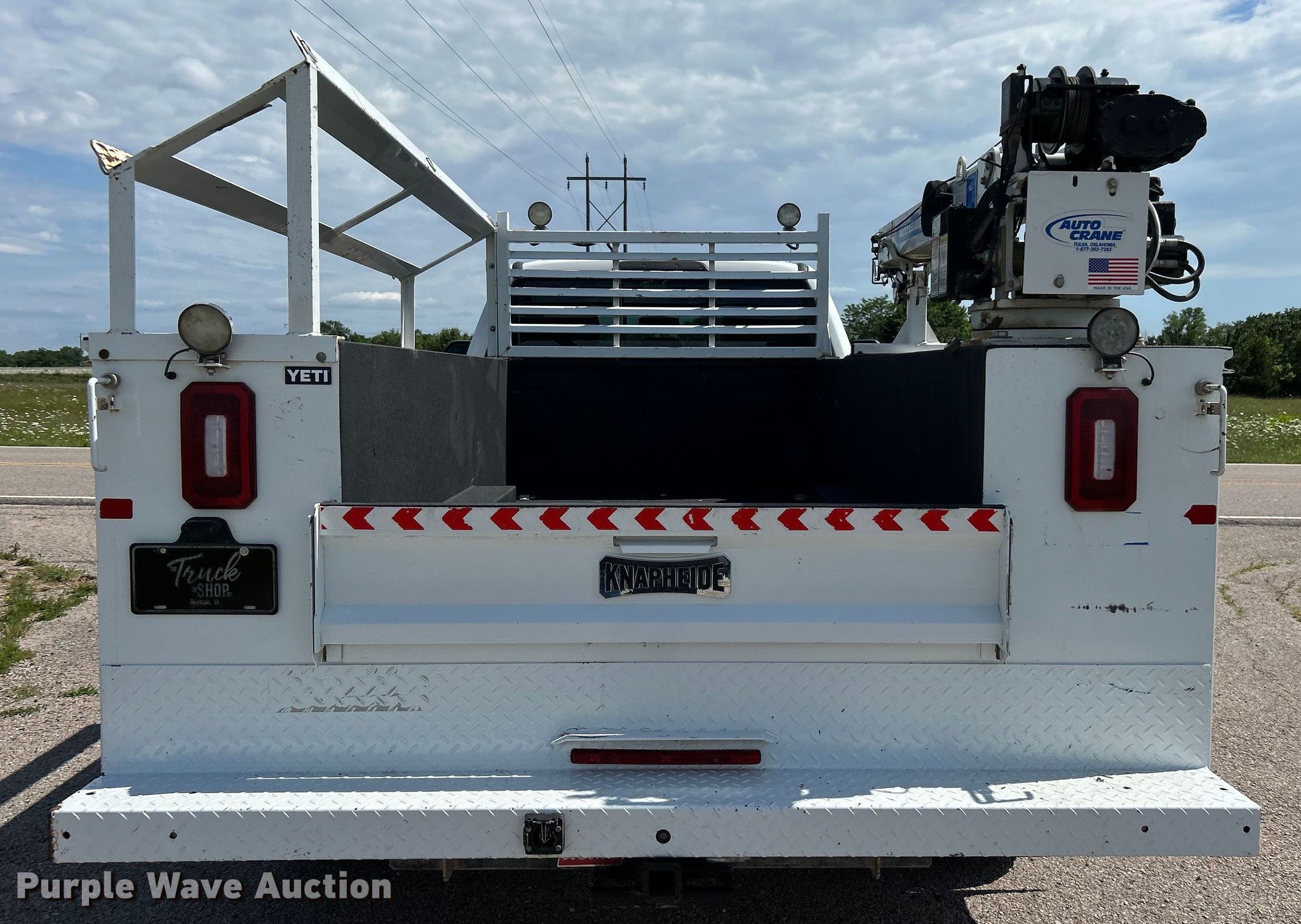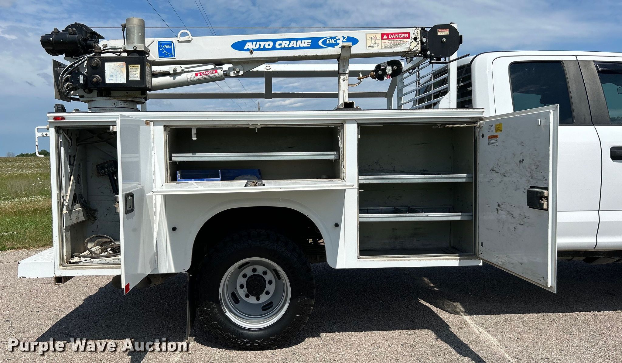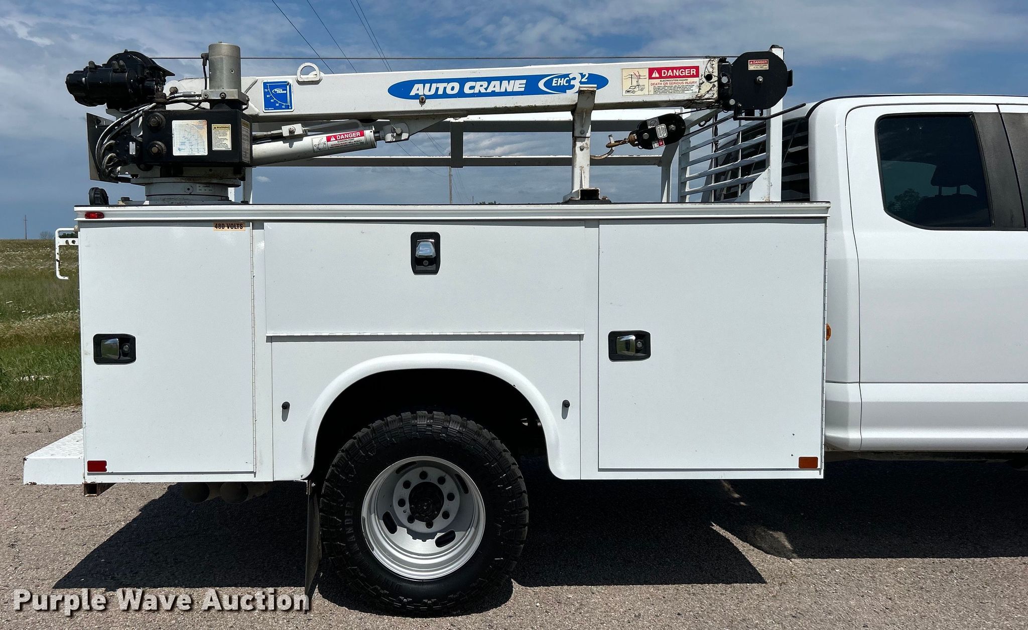 2019 Ford F350 Super Duty XL SuperCab utility bed pickup truck. Miles: 185,387 on odometer, VIN: 1FD8X3HT2KEE06622. Engine Displacement: 6.7L V8 OHV, Cylinders: 8, Fuel type: Diesel. Transmission Automatic. Chassis Four wheel drive, Axles: Single, Suspension: Spring, Brakes: Hydraulic. Interior AC, Heat, Heated mirrors, Power windows, Power locks, Cruise control, Auxiliary controls, Brake controller. Features Bed Knapheide, 9' L x 94" W, Crane Auto Crane EHC32, Maximum boom length: 15'4" Maximum lift capacity: 3,200 lbs.. Tires Size: LT245/85R17. Oklahoma title. The Truck Shop. Okemah, OK 74859