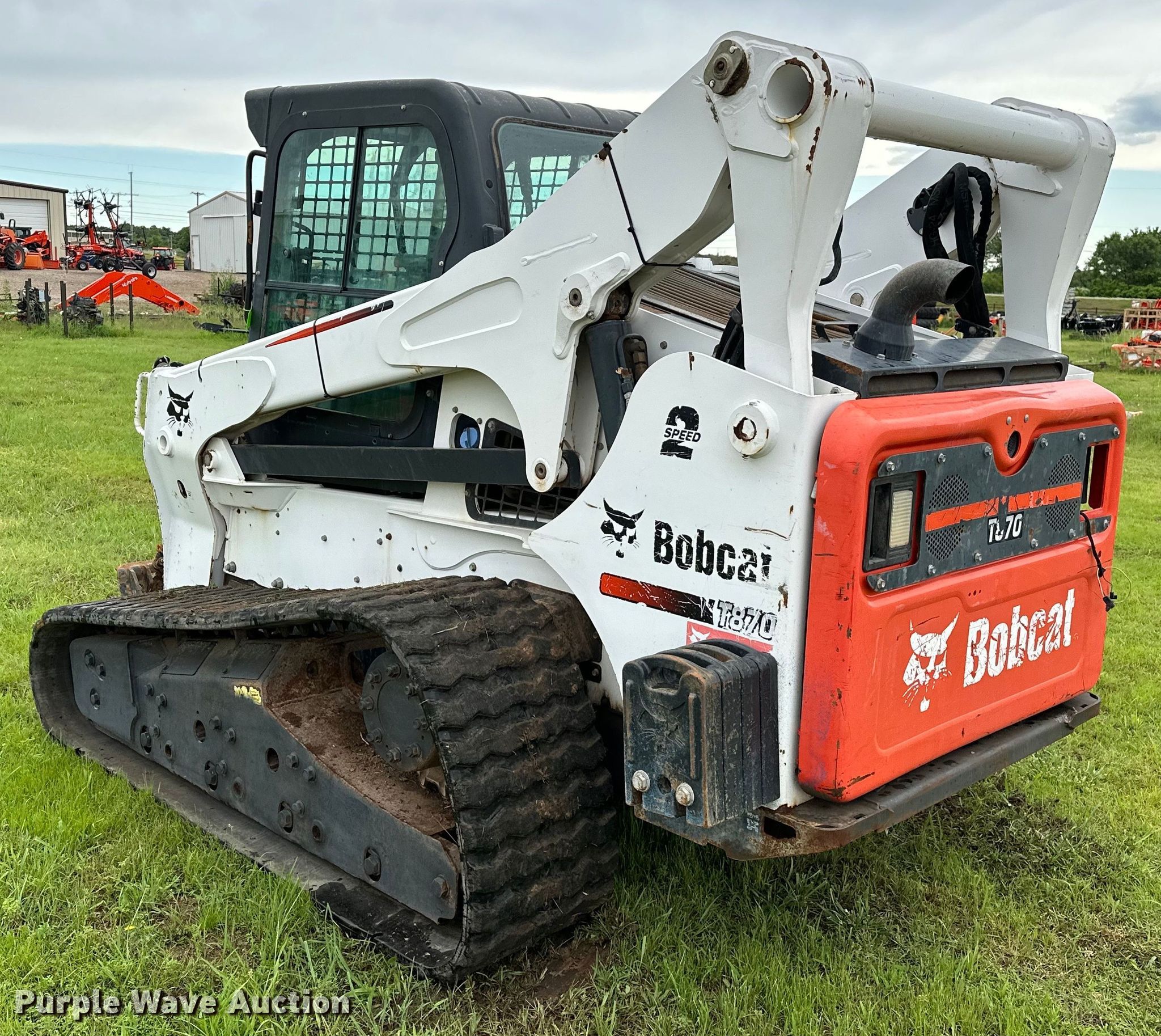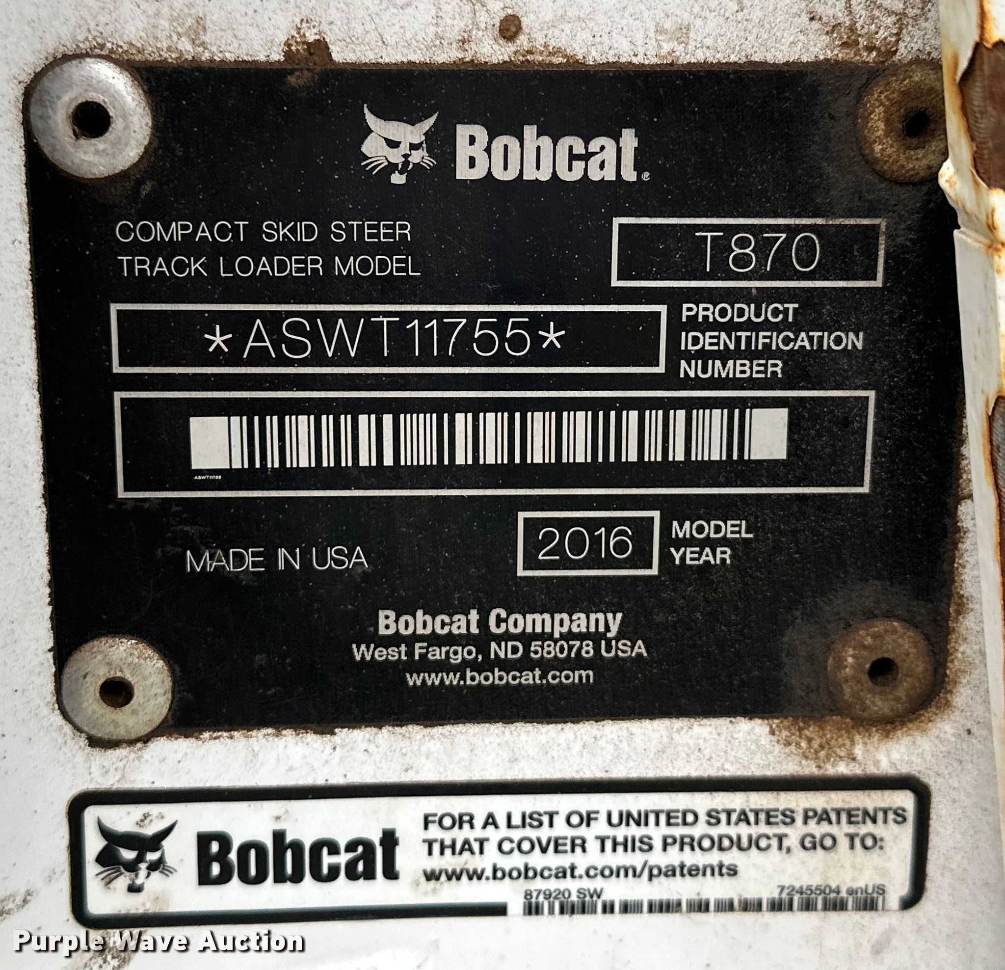 Purple Wave is selling a used Tracked Skid Steer Loader in Oklahoma. This item is a 2016 Bobcat T870 tracked skid steer loader with the following: Hours: 3,101 on meter, Serial: ASWT11755