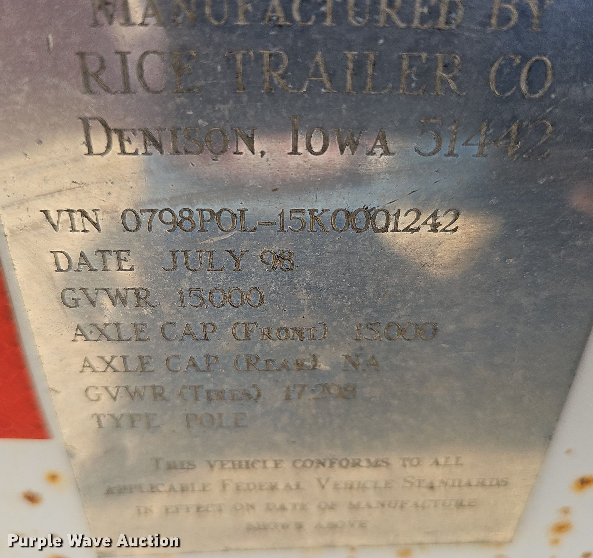 Purple Wave is selling a used Trailer Other in Nebraska. This item is a 1998 Rice Trailer Co. Pole pole trailer with the following: VIN: 0798POL15K0001242