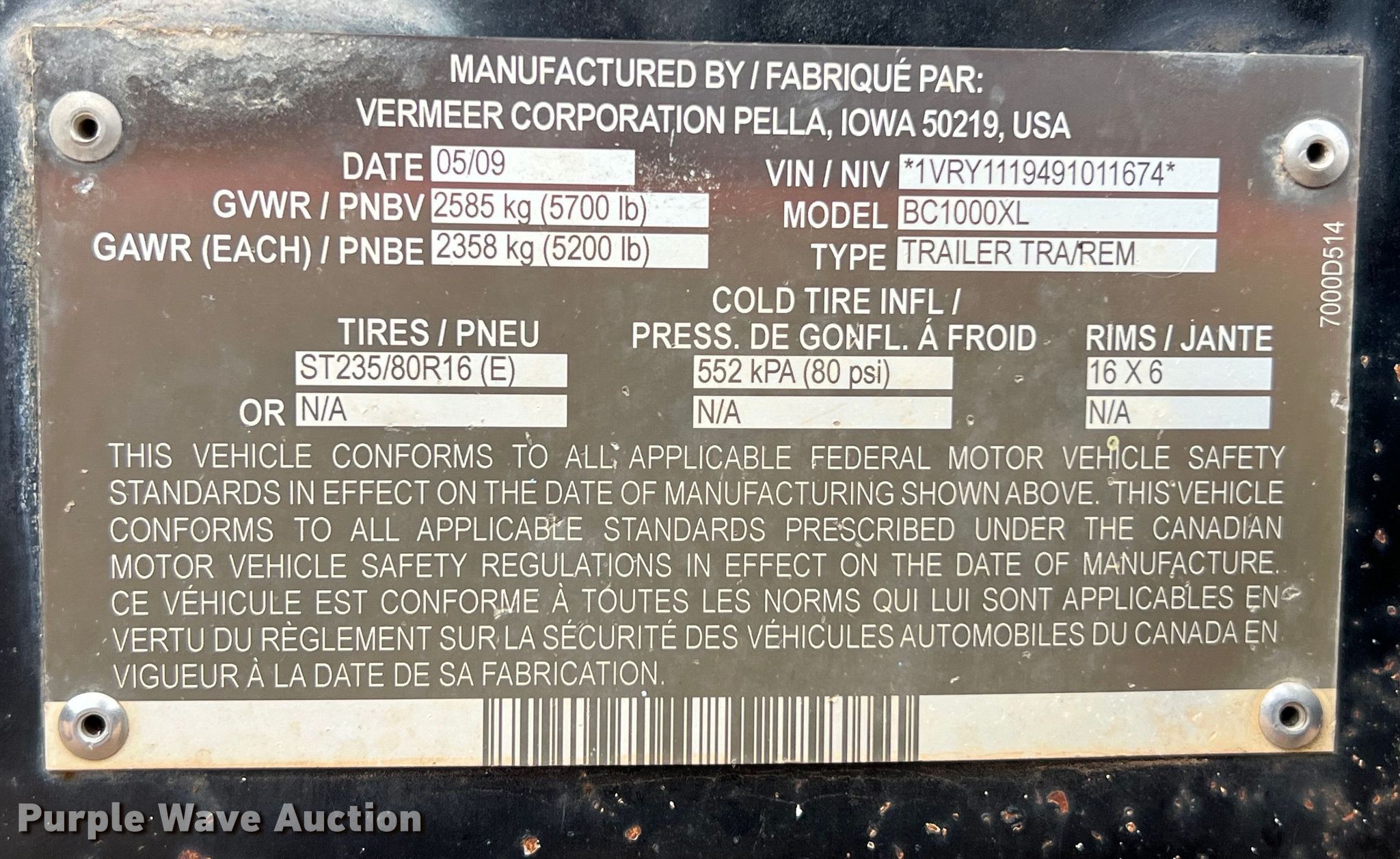 2009 Vermeer BC1000XL wood chipper. Hours: 249 on meter, VIN: 1VRY1119491011674, Unit #: 225. Engine Cummins, Cylinders: 4, Fuel type: Diesel. Features Capacity: 12", Throat opening: 18" x 15", Auto feed. Trailer Vermeer, 13' L x 62" W, Hitch: Pintle, Suspension: Spring, Brakes: Electric, Axles: Single, Tire size: 235/80R16, GVWR: 5,700 lbs, GAWR: 5,200 lbs. Notes Dead battery. Transfer of ownership documentation will be a bill of sale. J&N Utilities. 6849 East Highway 80. Abilene, TX 79601