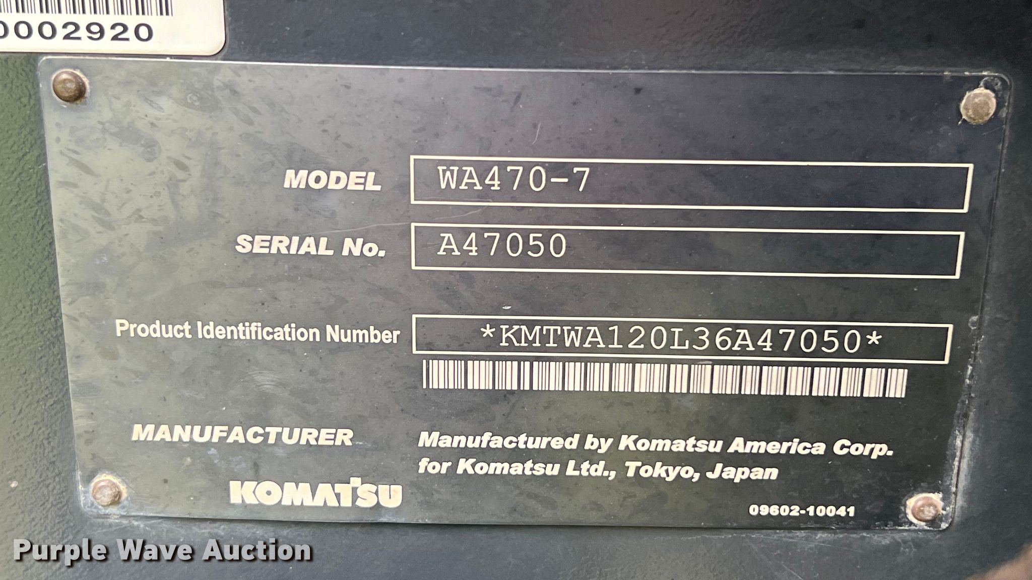 Purple Wave is selling a used Wheel Loader in Texas. This item is a 2014 Komatsu WA470-7 wheel loader with the following: Hours: 6,493 on meter, Serial: A47050