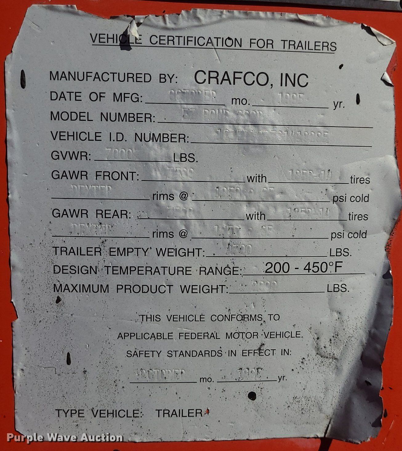 Crafco E-Z Pour pothole patcher. Capacity: 200 gallon, Hitch: Pintle. Tires Size: ST215/75R14. Notes No engine, Non-operational unit. This is worksite support equipment and will not come with a title. Transfer of ownership documentation will be a bill of sale. Millers Pro-Cut Inc.. 5900 E 154 Terrace. Grandview, MO 64030