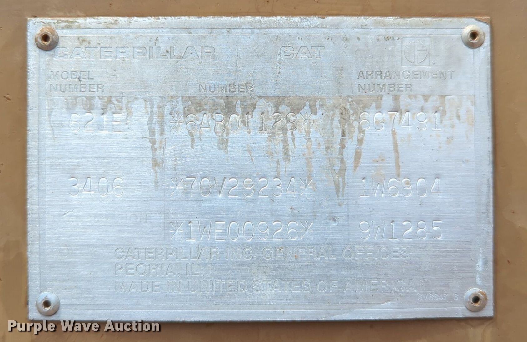 1988 Caterpillar 621E elevating scraper. Hours: 20,460 on meter, Serial: 6AB01129. Engine Caterpillar 3406, Serial: 70V29234, Cylinders: 6, Fuel type: Diesel. Transmission Powershift, 8F - 1R. Chassis Brakes: Hydraulic. Features Bowl capacity: 20 cu.yd., Cushion hitch, Elevator reverse, Hydraulic lift, Scraper controls: Lever controls No. of controls: 3. Tires Size: 33.25-29. Notes Door glass missing, Glass cracked. Sandstone Construction Retirement Auction - Open Inspection June 19th. 500 N Bryant Ave. Oklahoma City, OK 73117