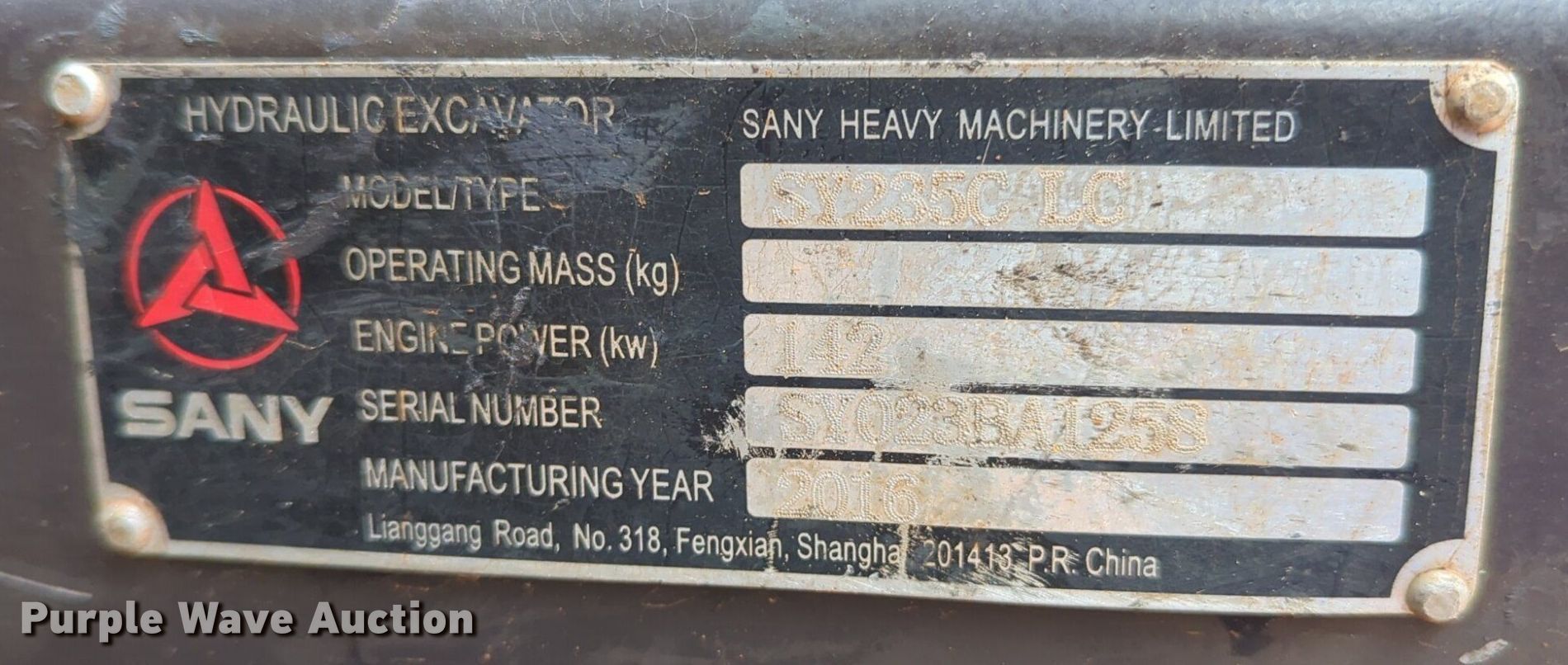 Purple Wave is selling a used Hydraulic Excavator in Oklahoma. This item is a 2016 Sany SY235C excavator with the following: Serial: SY023BA1258