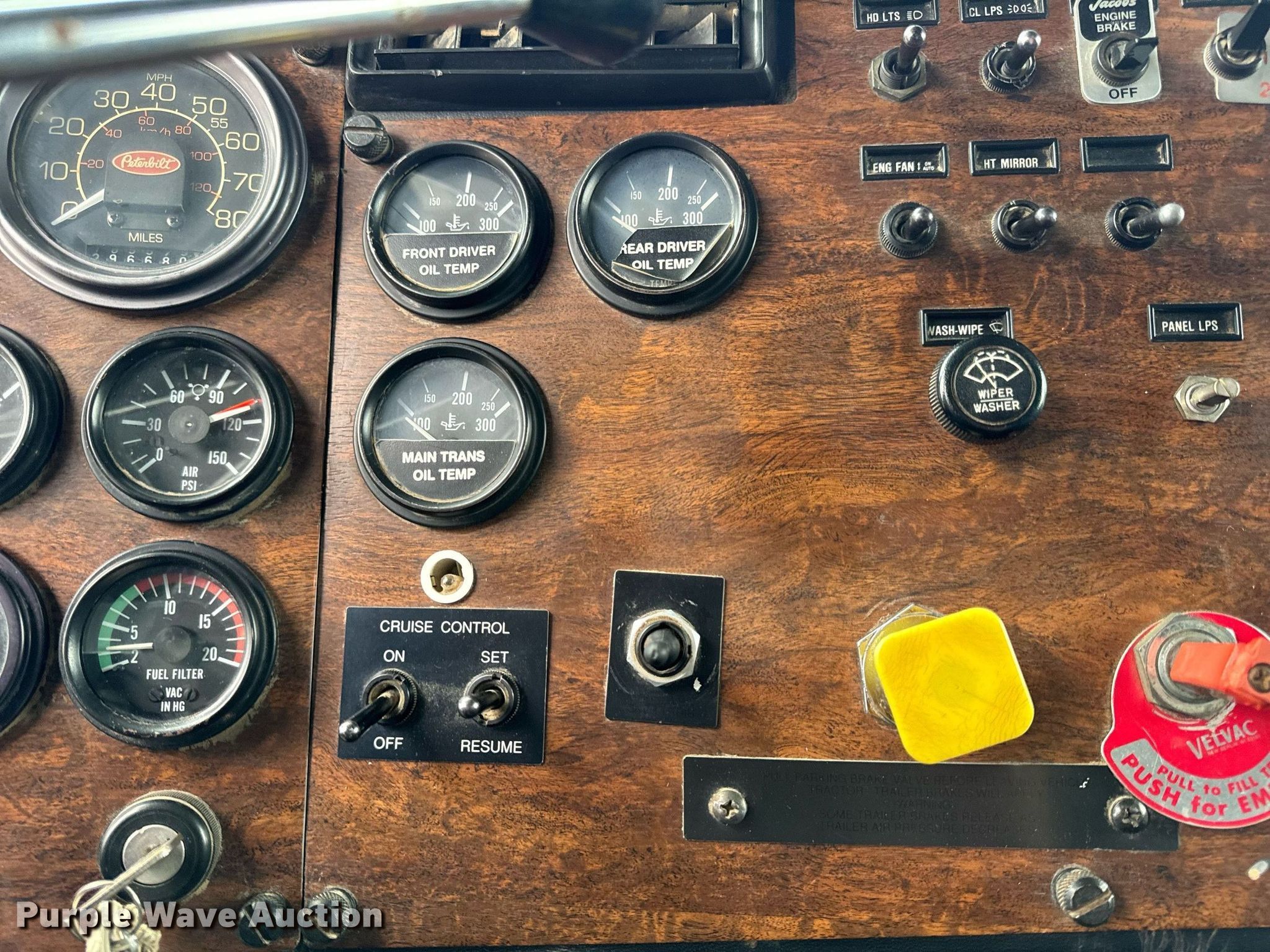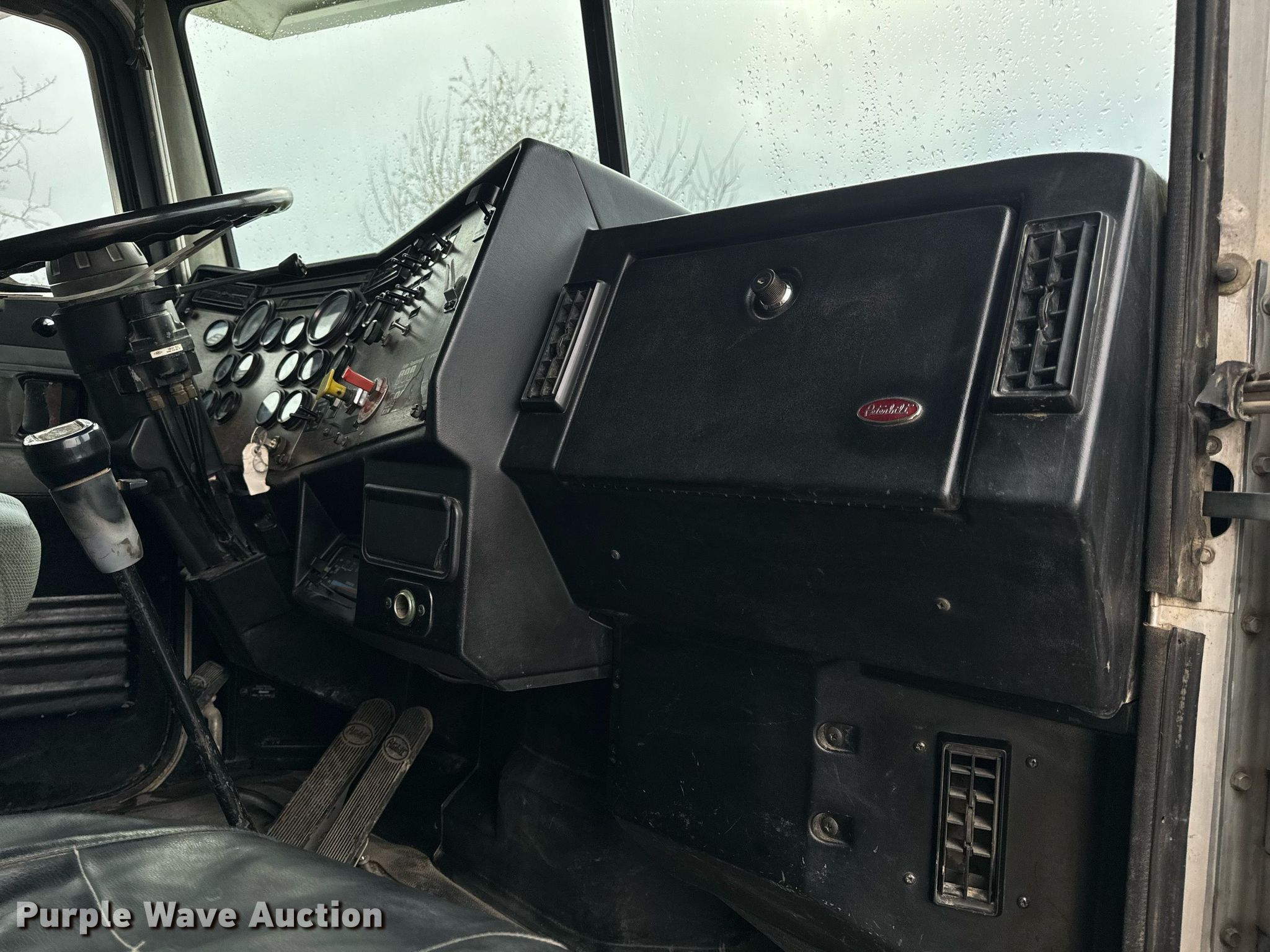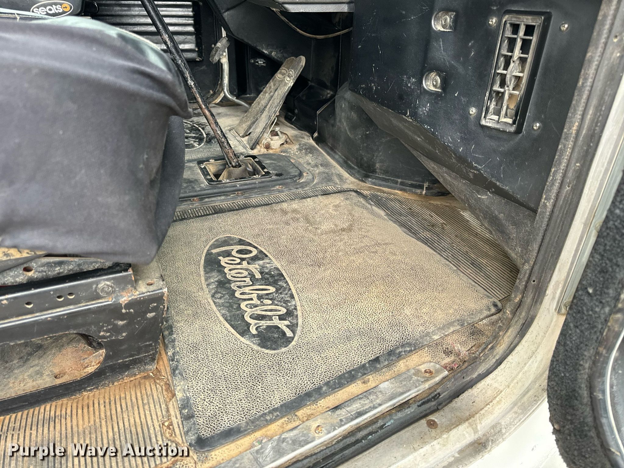 1989 Peterbilt 357 dump truck. Miles: 296,681 on odometer, Hours: 4,332 on meter, VIN: 1XPALBEXXKN273562. Engine Caterpillar C-10, Serial: 3CS18070, Displacement: 14.6L, Cylinders: 6, Fuel type: Diesel, HP: 365, Engine brake. Transmission Eaton Fuller Roadranger, Manual, Speed: 9. Chassis Axles: Triple, Pusher axle, Differential lock: Inter-axle, Suspension: Spring over walking beam, Brakes: Air, PTO. Interior AC, Heat, Heated mirrors, Cruise control. Features Dump bed 15' 6" L x 94" W, Side height: 38", Side board height: 10", Bed type: Steel, Roll tarp, Ram: Single, End gate: Air operated. Tires Front: 315/80R22.5, Rear: 11R22.5, Lift axle: 11R22.5. Notes Non-operational AC, compressor missing, Non-operational roll tarp, Turbo replaced at 291,079 miles, Walking beams and bushing replaced at 291,079 miles. View repairs. Missouri title. GloveCon, Inc. 1200 South Business 54. Fulton, MO 65251