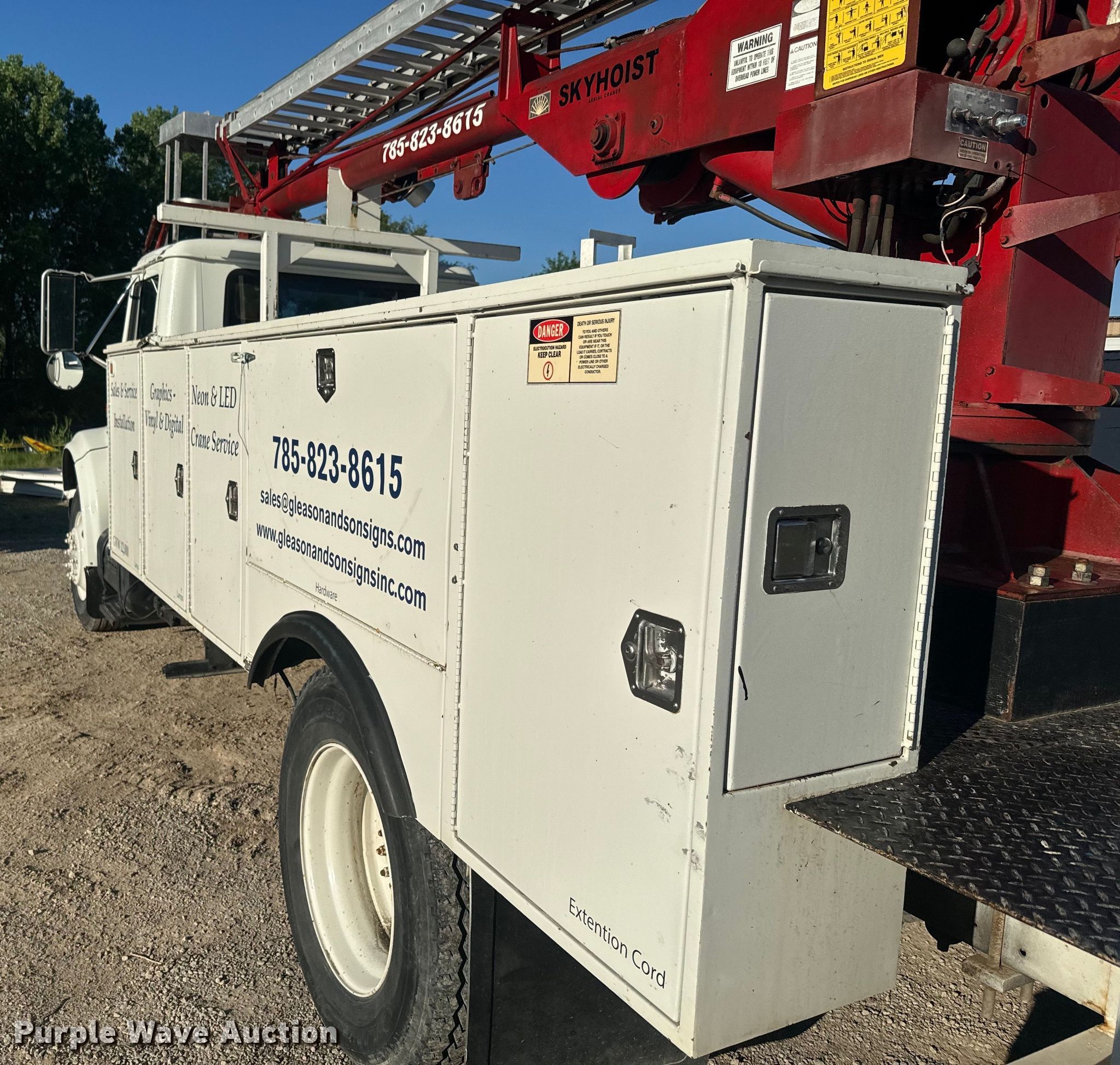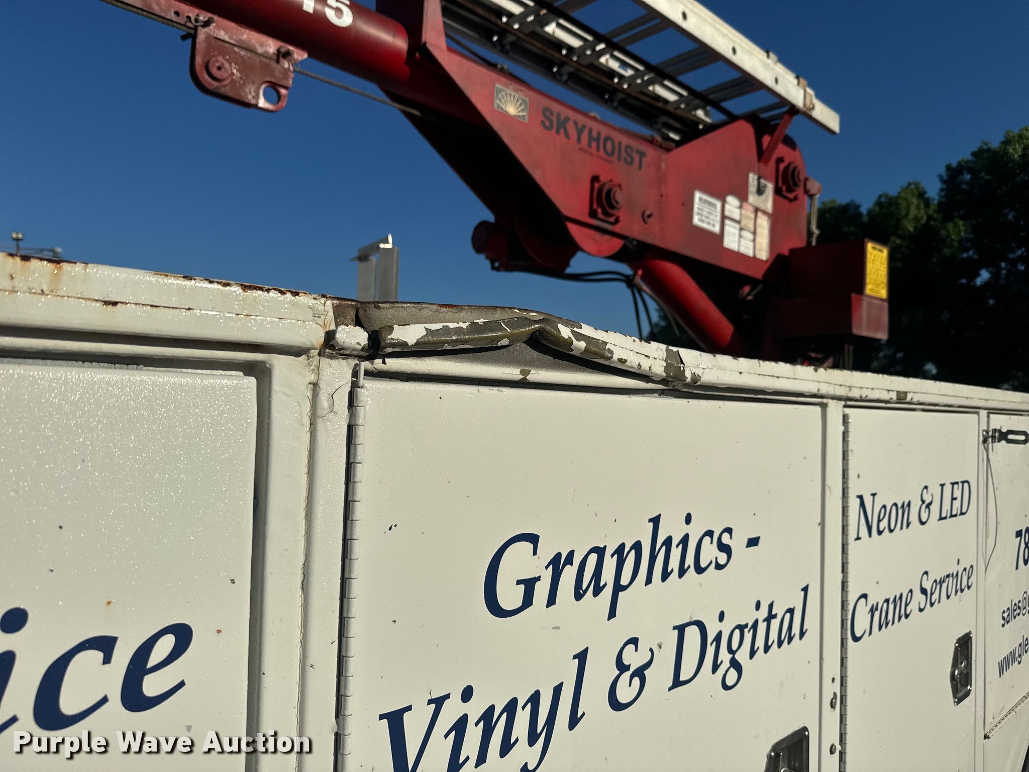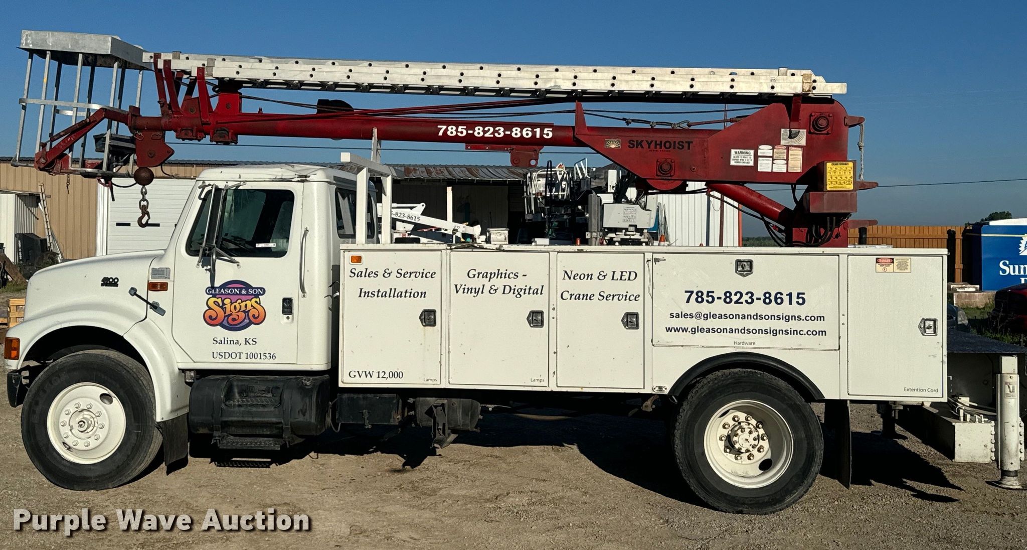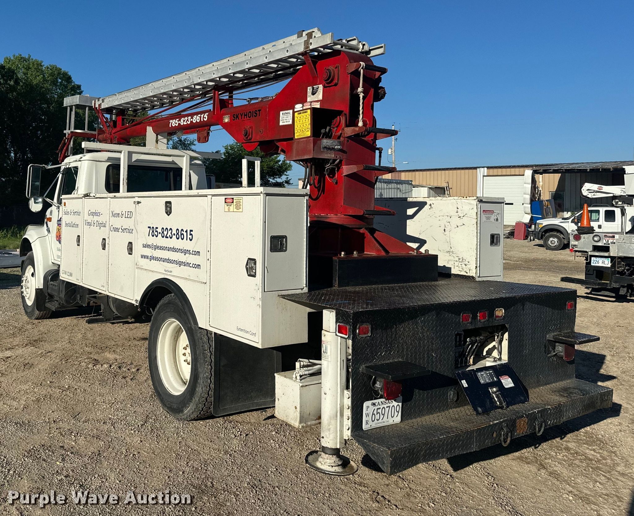 2000 International 4900 crane truck. Miles: 120,003 on odometer, VIN: 1HTSDAAN5YH251917. Engine International Dt466, Displacement: 7.6L, Cylinders: 6, Fuel type: Diesel. Transmission International, Manual, Speed: 6. Chassis Axles: Single, Suspension: Spring, Brakes: Air, PTO. Interior AC, Heat, Cruise control. Features Utility bed 13' 6" L x 100" W, Crane Sky hoist SR53, Serial: SR53-6078-93, Boom Telescopic, Maximum lift capacity: 2,000 lbs, Boom controls Ground, Crane ball & hook. Tires Front: 11R22.5, Rear: 295/75R22.5. Notes Cruise control issue, controls missing, Windshield chipped or cracked, Bucket control issues, needs repaired, Outrigger hydraulic issues. Kansas title. Title distribution may be delayed up to 14 days from verification of funds. Gleason & Son Signs Inc.. Salina, KS 67401