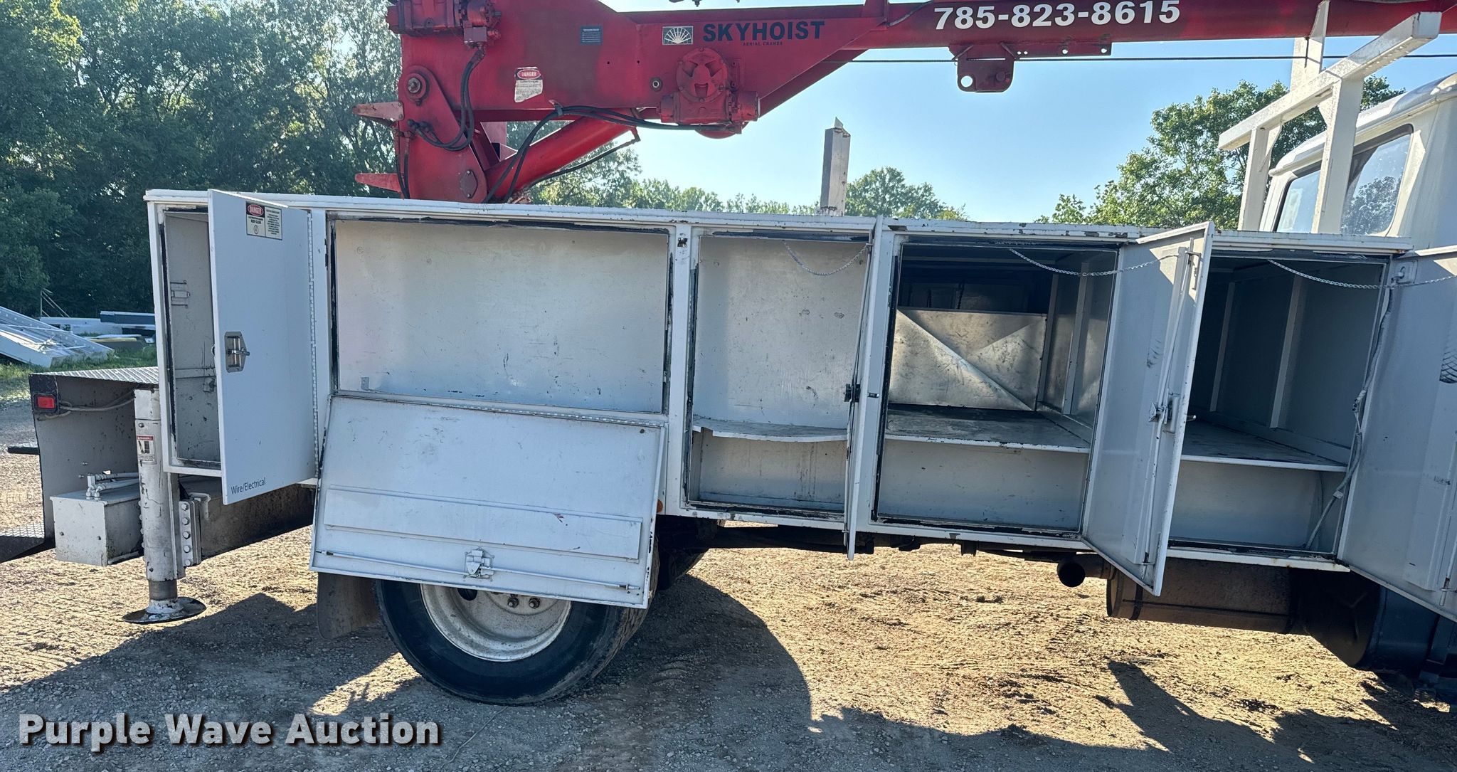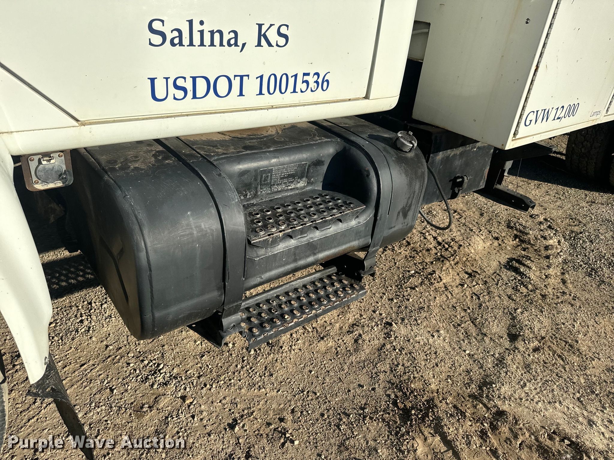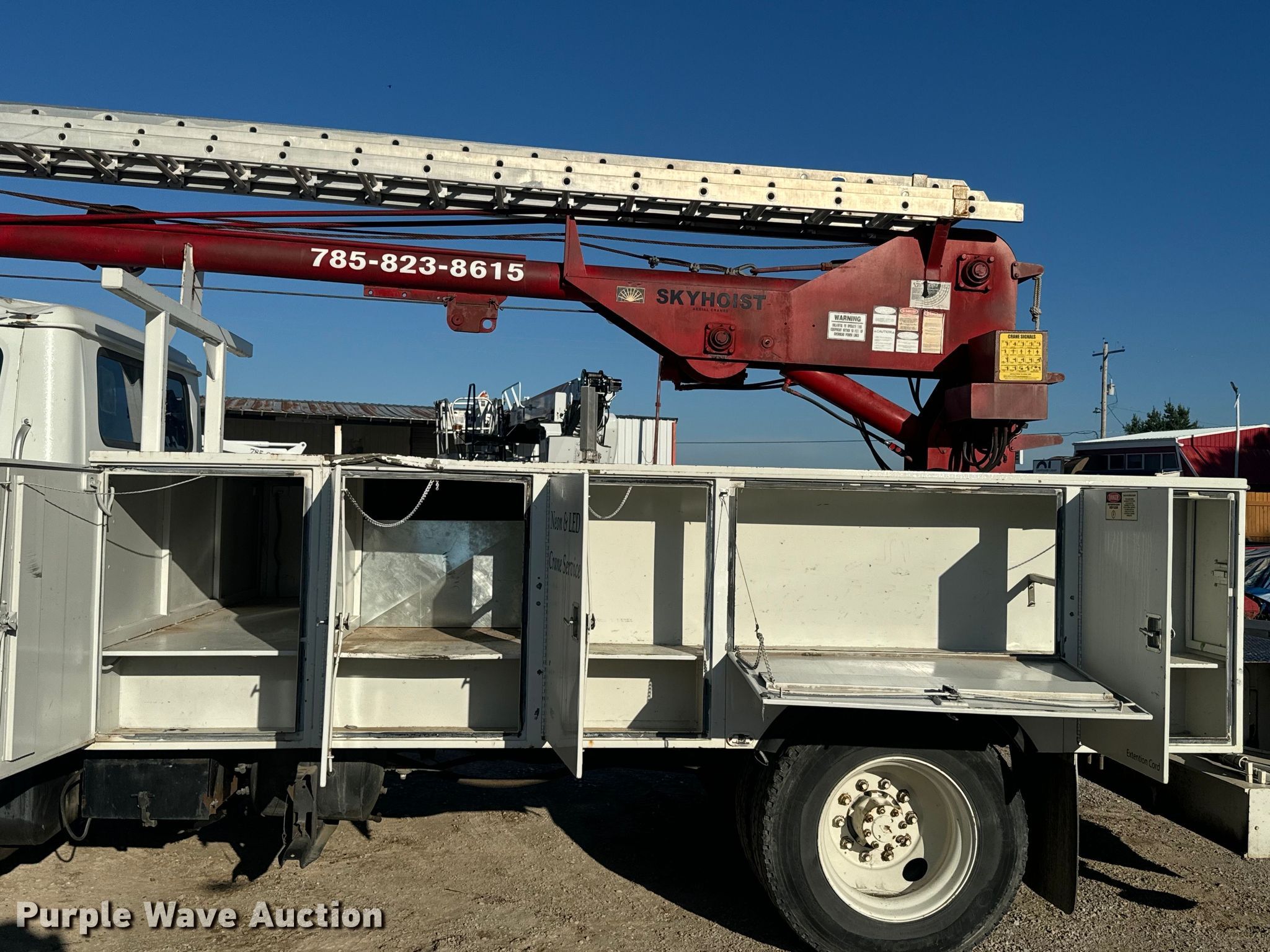 2000 International 4900 crane truck. Miles: 120,003 on odometer, VIN: 1HTSDAAN5YH251917. Engine International Dt466, Displacement: 7.6L, Cylinders: 6, Fuel type: Diesel. Transmission International, Manual, Speed: 6. Chassis Axles: Single, Suspension: Spring, Brakes: Air, PTO. Interior AC, Heat, Cruise control. Features Utility bed 13' 6" L x 100" W, Crane Sky hoist SR53, Serial: SR53-6078-93, Boom Telescopic, Maximum lift capacity: 2,000 lbs, Boom controls Ground, Crane ball & hook. Tires Front: 11R22.5, Rear: 295/75R22.5. Notes Cruise control issue, controls missing, Windshield chipped or cracked, Bucket control issues, needs repaired, Outrigger hydraulic issues. Kansas title. Title distribution may be delayed up to 14 days from verification of funds. Gleason & Son Signs Inc.. Salina, KS 67401