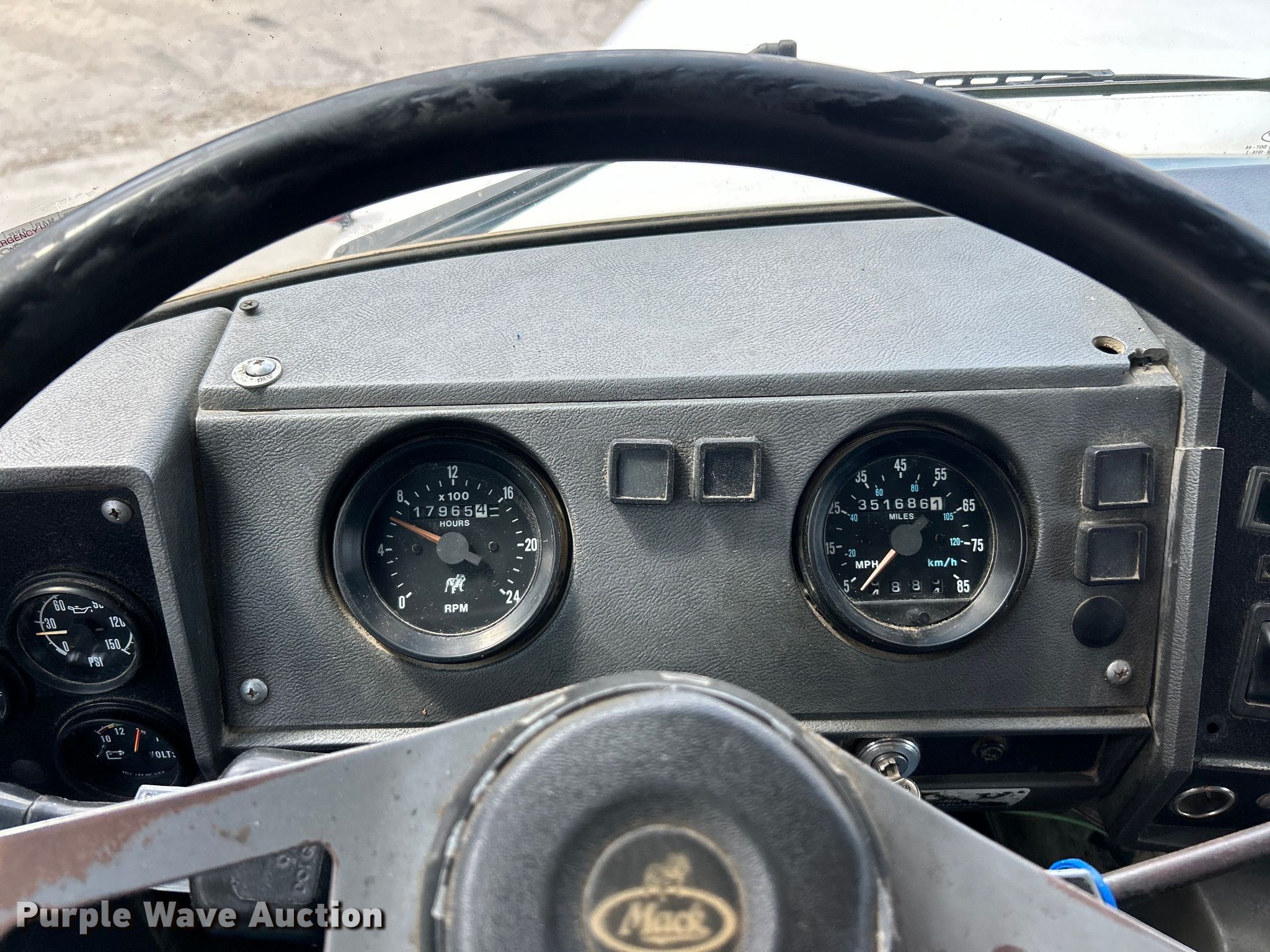 1999 Mack DM690S dump truck. Miles: 351,686 on odometer, Hours: 17,965 on meter, VIN: 1M2B209C6XM023491. Engine Displacement: 12.0L, Cylinders: 6, Fuel type: Diesel. Transmission Mack Maxitorque T2070, Manual, Speed: 7. Chassis Double frame, Axles: Triple, Pusher axle, Suspension: Camelback, Brakes: Air, PTO. Interior AC, heat, Cruise control. Features Dump bed 16' L x 96" W, Side height: 51", Side board height: 16", Bed type: Steel, Roll tarp, Ram: Single, End gate: Air operated. Tires Front: 425/65R22.5, Rear: 11R22.5, Lift axle: 255/70R22.5. Missouri title. M&H Concrete Contractors Inc.. St. Peters, MO 63376