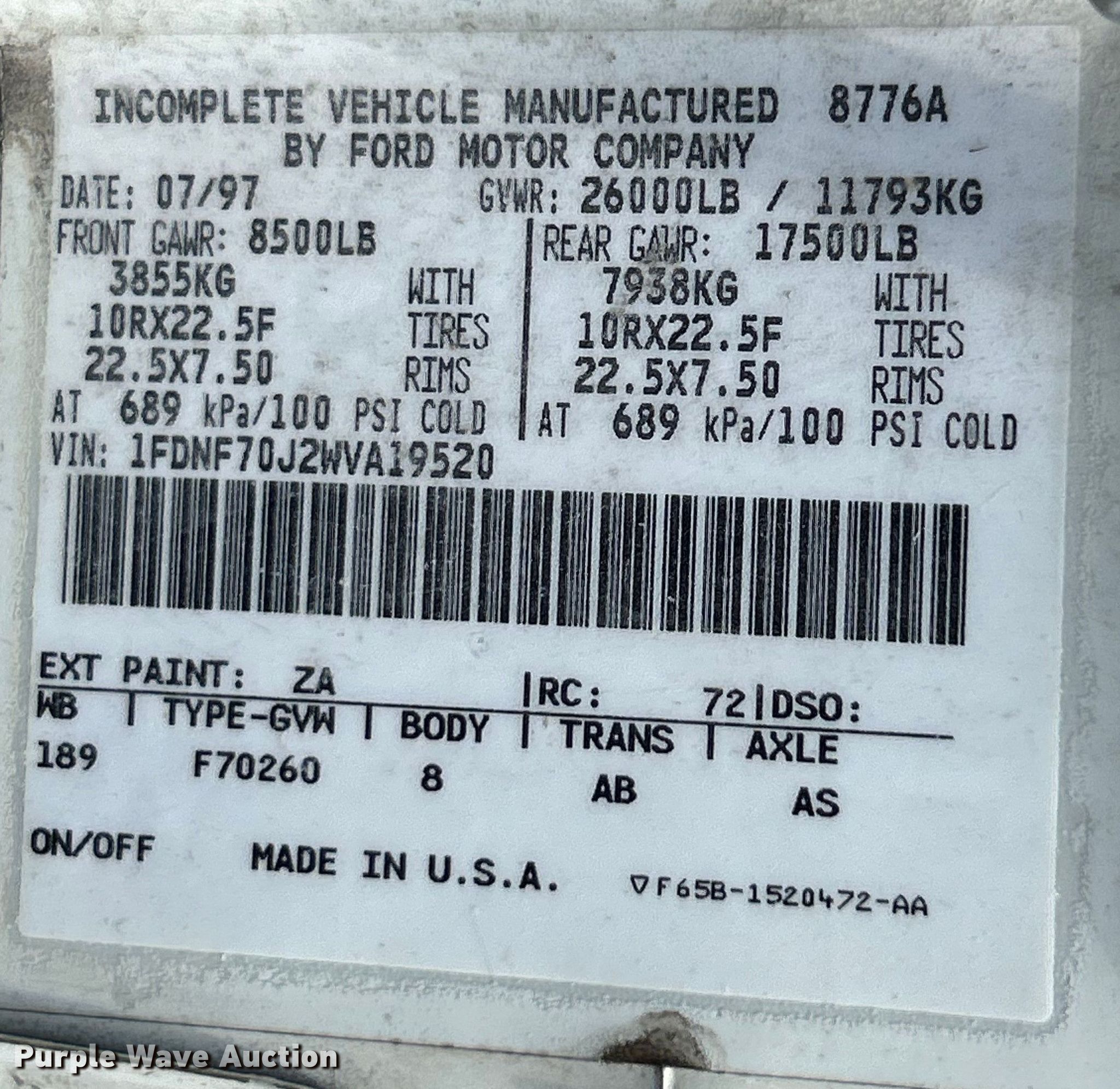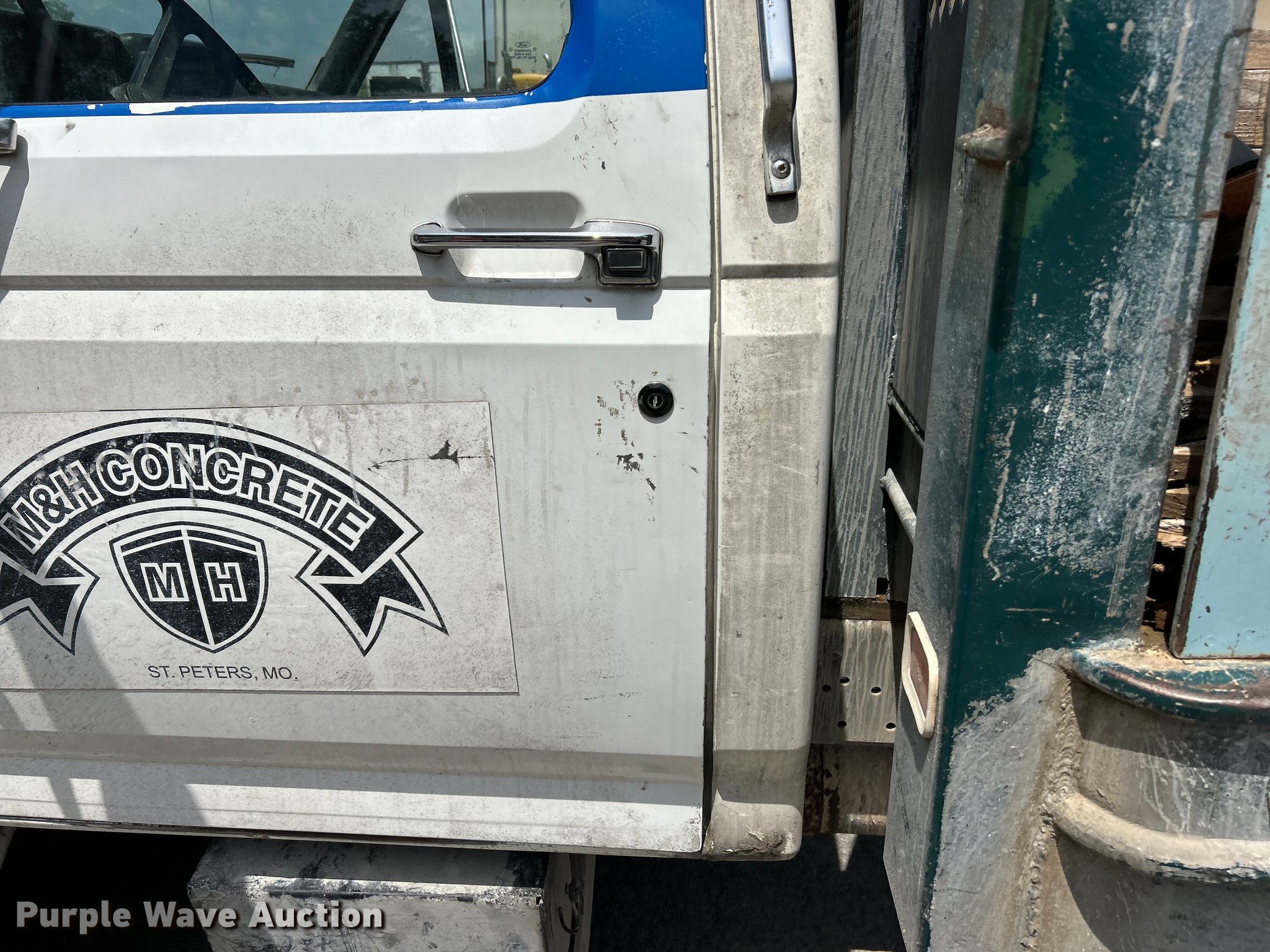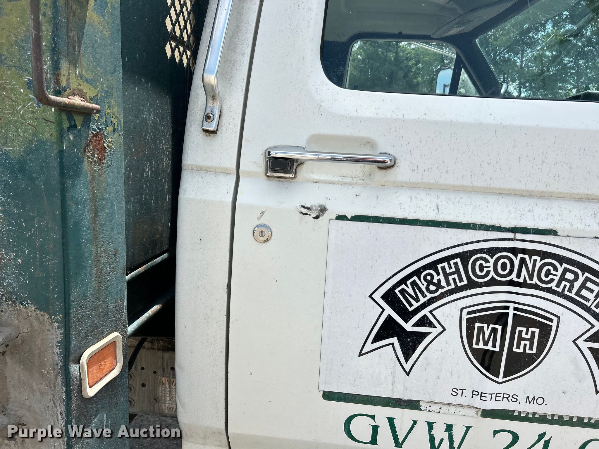 1998 Ford F700 flatbed truck. Miles: 112,923 on odometer, Hours: 8,480 on meter, VIN: 1FDNF70J2WVA19520. Engine Displacement: 7.0L, Cylinders: 8, Fuel type: Gas. Transmission Automatic. Chassis Axles: Single, Suspension: Spring, Brakes: Electric over hydraulic, PTO, GVWR: 26,000 lbs, Wheelbase: 189". Interior AC, heat. Features Dump flatbed 18' 6" L x 96" W, Ram: Single. Tires Front: 275/80R22.5, Rear: 10R22.5. Notes Contents of bed will be removed prior to auction, Dash warning indicator: Brake, Rear brake issues, Unknown operating condition of PTO. Missouri title. Title distribution may be delayed up to 14 days from verification of funds. M&H Concrete Contractors Inc.. St. Peters, MO 63376