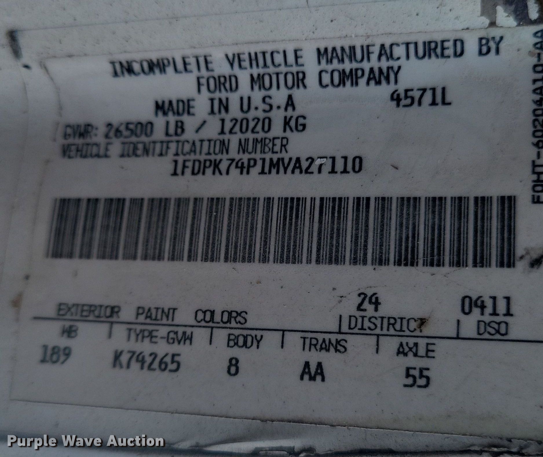- VIN: 1FDPK74P1MVA27110