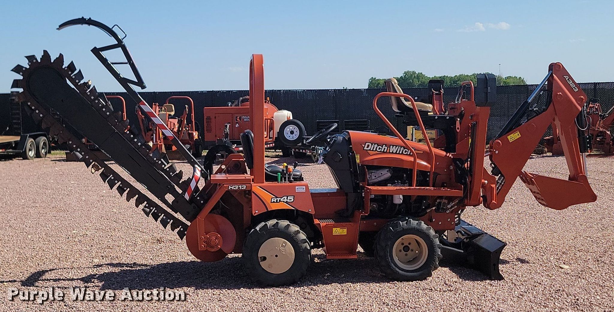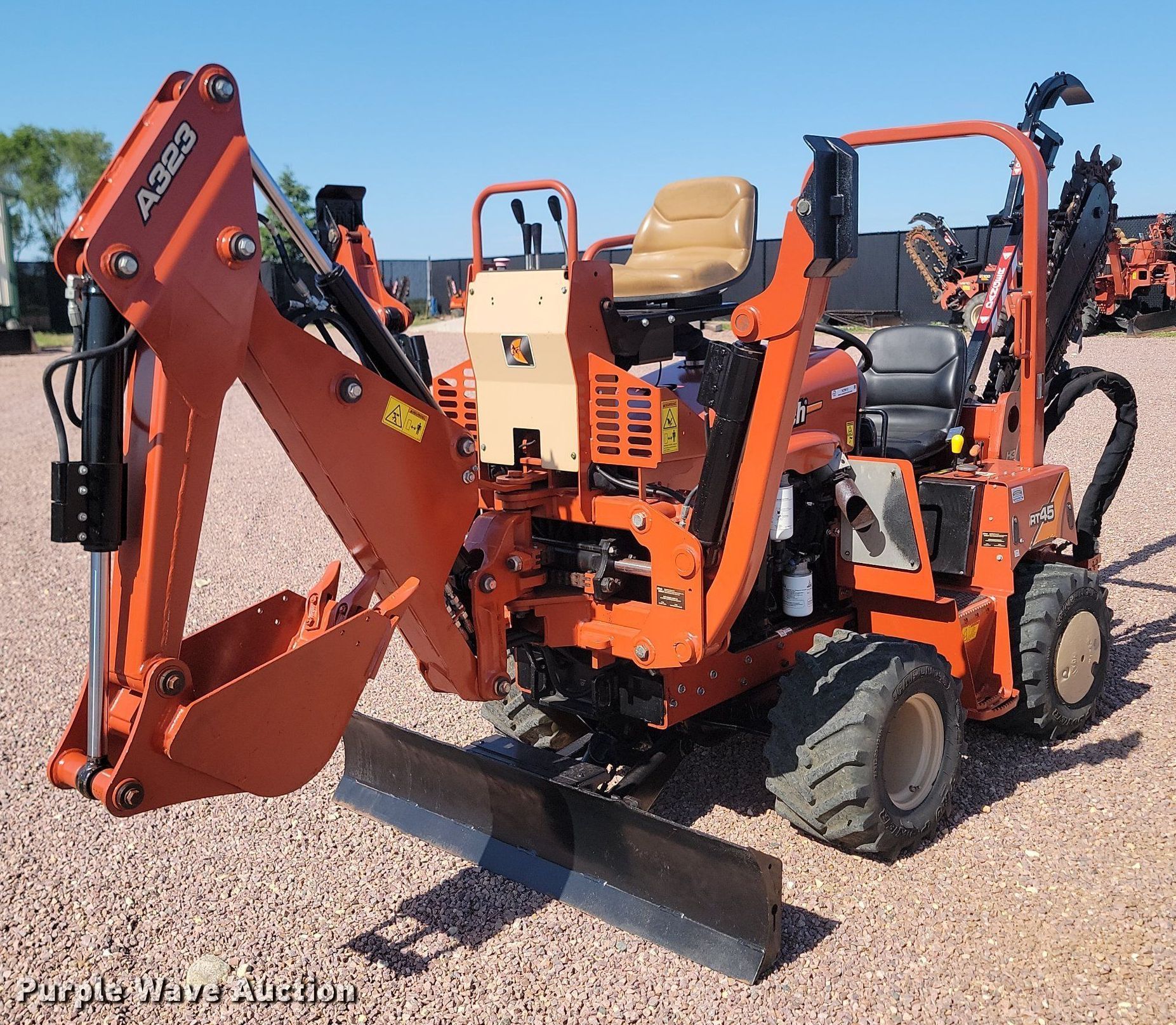 2018 Ditch Witch RT45 trencher. Hours: 724 on meter, Serial: DWPRT45XPJ0004083. Engine Deutz D2.9 L4, Displacement: 2.925, Cylinders: 4, Fuel type: Diesel. Transmission Hydrostatic, Four wheel drive, Four wheel steer. Operators station OROPS. Features Trencher Model: H314, Serial: DWPH313XZVJ0002269, Estimated dig depth: 93", Cutting width: 5", Teeth: Rock, Dirt, Manual crumber, Backhoe Model: A323, Serial: DWPA323XCJ0000186, Bucket width: 12", Teeth: 3, Backfill blade Width: 64". Tires Size: 26x12.00-12, Foam Filled, Wheel weights: 2. Pristine Machinery LLC. Parker, SD 57053