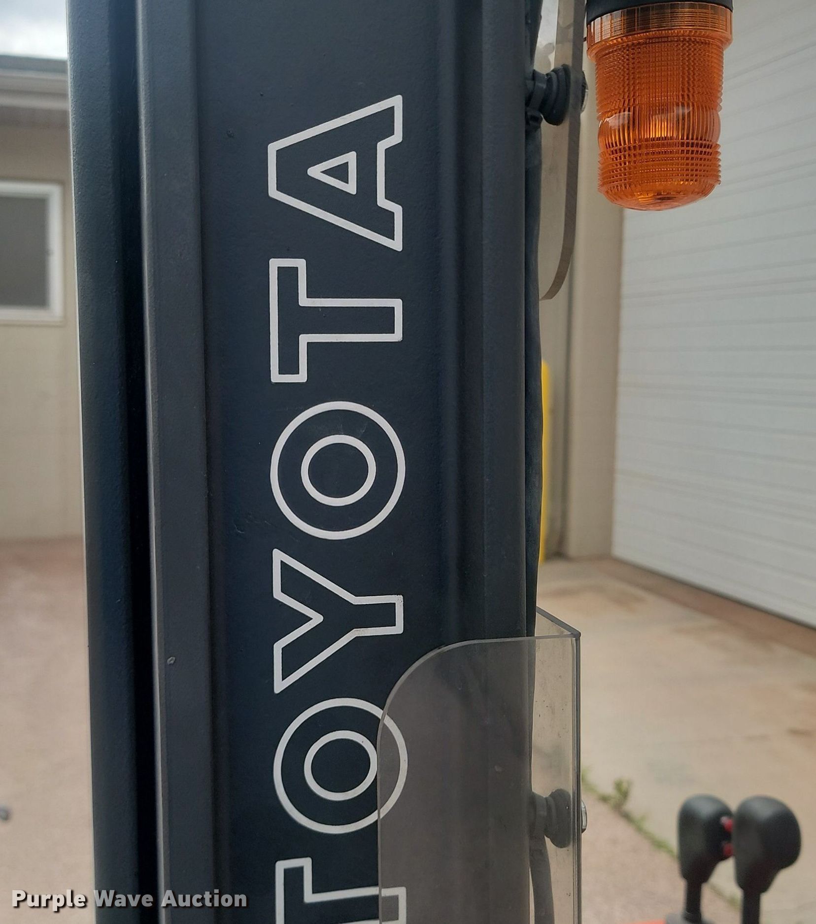 Toyota 6BWR15 order picker. Serial: 6BWR15-31249. Electric Motor Volts: 24, Charger: Single phase. Transmission Hydrostatic. Features Maximum lift capacity: 2,750 lbs, Maximum lift height: 100", Mast stages: 2, Side shift, Mast tilt, Fork length: 49". Rapid City, SD 57702