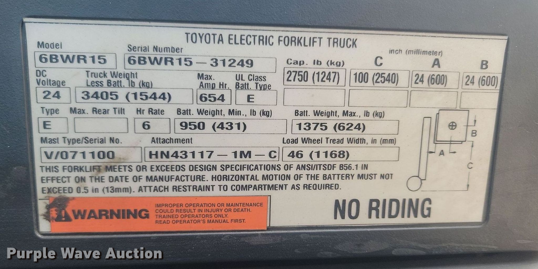 Purple Wave is selling a used Warehouse Forklift in South Dakota. This item is a Toyota 6BWR15 order picker with the following: Serial: 6BWR15-31249