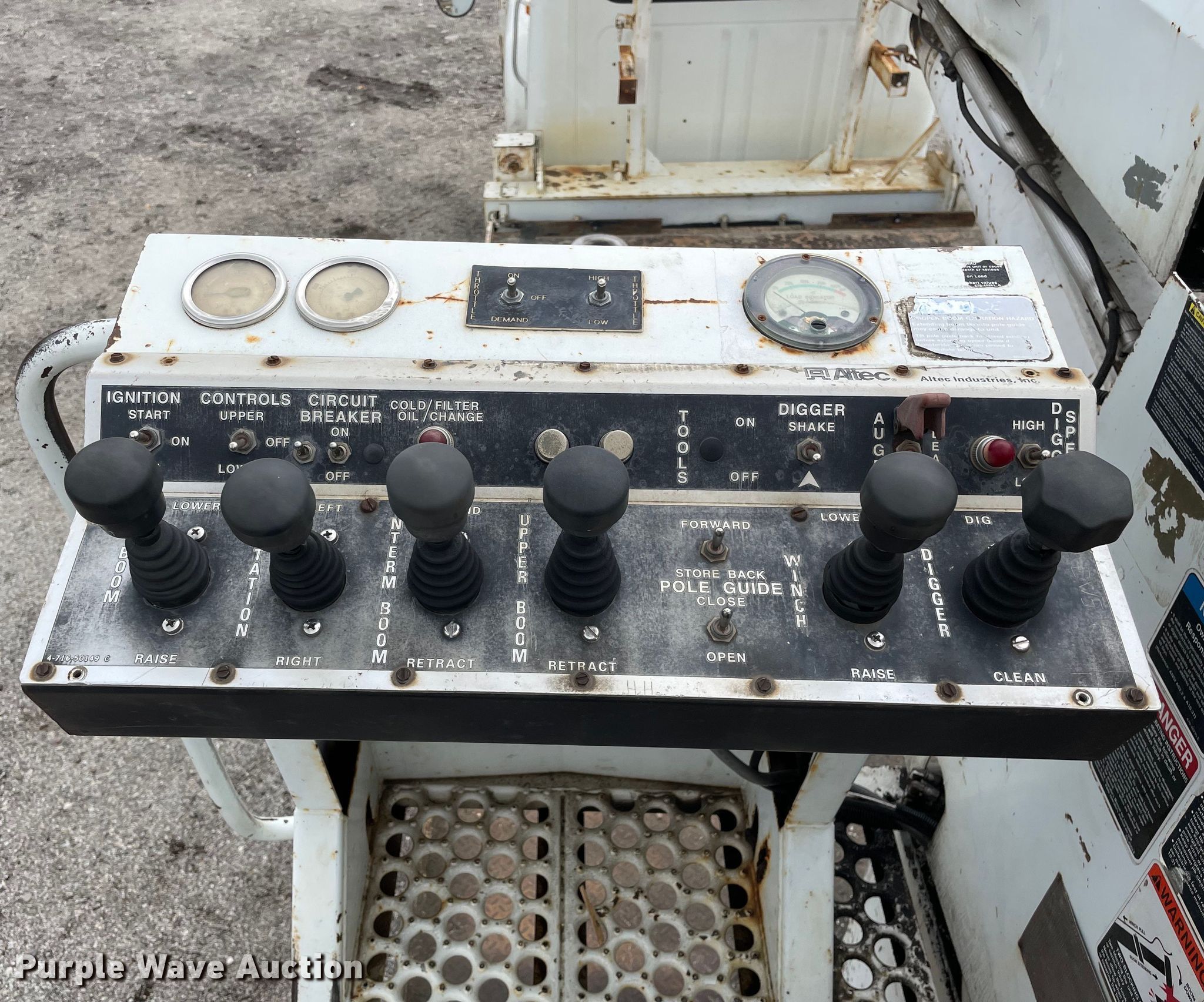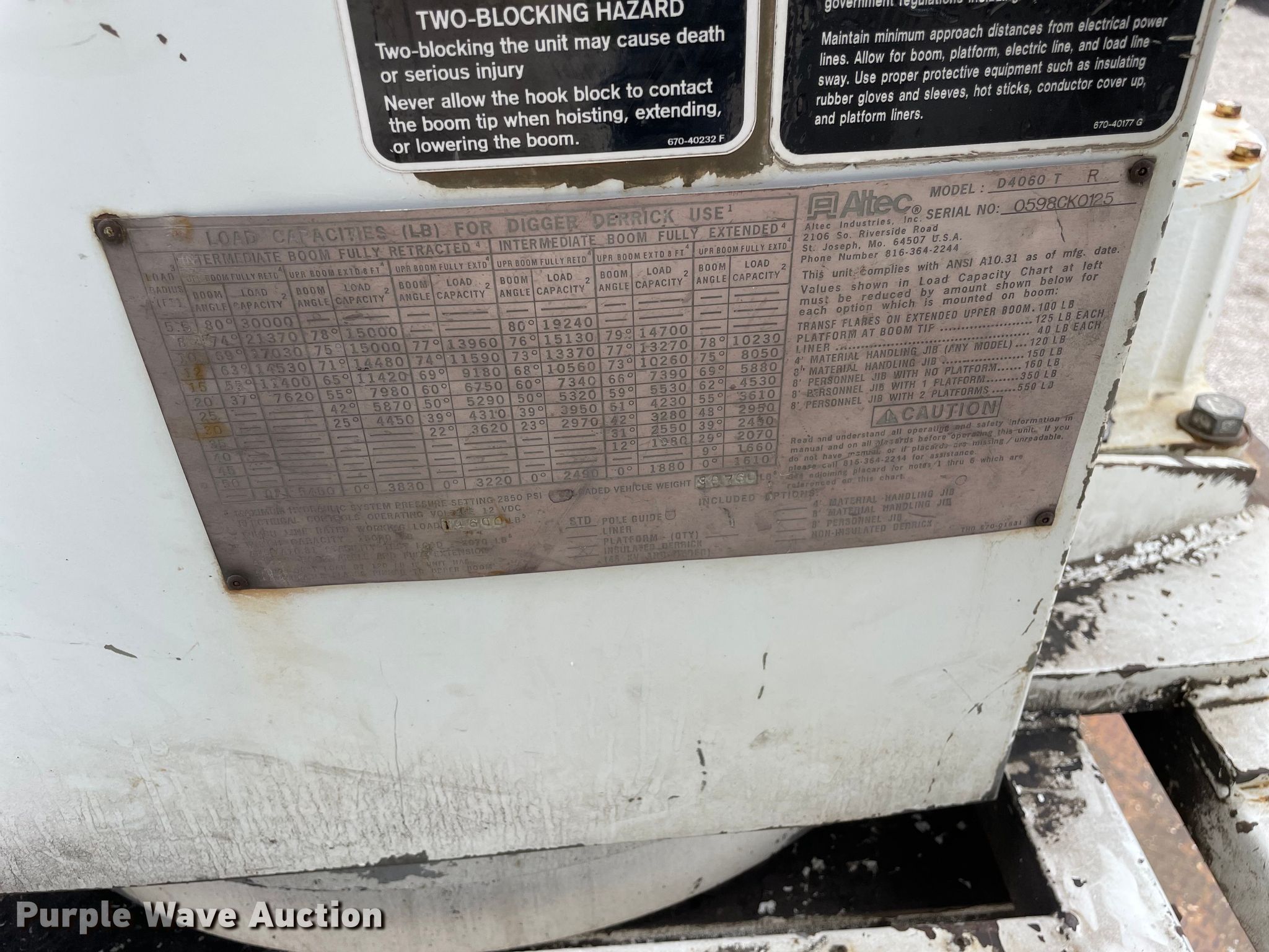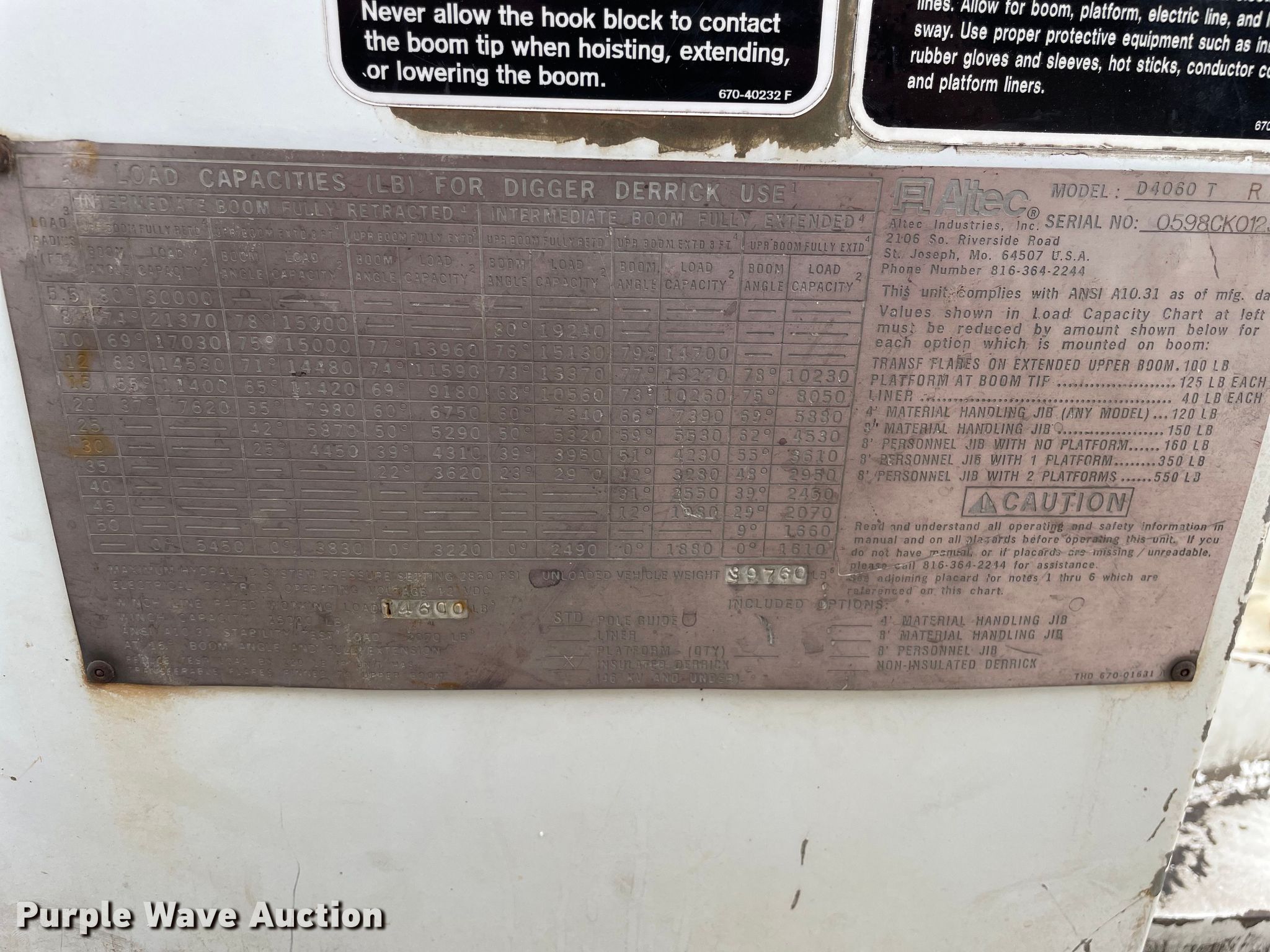 1998 International 2554 digger derrick truck. Miles: 66,538 on odometer, Hours: 10,834 on meter, VIN: 1HTGCADR8WH589316, Unit #: 71. Engine International DT530, Cylinders: 6, Fuel type: Diesel. Transmission Automatic. Chassis Axles: Tandem, Suspension: Spring over walking beam, Brakes: Air, PTO. Interior Heat, Cruise control, Brake controller. Features Bed Altec, 17' 6" L x 93" W, Boom Altec D4060T, Serial: 0598CK0125, Mast height: 60', Boom type: Insulated, Telescopic, Boom controls Ground, Platform/ basket, Material handler, Pole guide, Auger. Tires Size: 11R24.5. Notes Auger bit missing, Hydraulic valve body issues Possible solenoid issues. Illinois title. Title distribution may be delayed up to 14 days from verification of funds. Hecker & Company. Aurora, IL 60502